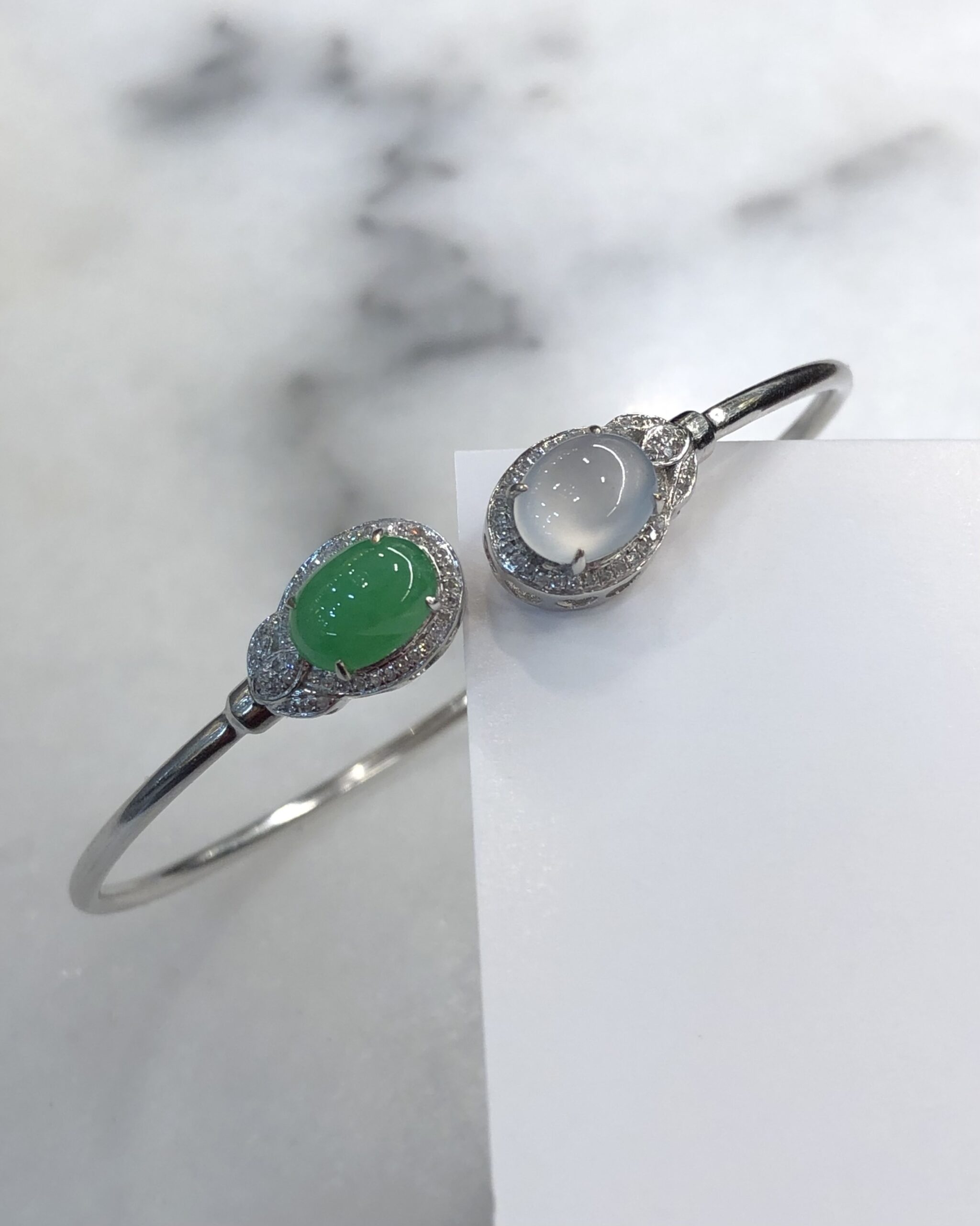 Elevate your jewellery collection with this exquisite open bangle, showcasing a harmonious pairing of two exceptional jadeite cabochons. One side features a vibrant green jade, while the other highlights an icy-clear, glassy variety jade cabochon, prized for its strong luminosity and remarkable translucency. Each gemstone is gracefully accented with natural diamonds, adding a refined sparkle that enhances the jadeite’s beauty. Clarity for both gemstones is excellent with no cracks or any significant inclusions to note. Expertly crafted in 18K white gold, the bangle features an elegant open-ended design that provides both comfort and versatility, making it suitable for all wrist sizes. Modern yet timeless, this piece is a captivating blend of purity, colour, and luxury—perfect for elevating everyday style or complementing special-occasion ensembles.