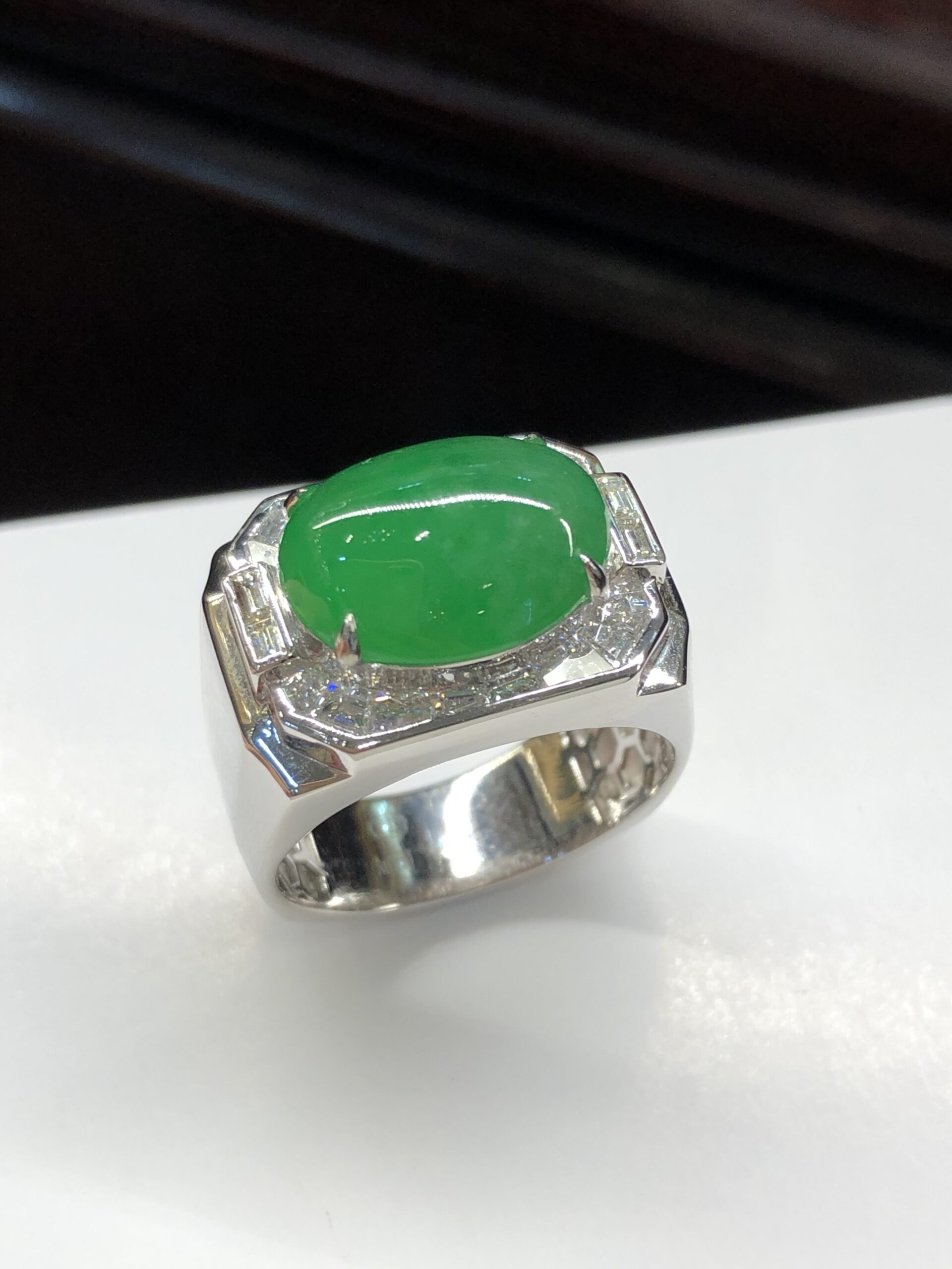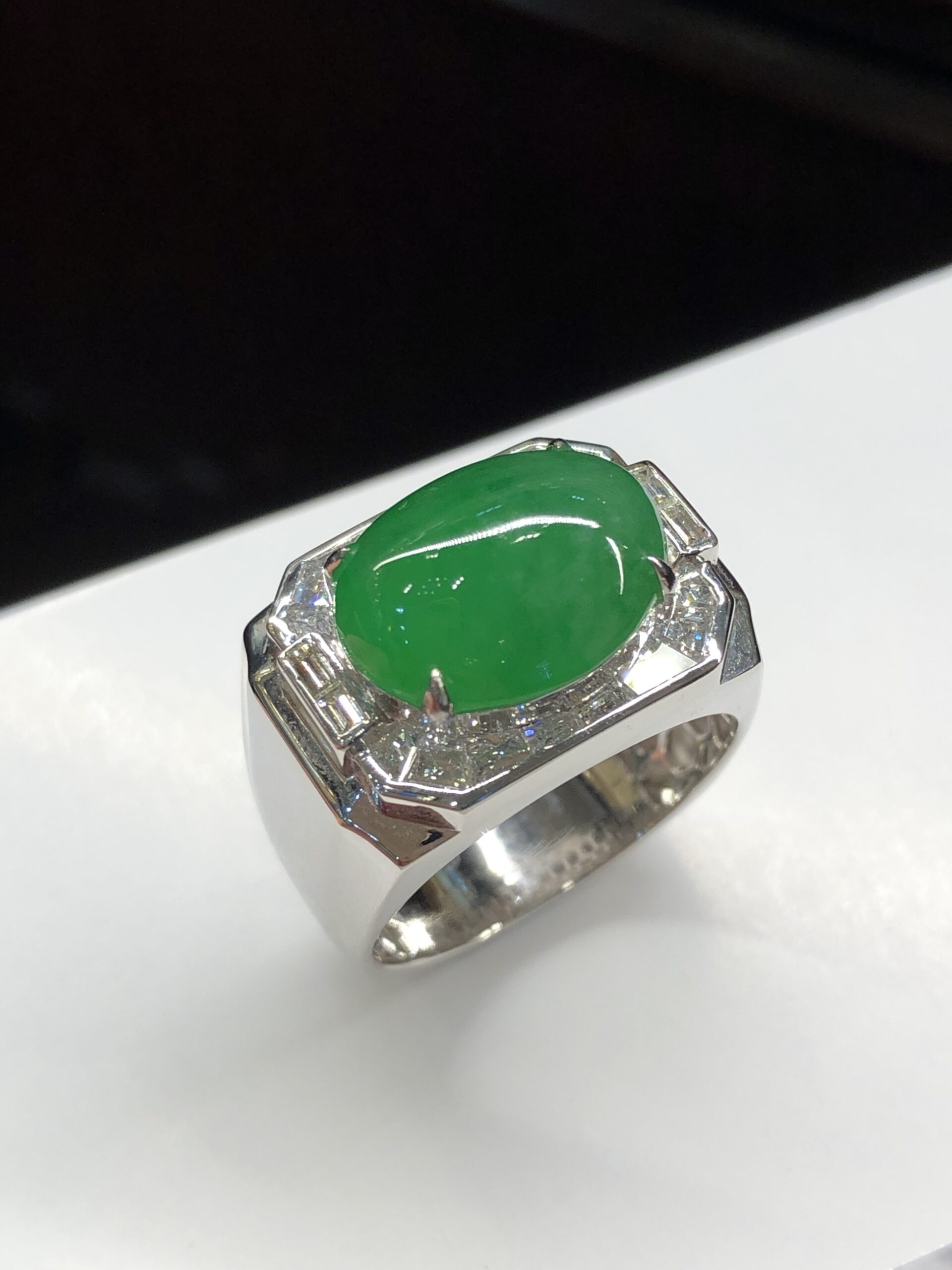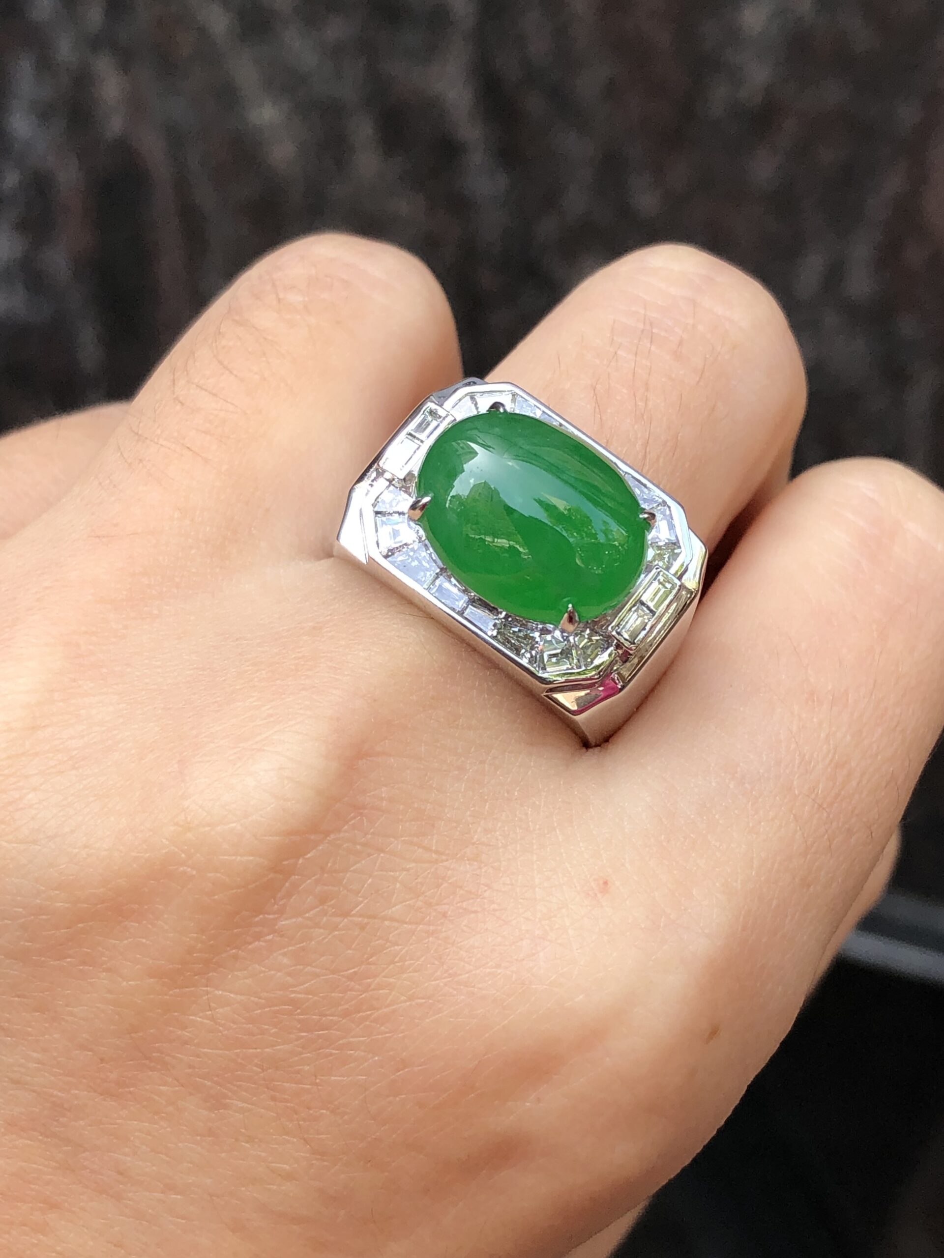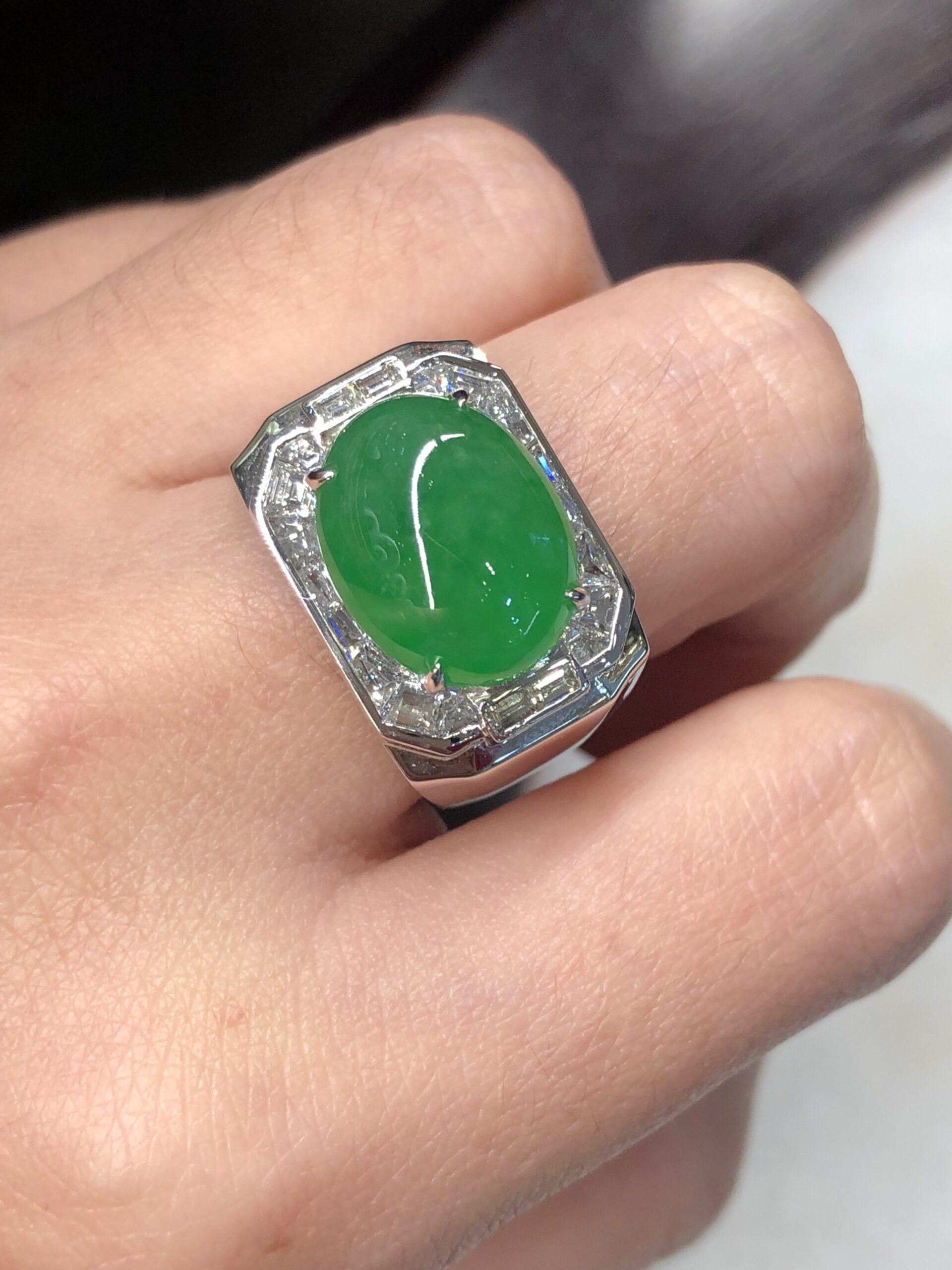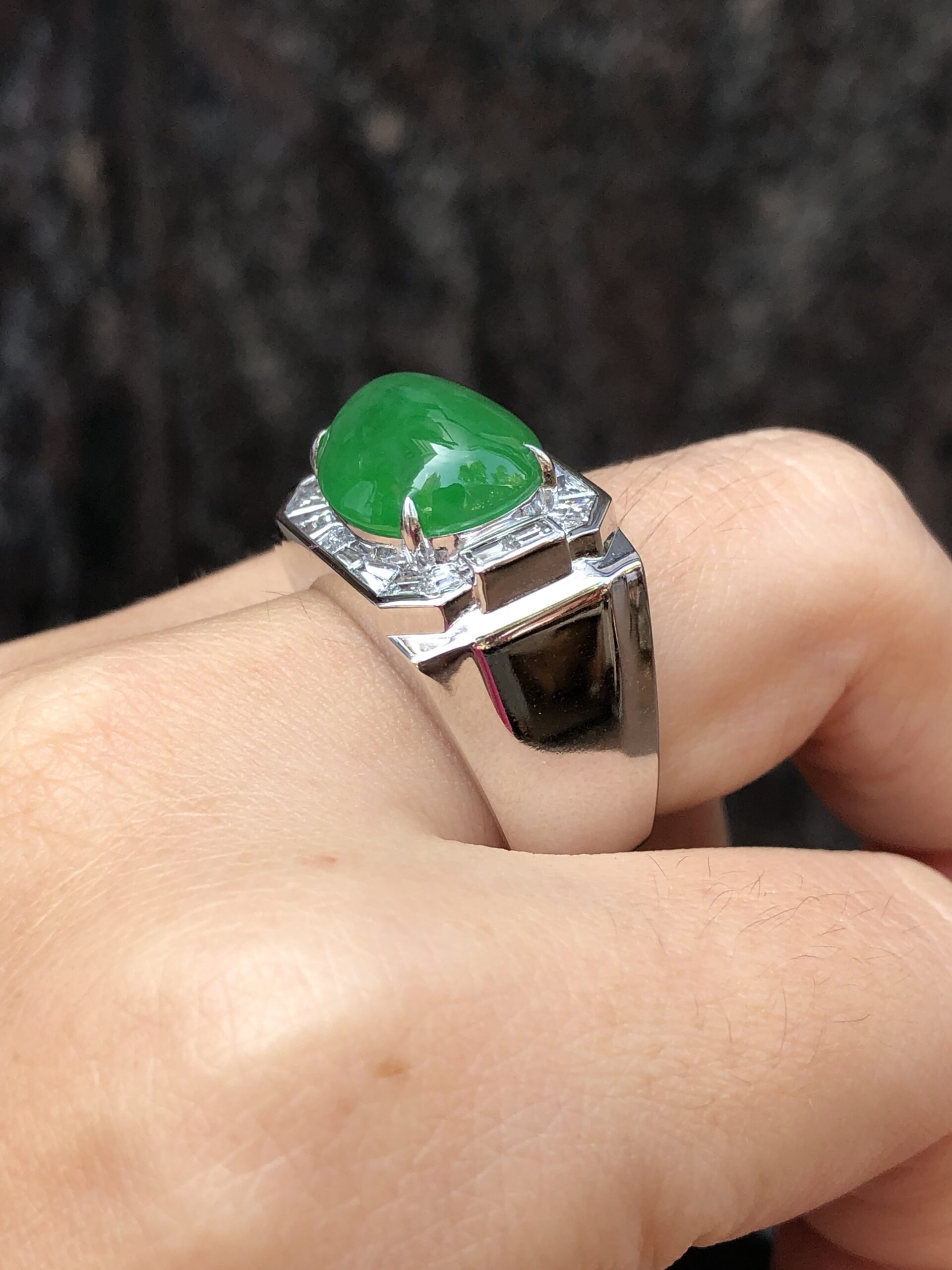 Grade A green jade cabochon ring with excellent lustre and translucency. This jadeite has a vibrant and saturated green hue. Its premium quality is defined by its excellent lustre with rich water content and fine jade grains, giving the gemstone a glossy and smooth texture.