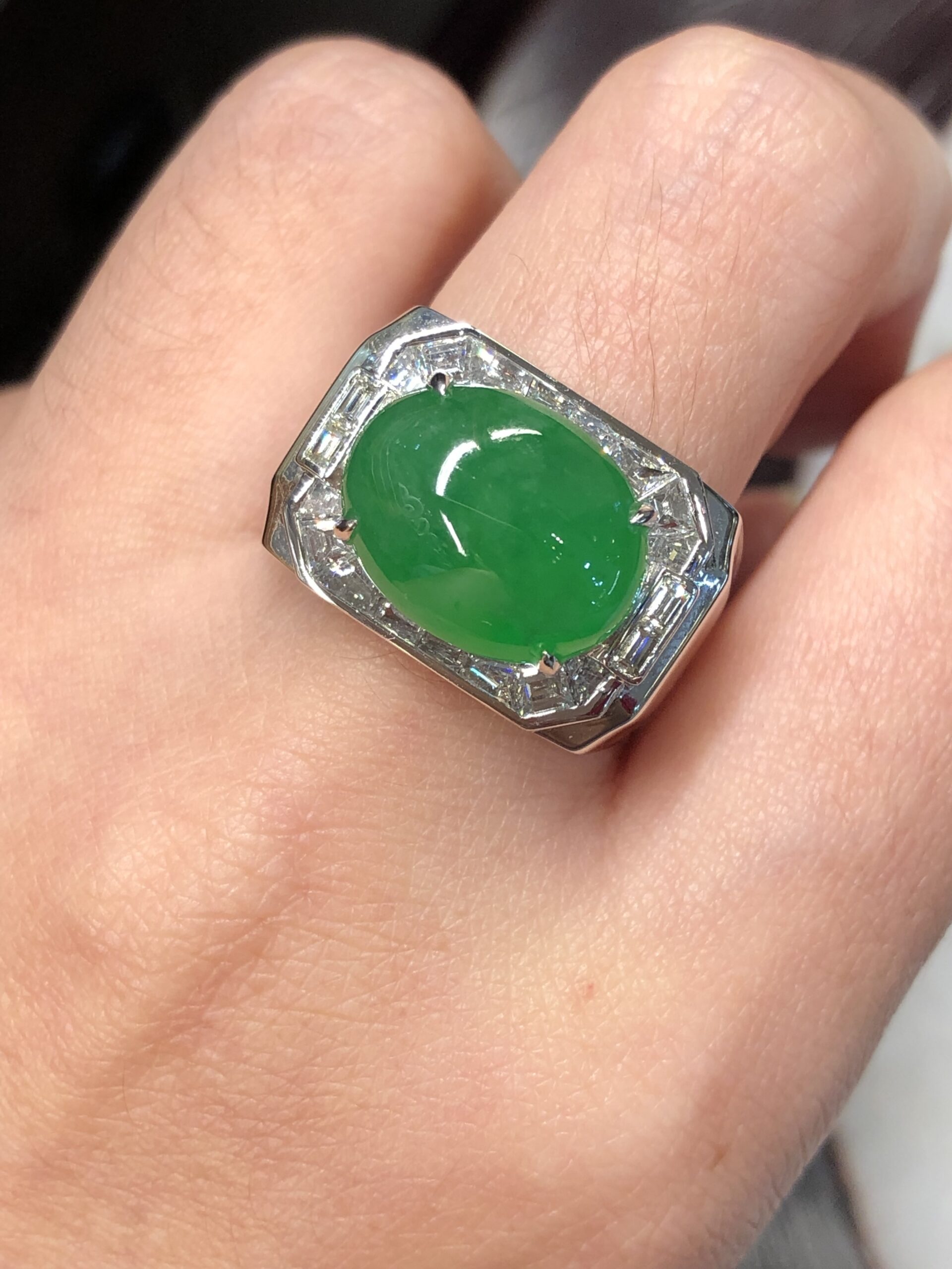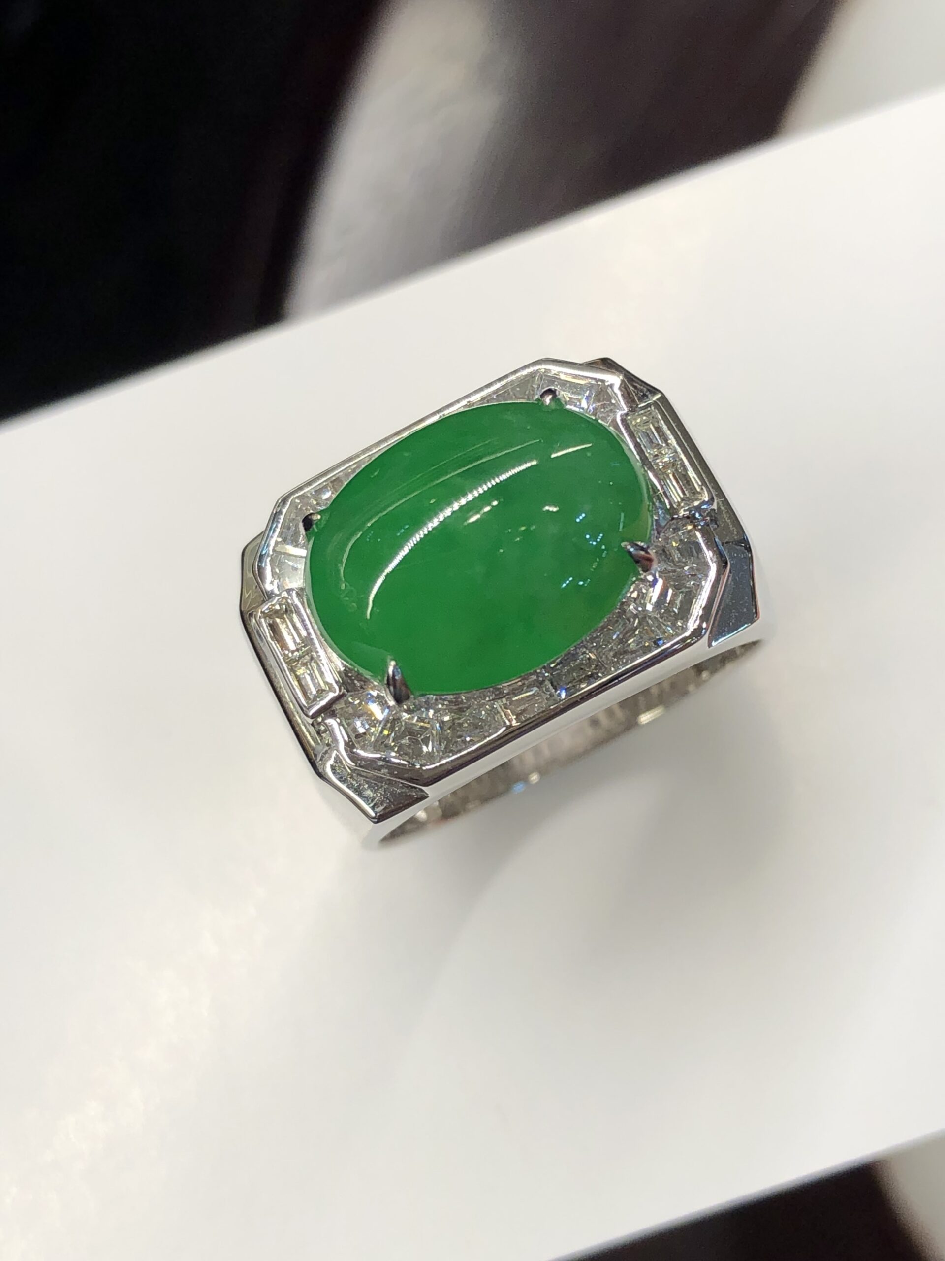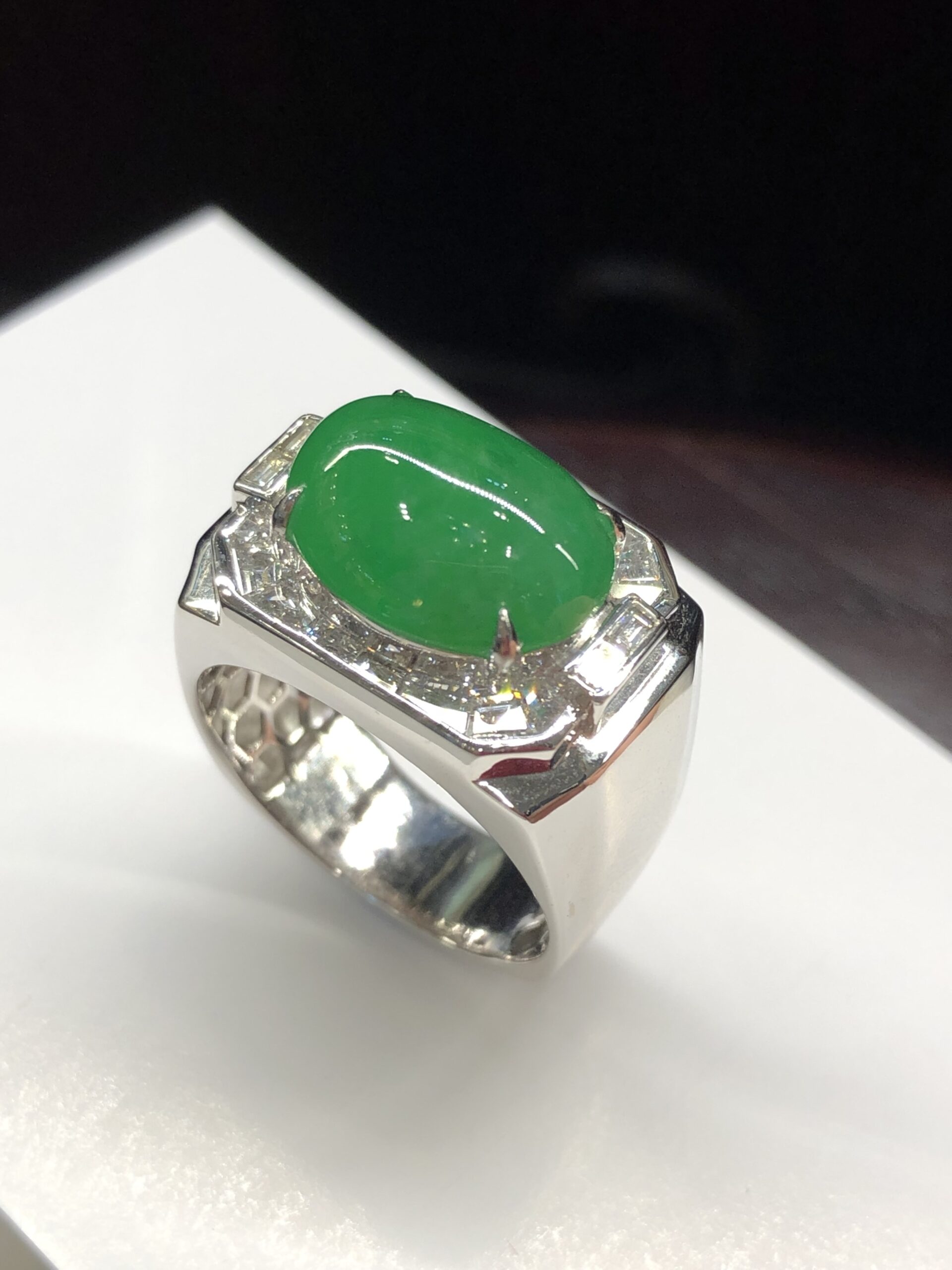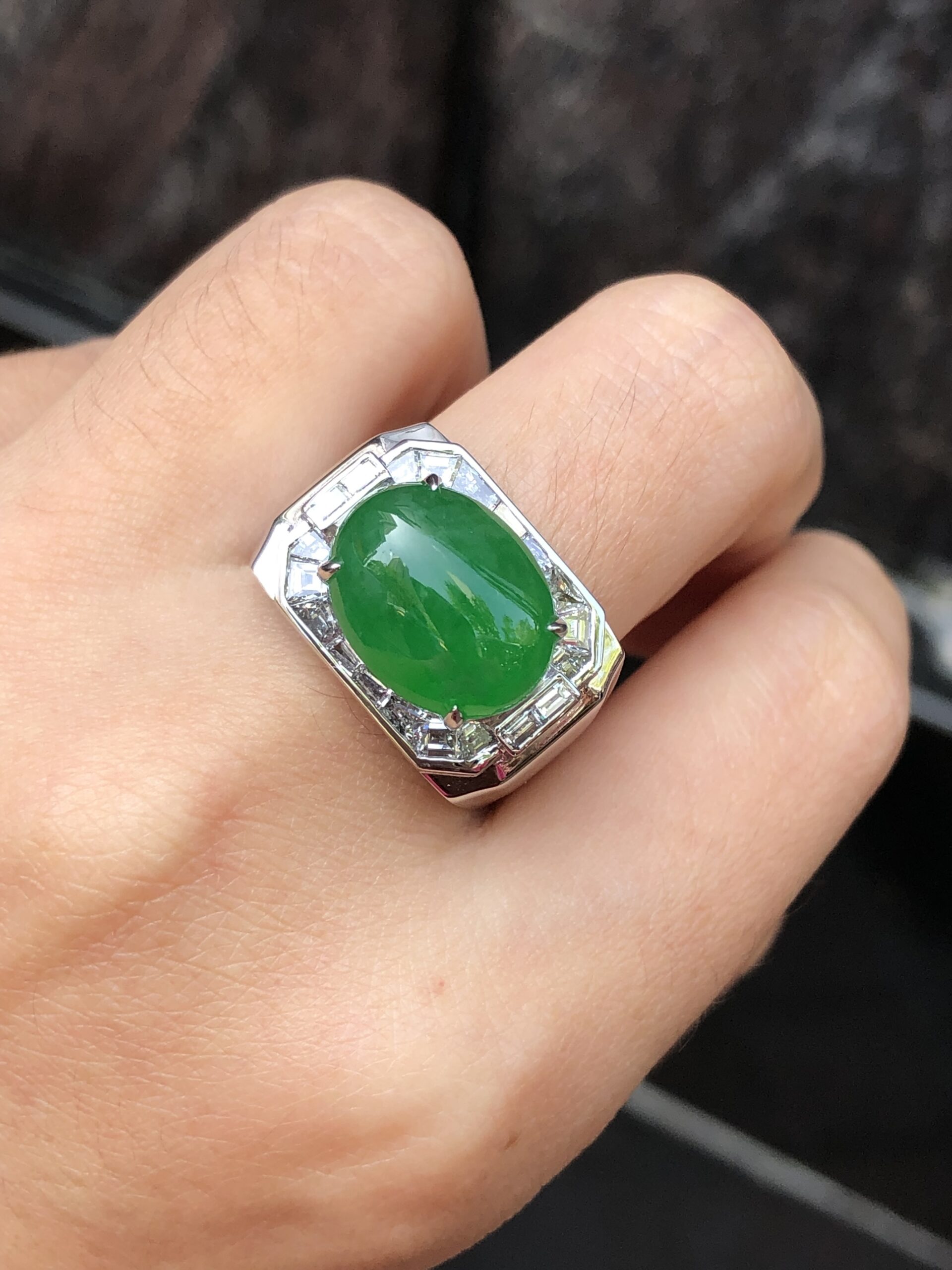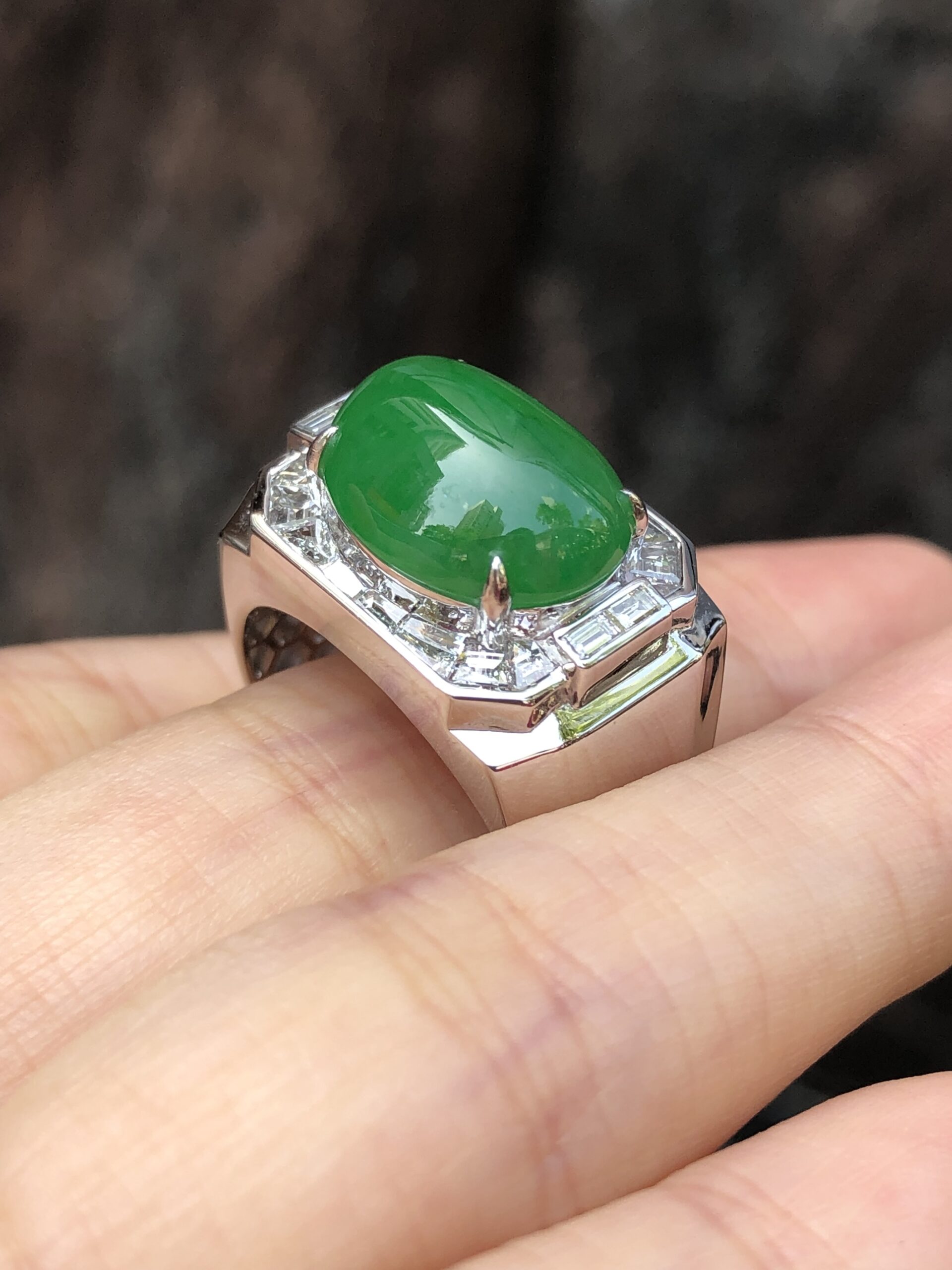 Grade A green jade cabochon ring with excellent lustre and translucency. This jadeite has a vibrant and saturated green hue. Its premium quality is defined by its excellent lustre with rich water content and fine jade grains, giving the gemstone a glossy and smooth texture.