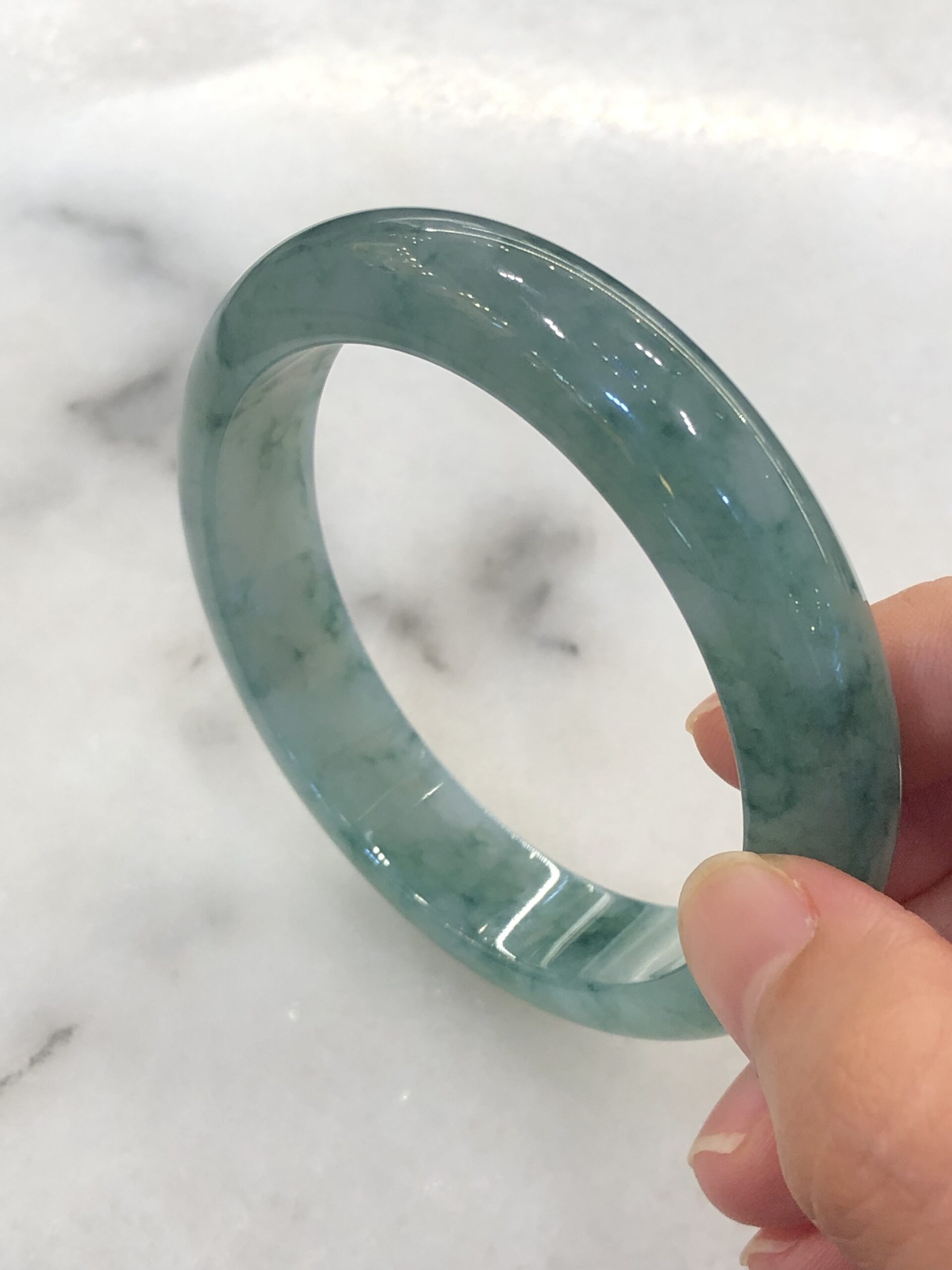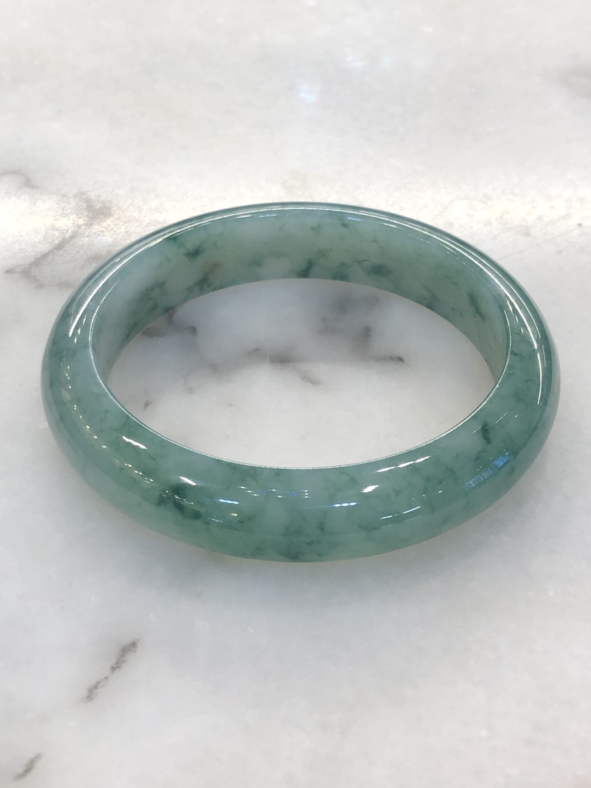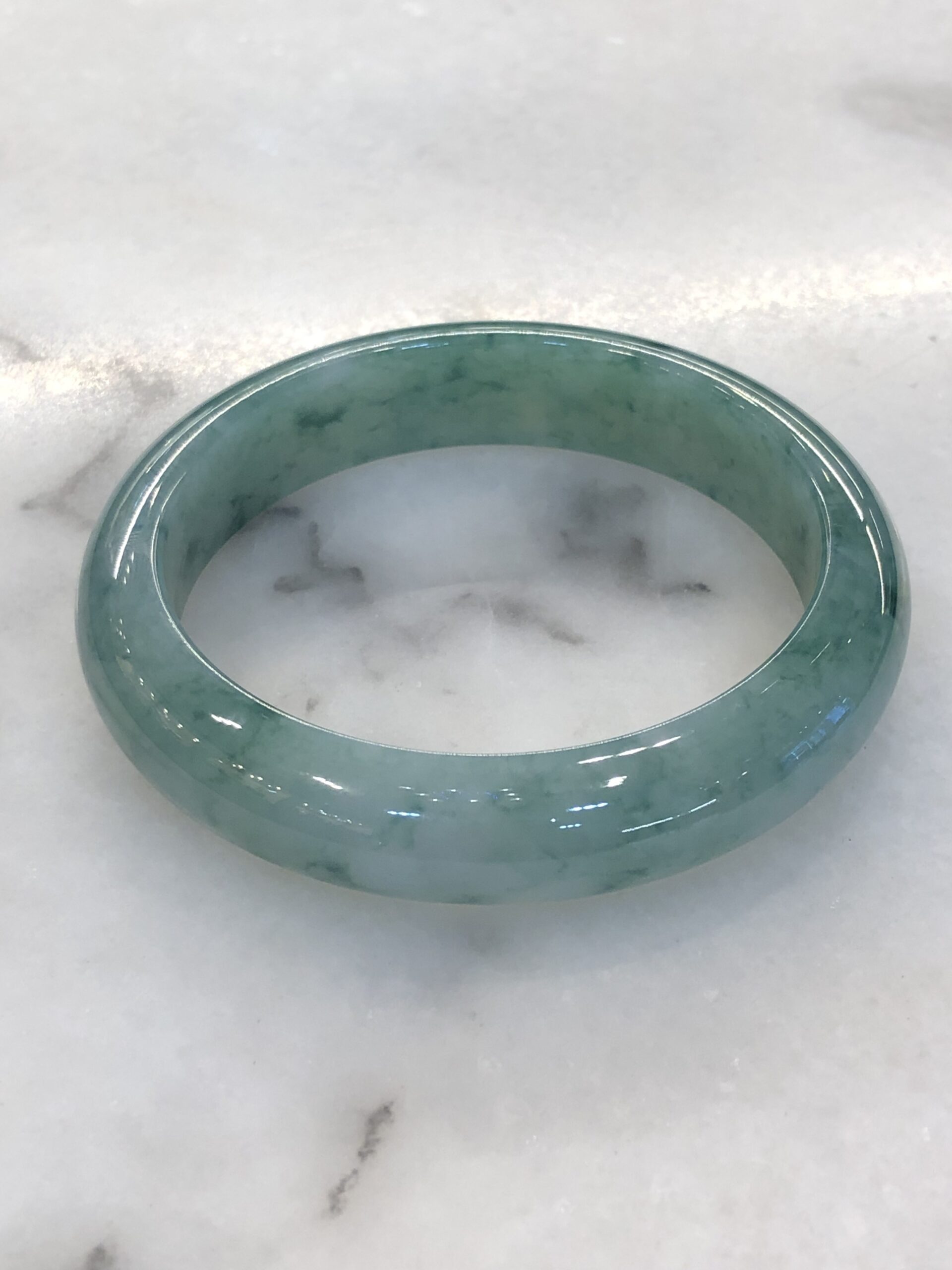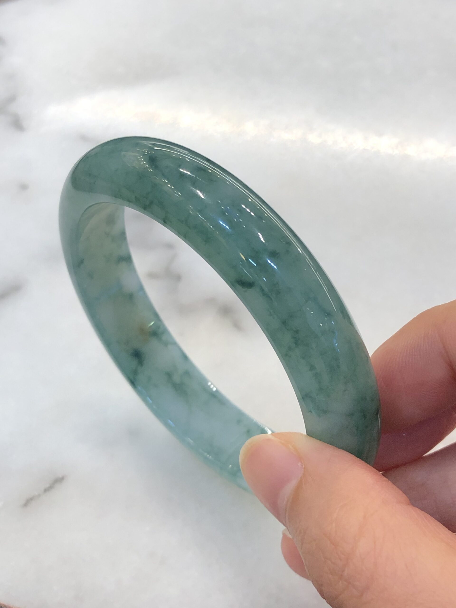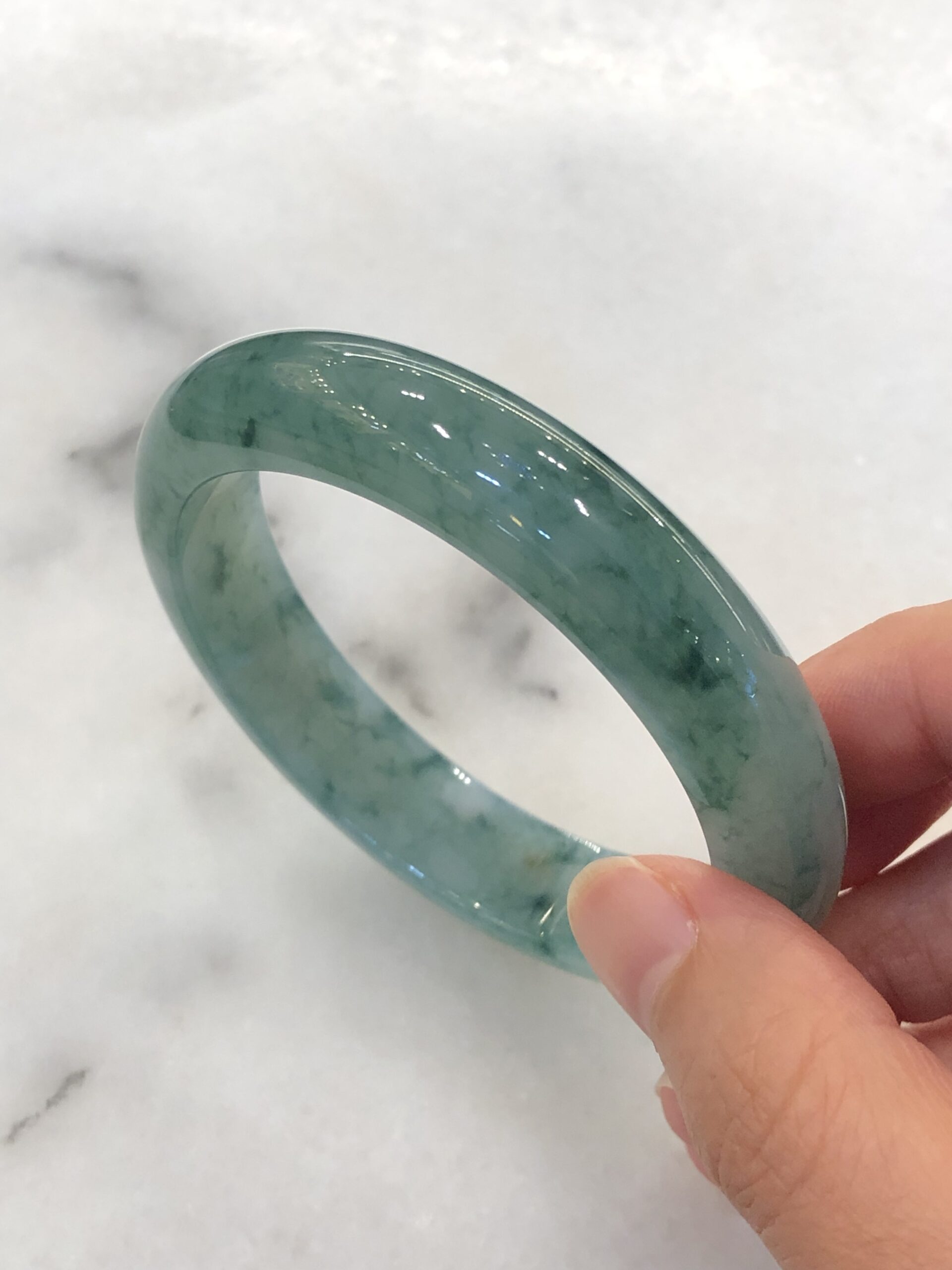 Grade A icy bluish green floral jade bangle with great lustre and translucency. The jade bangle has beautiful bluish green floral patterns against a clean base. The quality of the bangle is very good with fine jade grains, combined with smooth, jelly like texture. Lustre of the jadeite bangle is also very good with rich water content.