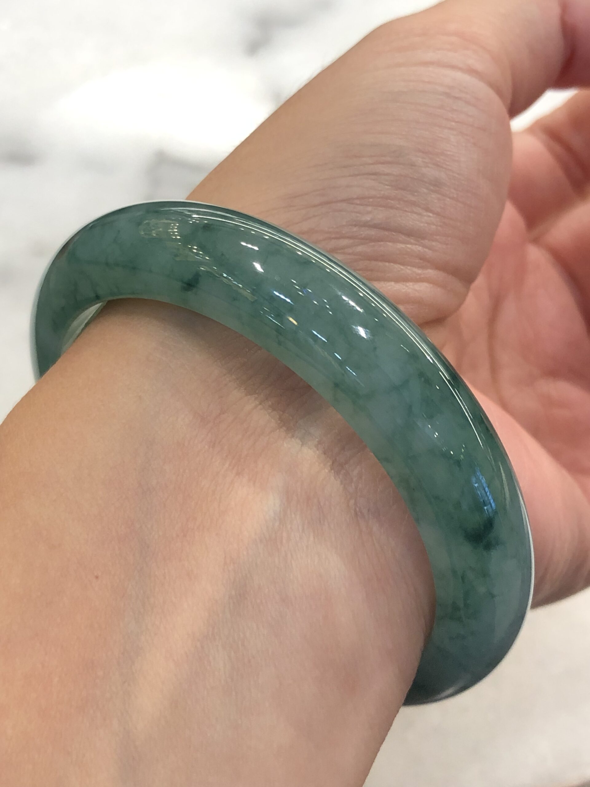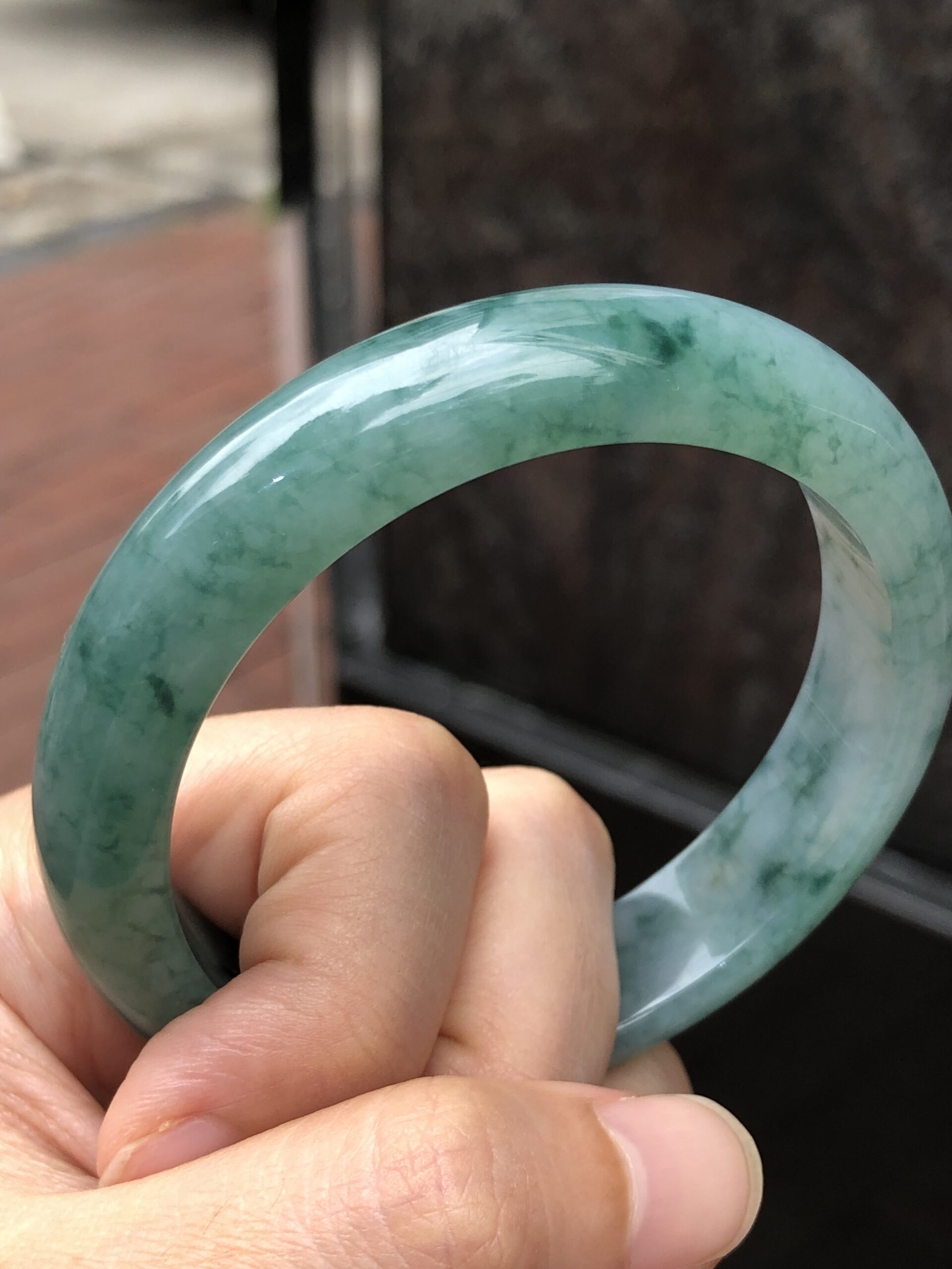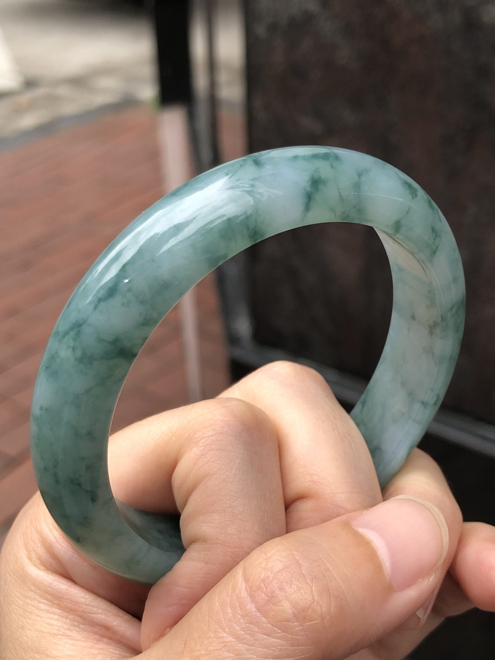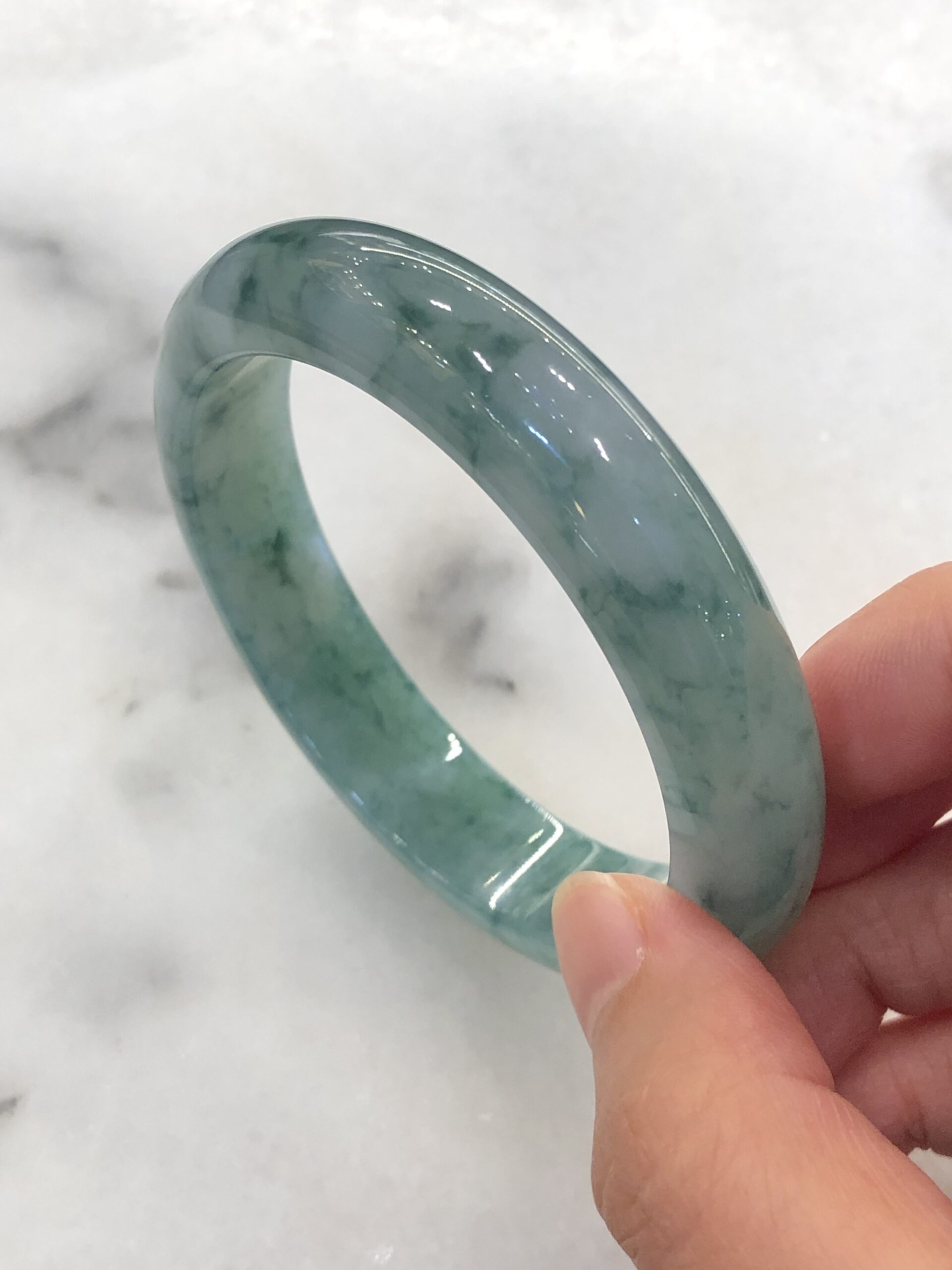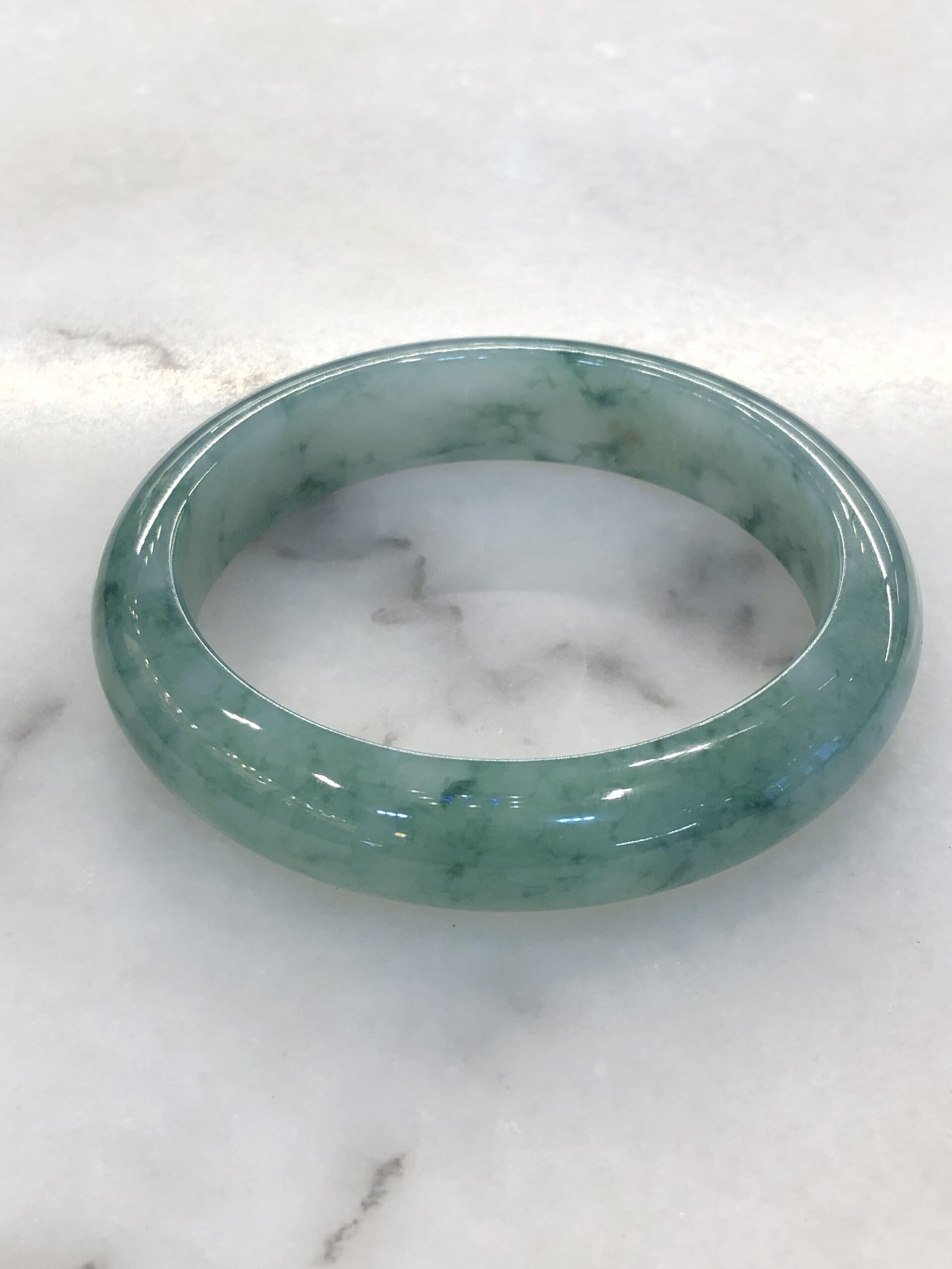 Grade A icy bluish green floral jade bangle with great lustre and translucency. The jade bangle has beautiful bluish green floral patterns against a clean base. The quality of the bangle is very good with fine jade grains, combined with smooth, jelly like texture. Lustre of the jadeite bangle is also very good with rich water content.