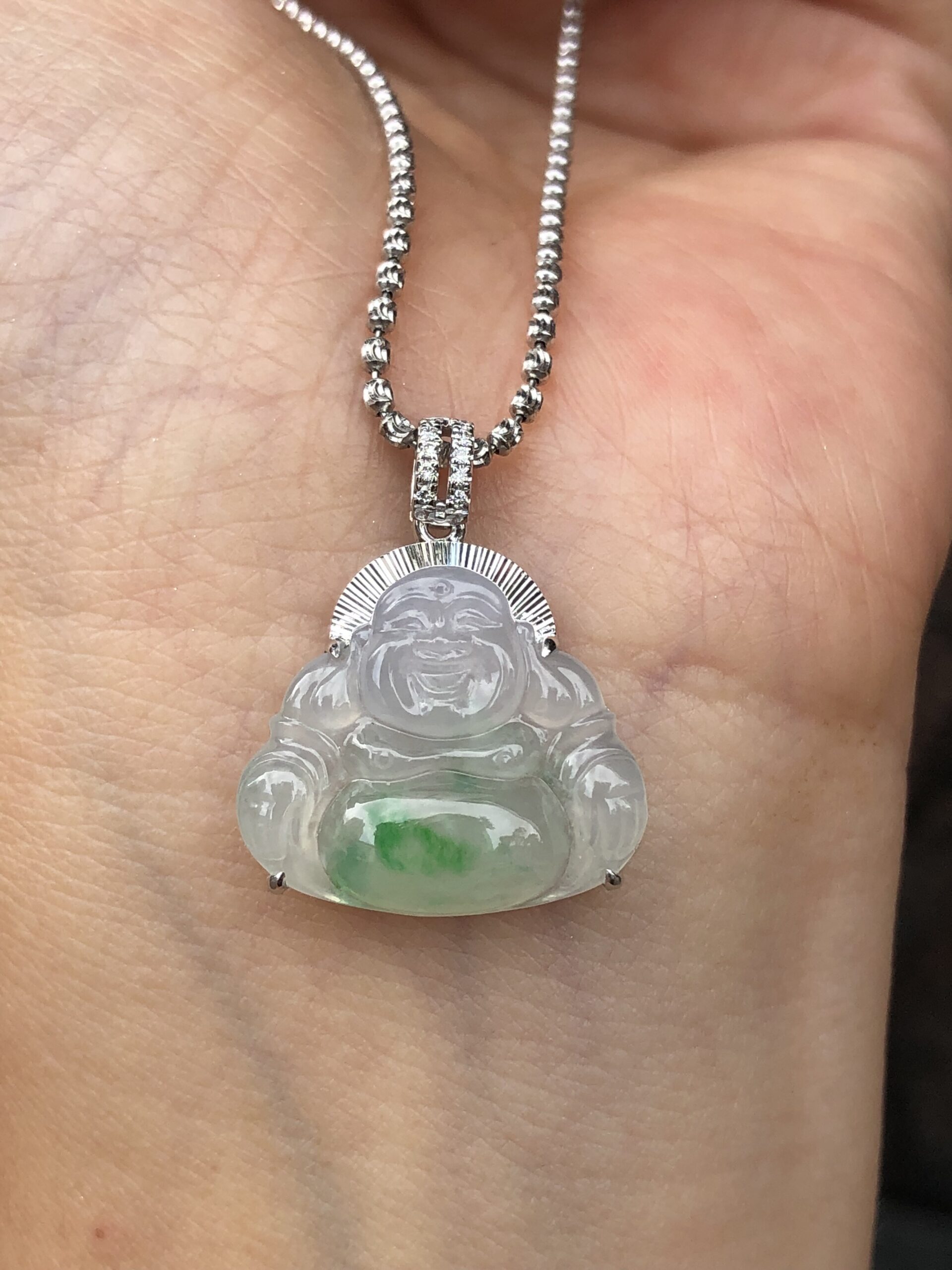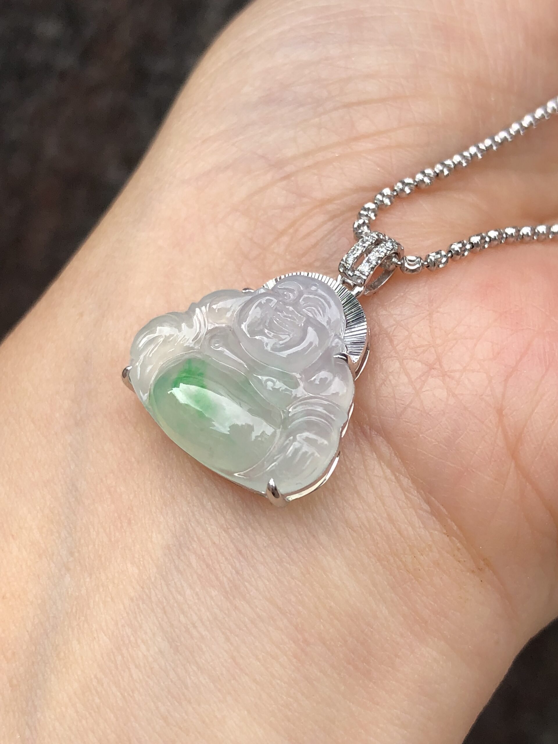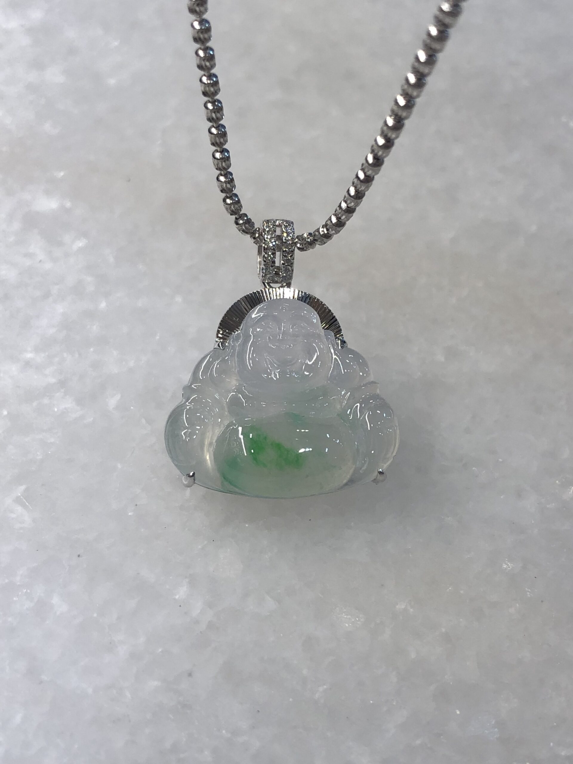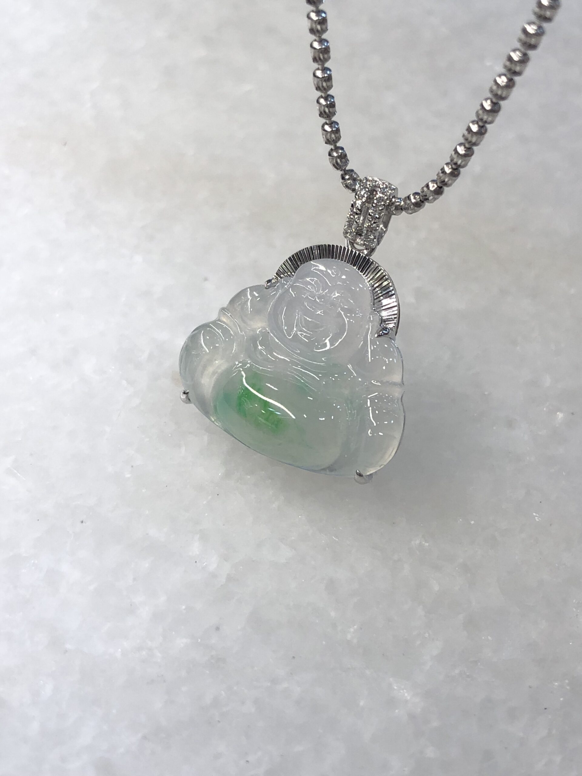 Meaning of wearing Buddha pendant: Laughing Buddha is known as Hotei among the Chinese and is considered very auspicious. His large protruding belly is symbolic of happiness, luck and prosperity. Wearing a jade Laughing Buddha pendant is believed to protect the person who wears it.