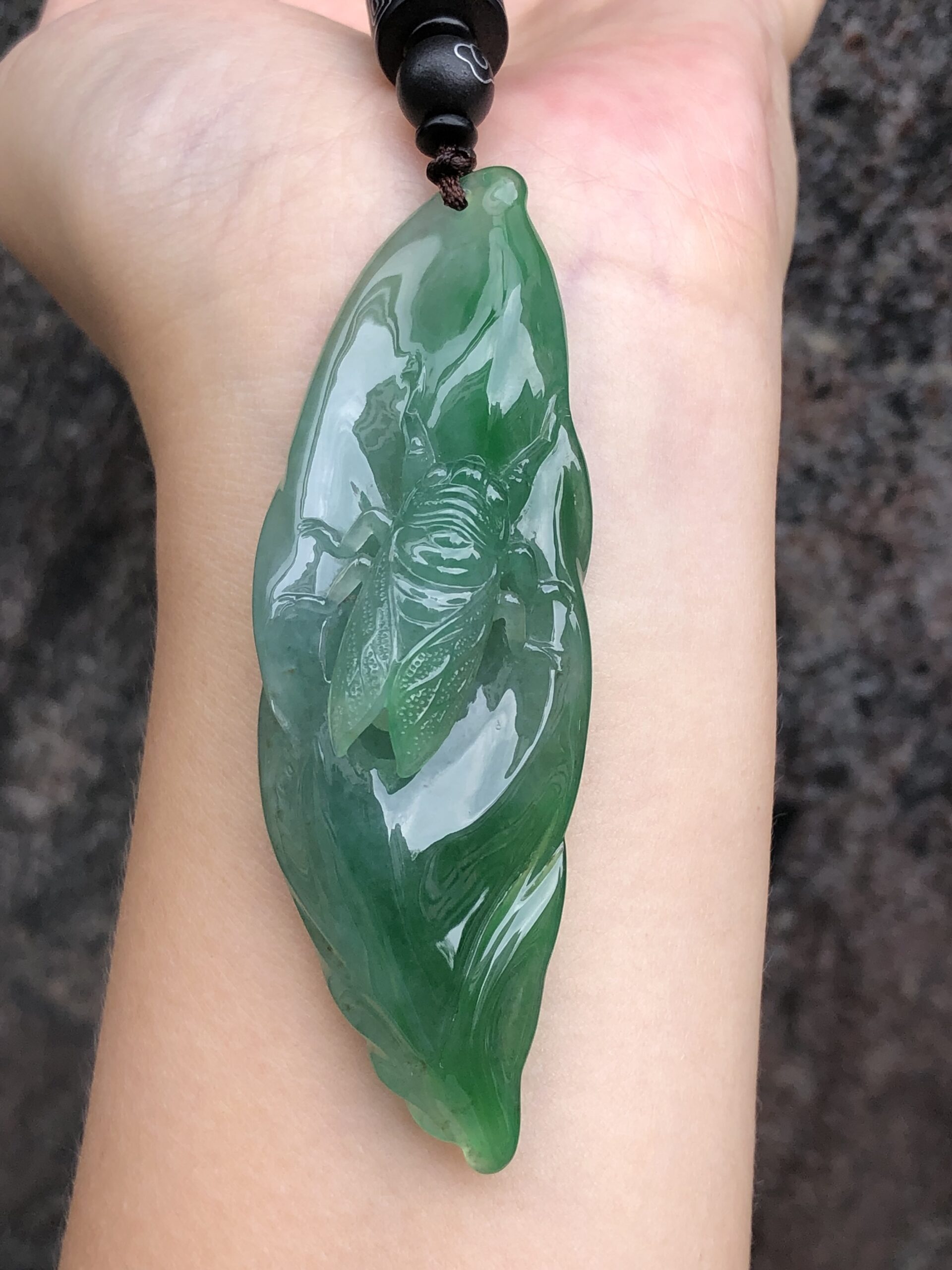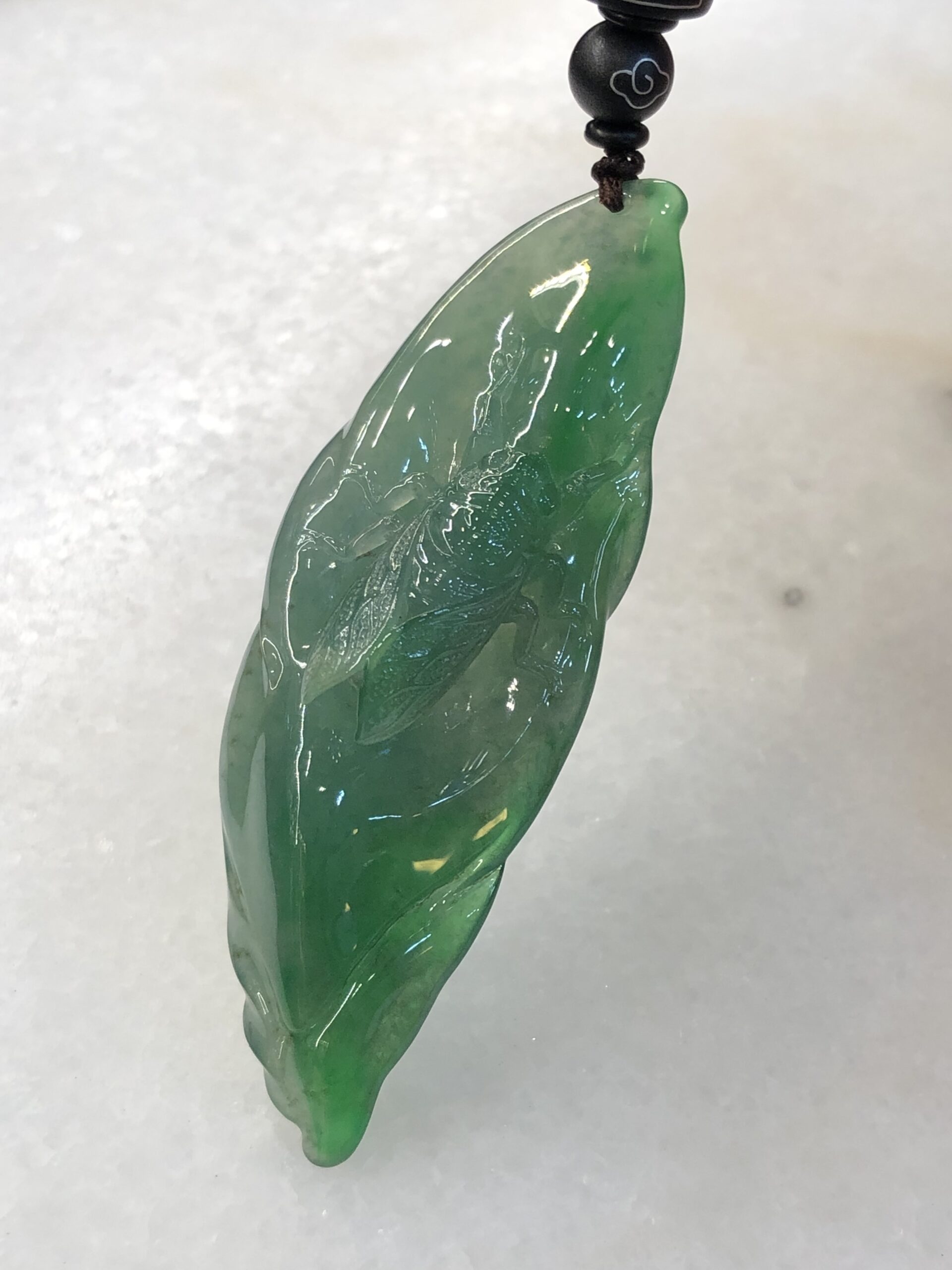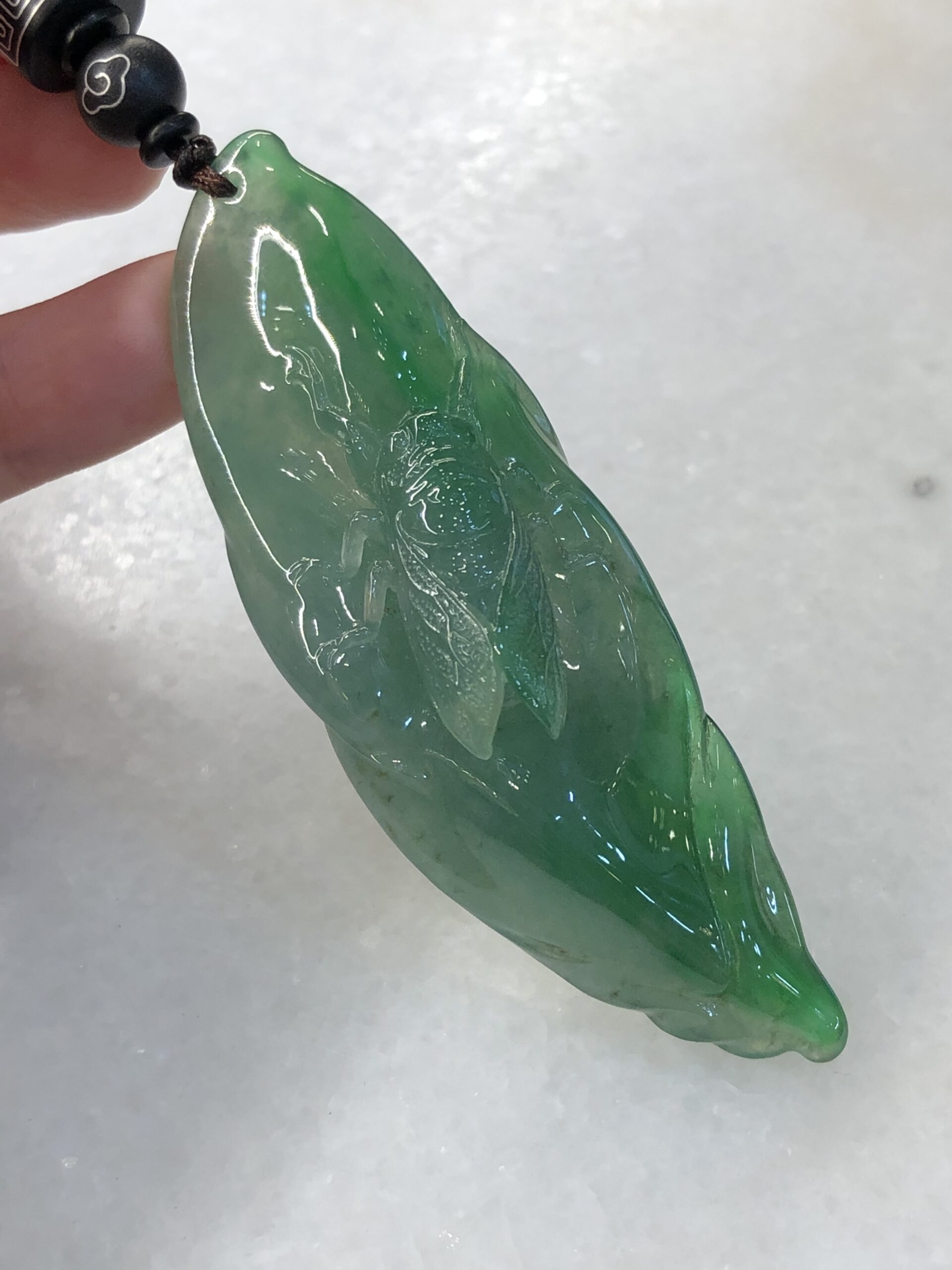Meaning of cicada on leaf: In Chinese culture, the cicada is revered as a symbol of rebirth, immortality, and protection from evil, while the leaf represents growth and renewal. Together, they embody the themes of transformation, vitality, and enduring prosperity — making this pendant not only a work of art but also a powerful talisman of good fortune.