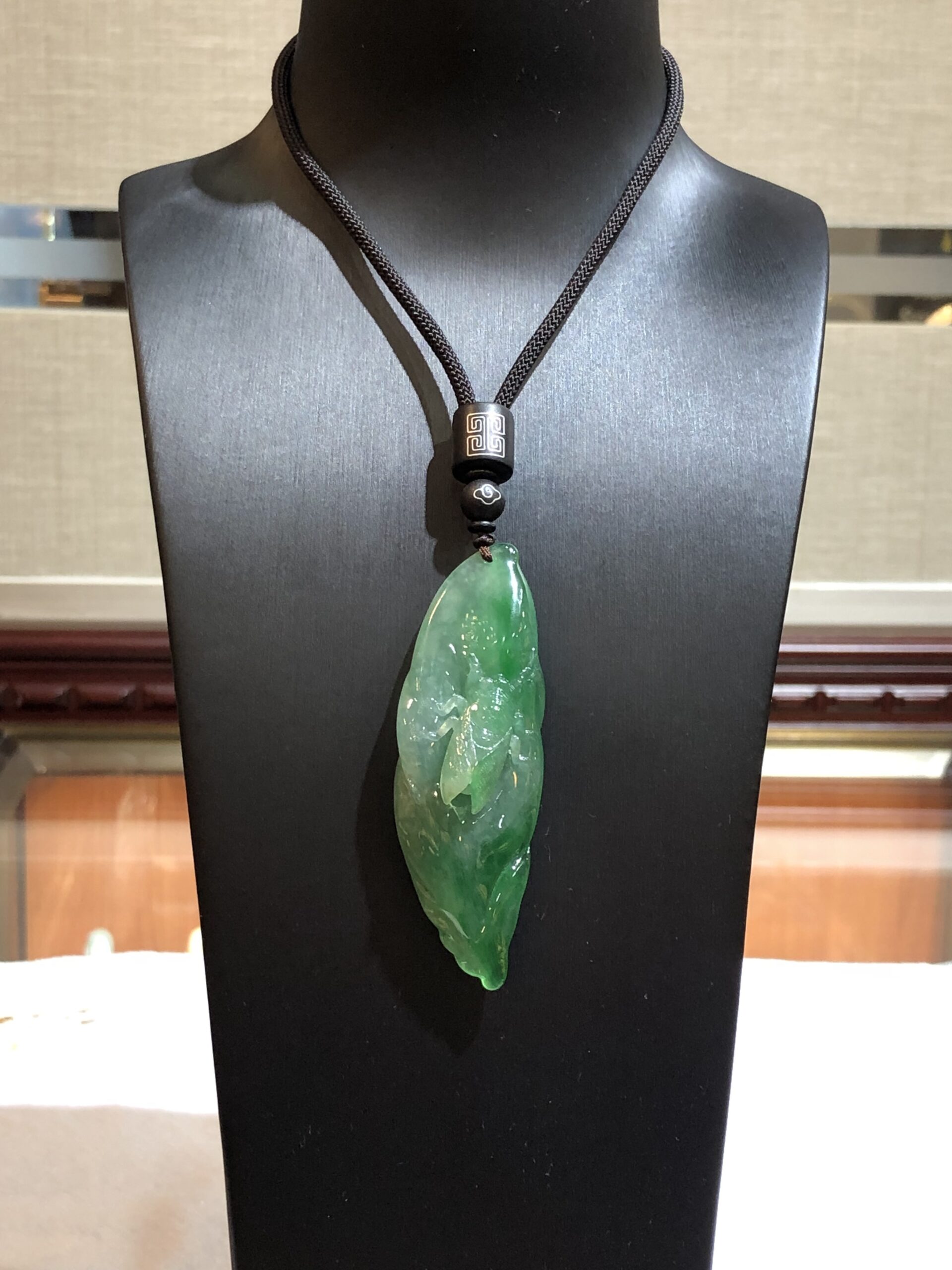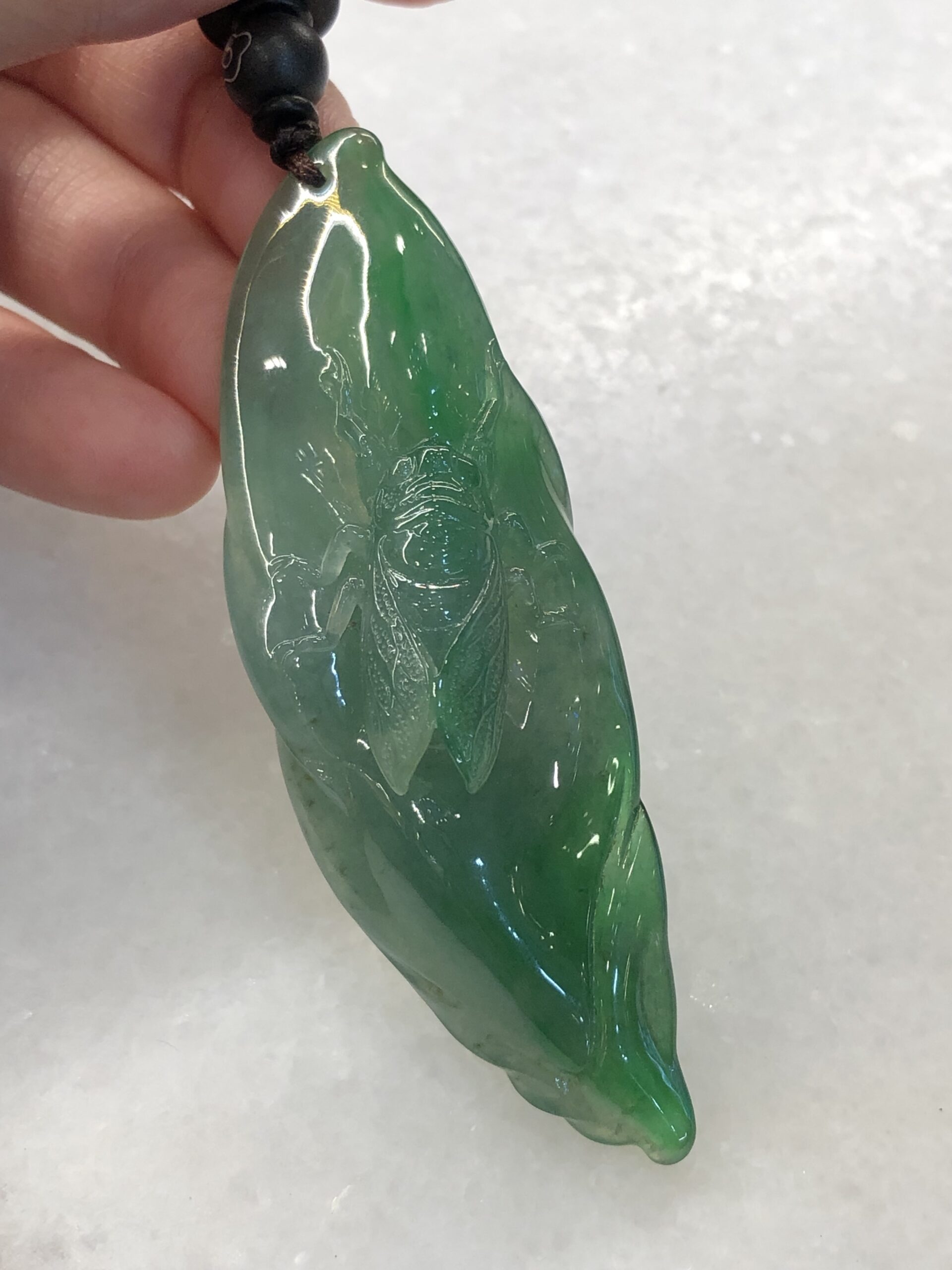 This Cicada on Leaf Jade Pendant is an exquisite example of fine jadeite craftsmanship, showcasing one of the most prized and vibrant green tones found in natural jadeite. The pendant is carved in high relief, depicting a lifelike cicada poised gracefully upon a softly curved leaf. The artist’s skill is evident in the fine detailing of the cicada’s wings and the fluid contours of the leaf. The jadeite exhibits exceptional quality, characterized by high translucency, fine, compact jade grains, and a brilliant, saturated green hue. The pendant reveals a glowing inner luminosity — a hallmark of top-grade jadeite prized by collectors. The gemstone has excellent lustre and smooth polish, enhancing its natural beauty and the intricacy of the carving. Clarity is also excellent with no significant inclusion to note. A piece of remarkable elegance and auspicious symbolism, this pendant combines superior material quality with masterful carving — an exceptional addition to any fine jade collection.