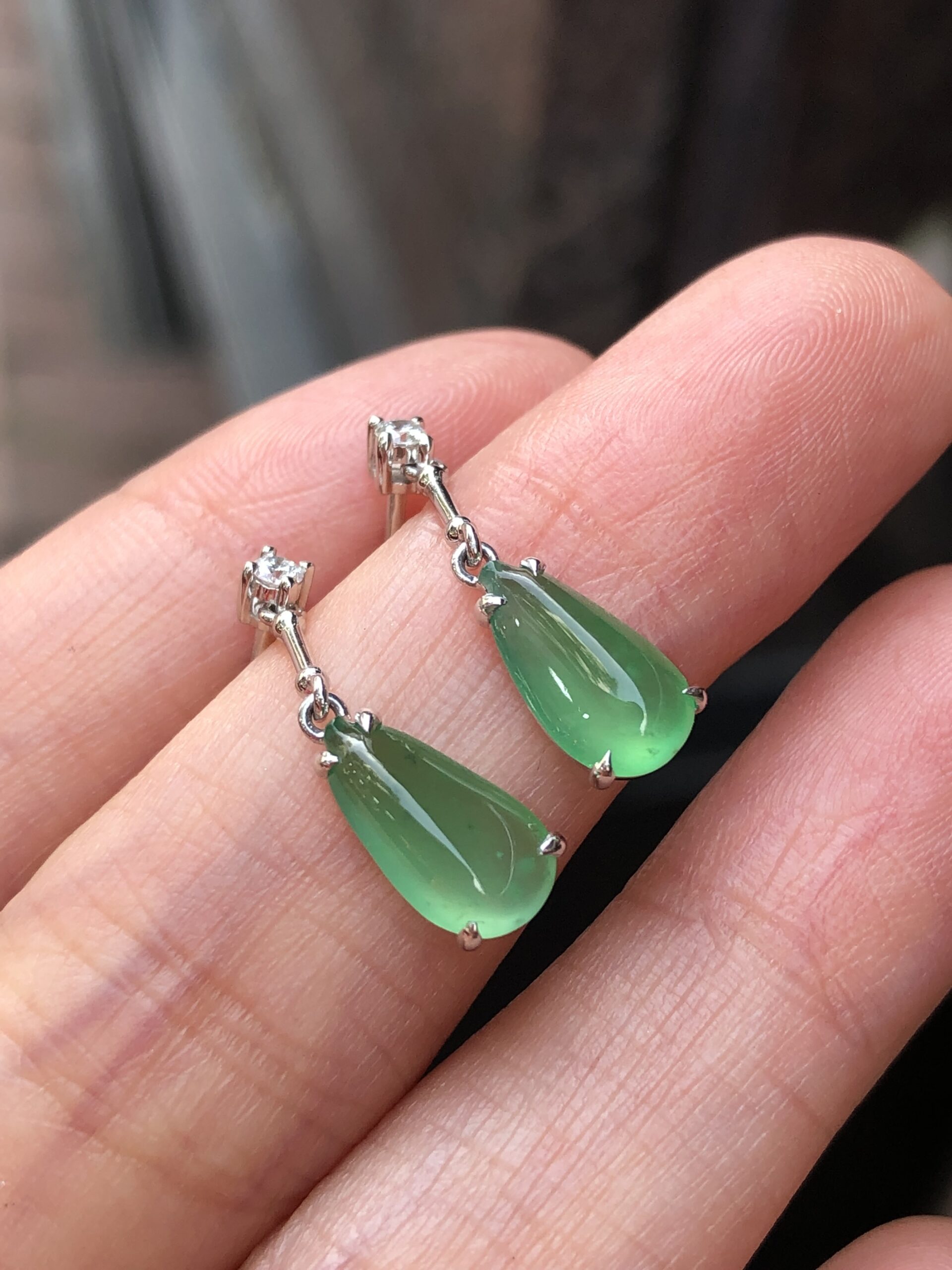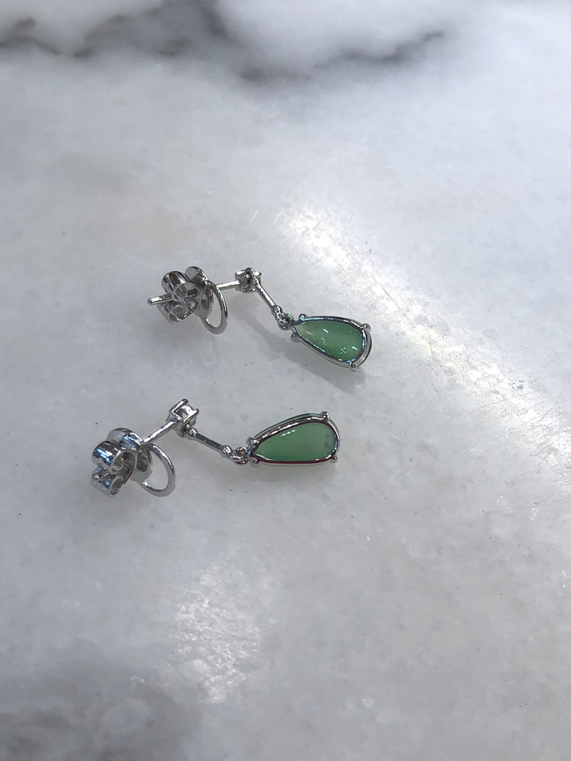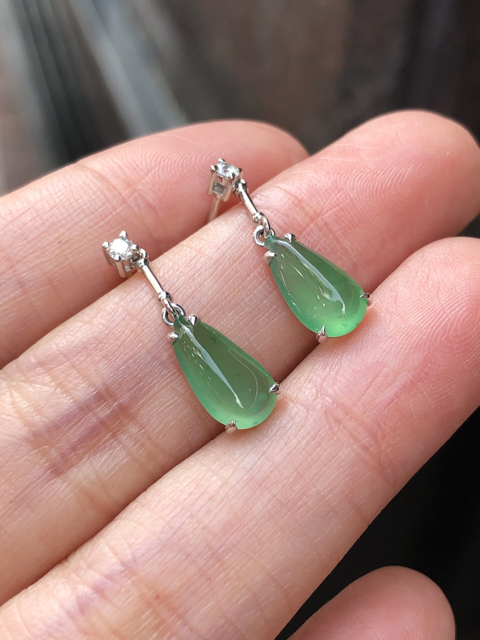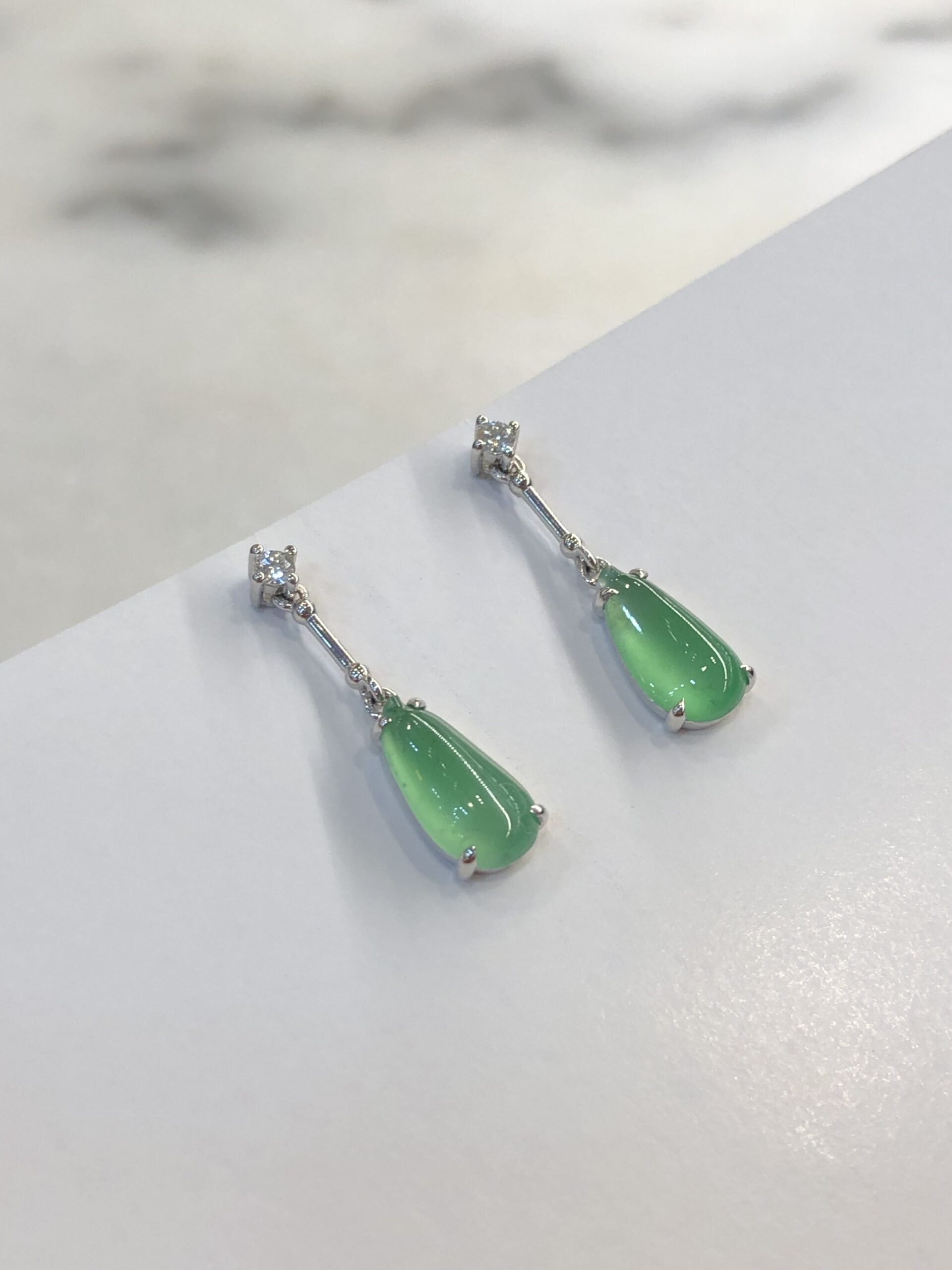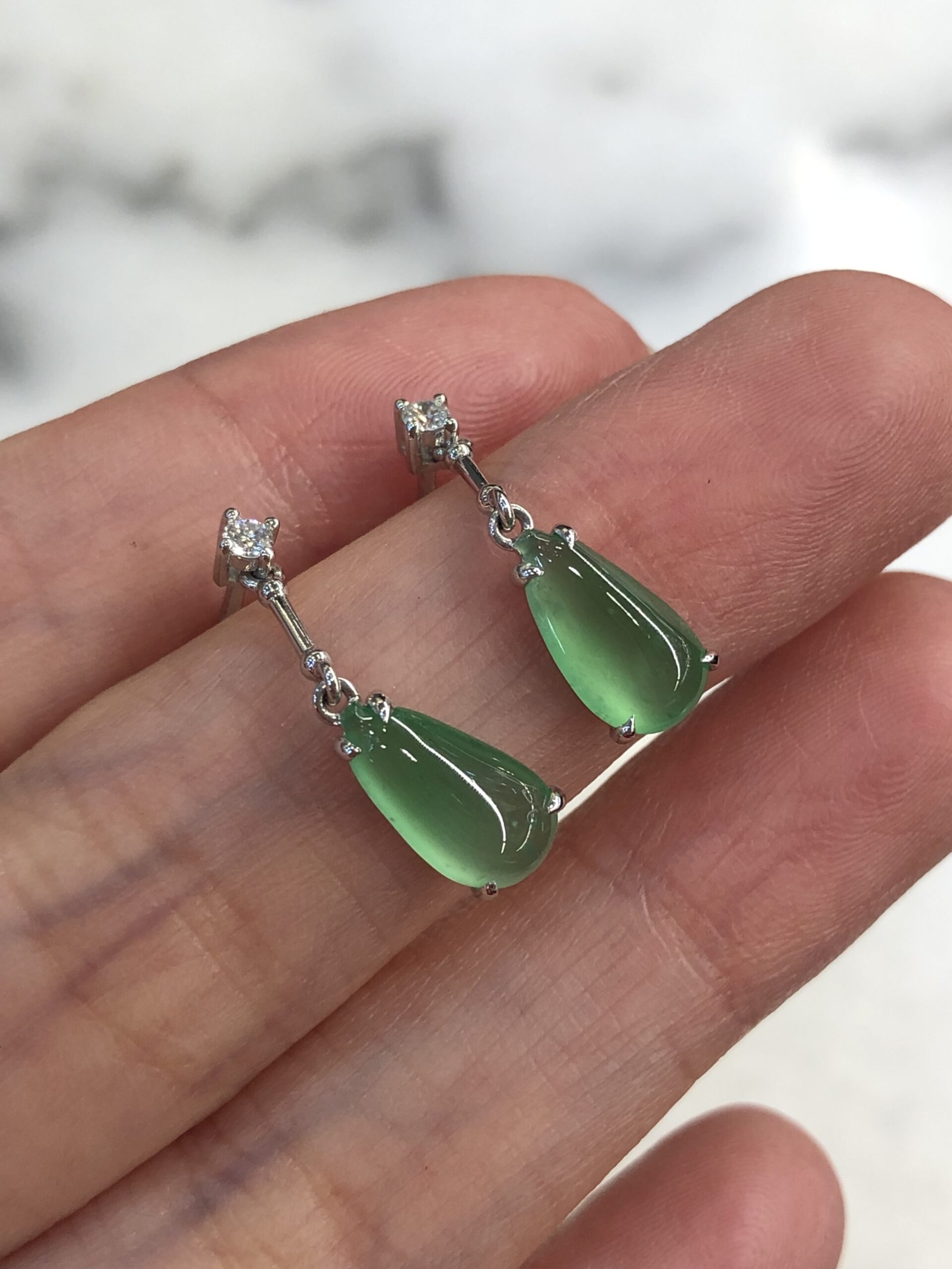Grade A icy green jade dewdrop earrings with excellent lustre and translucency. The jade earrings have a refreshing mint green hue against an icy, near glassy base. The quality of the earrings is exceptional with strong luminosity and extremely rich water content.