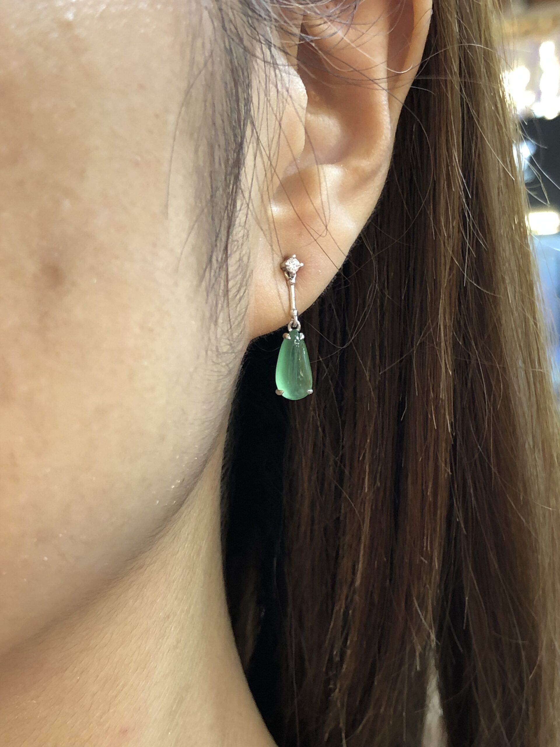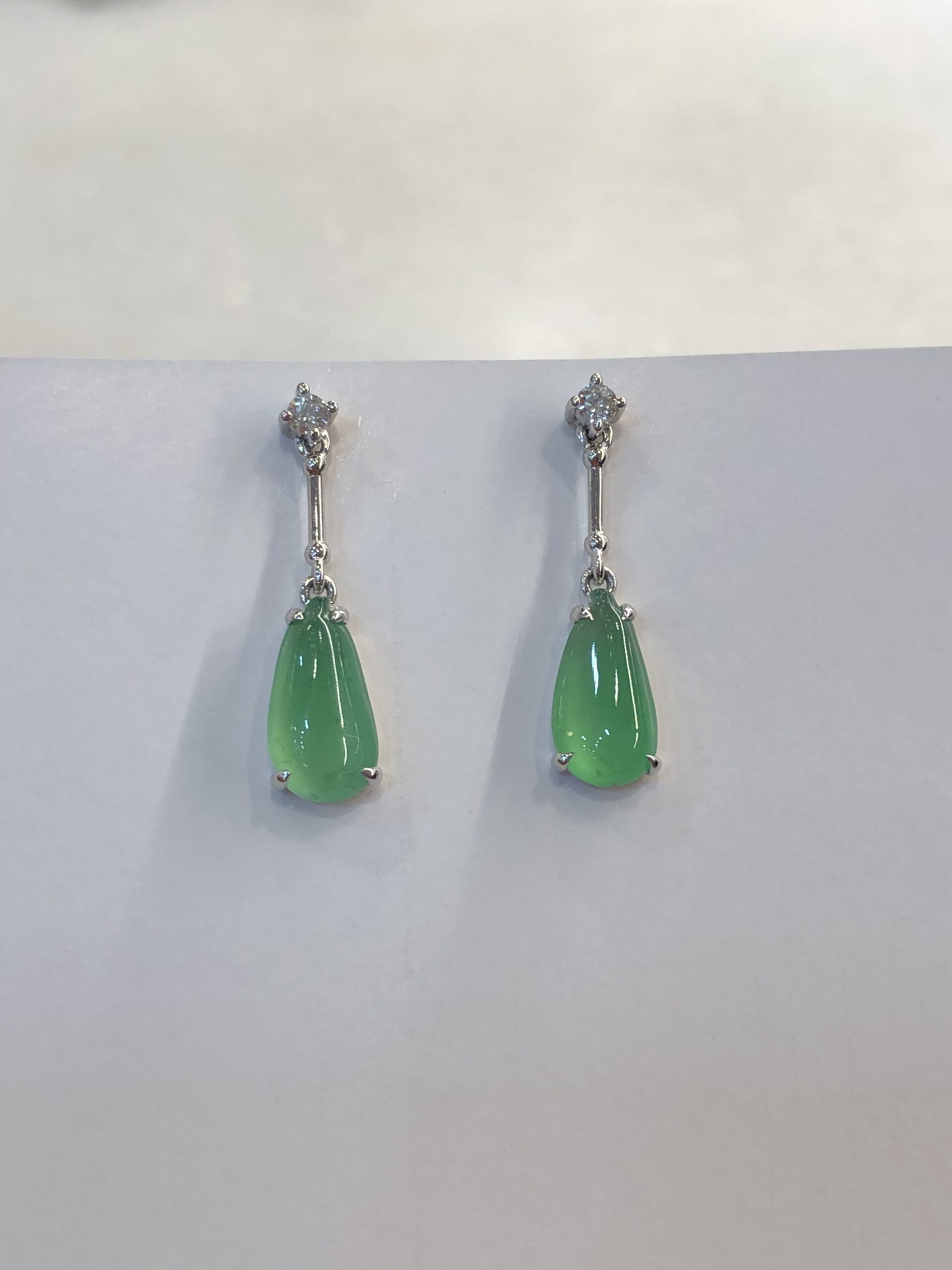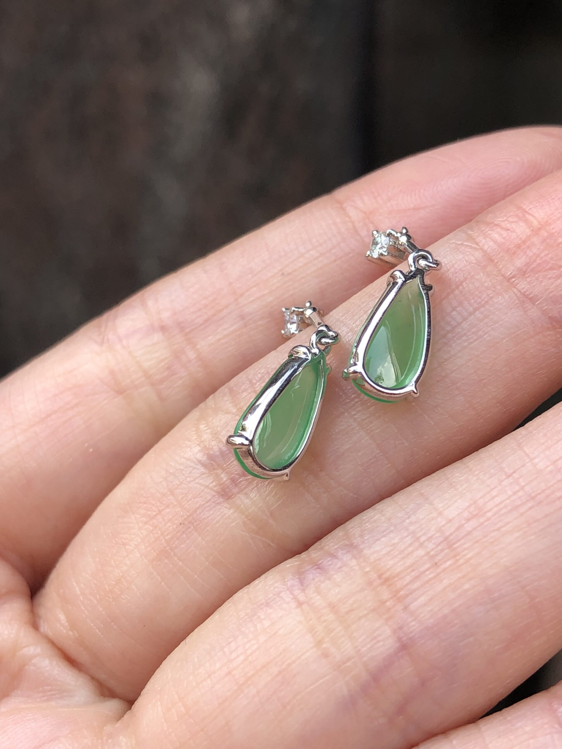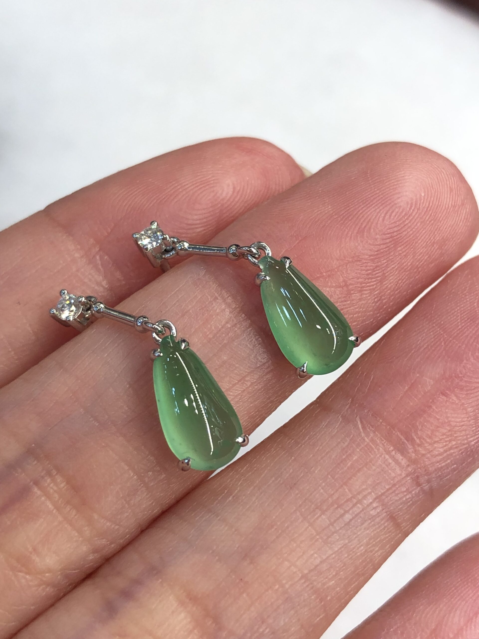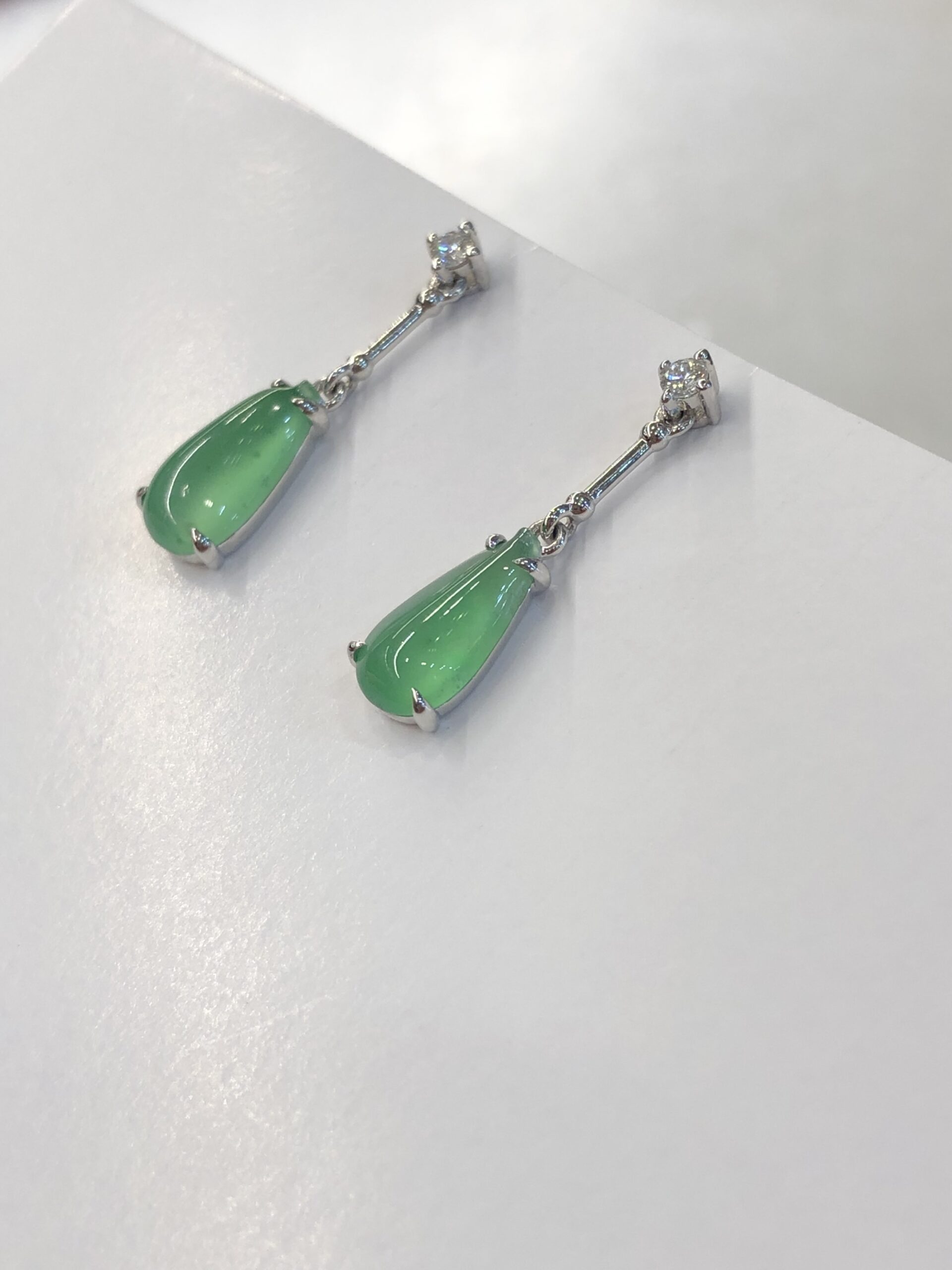 Grade A icy green jade dewdrop earrings with excellent lustre and translucency. The jade earrings have a refreshing mint green hue against an icy, near glassy base. The quality of the earrings is exceptional with strong luminosity and extremely rich water content.