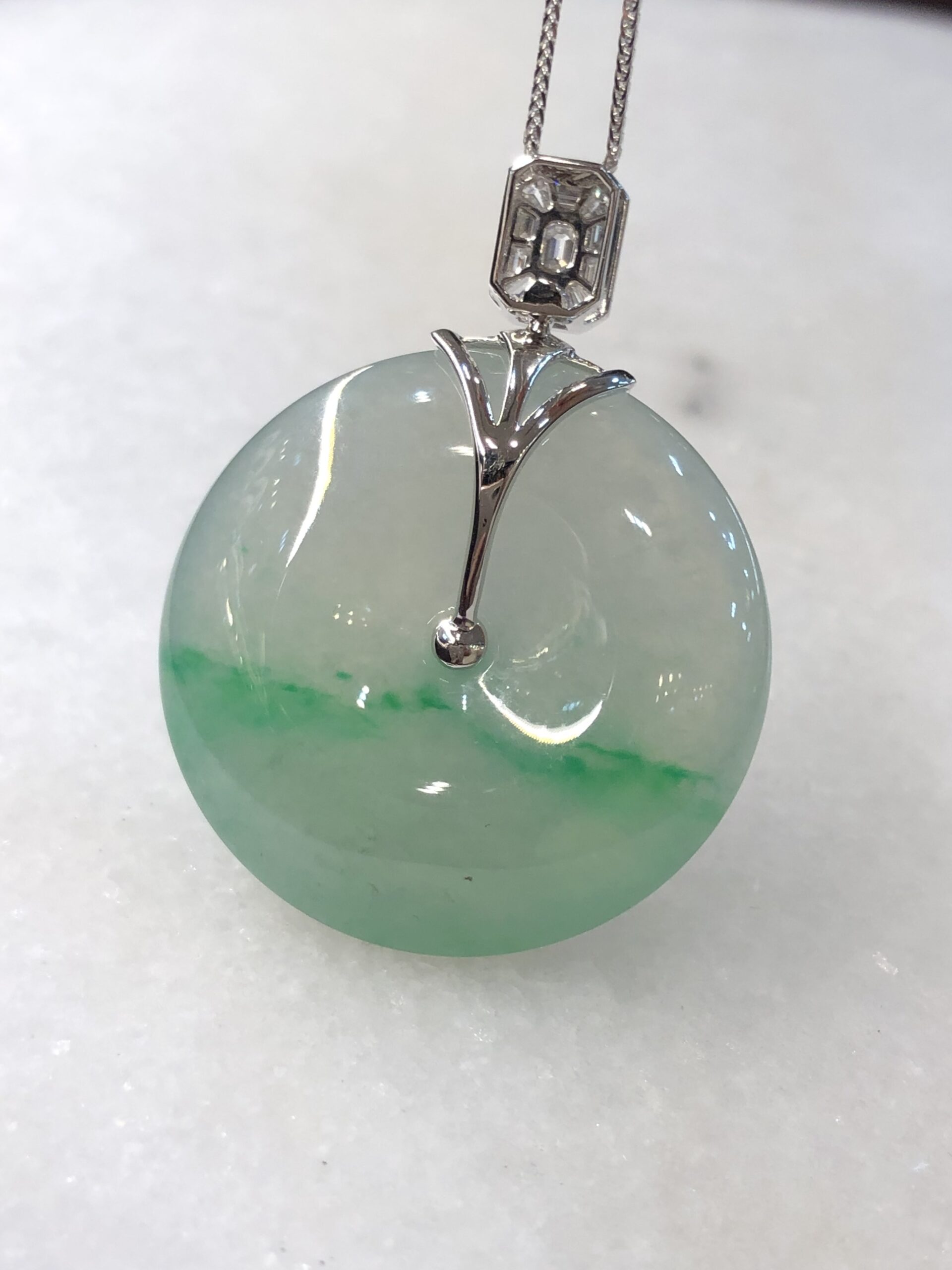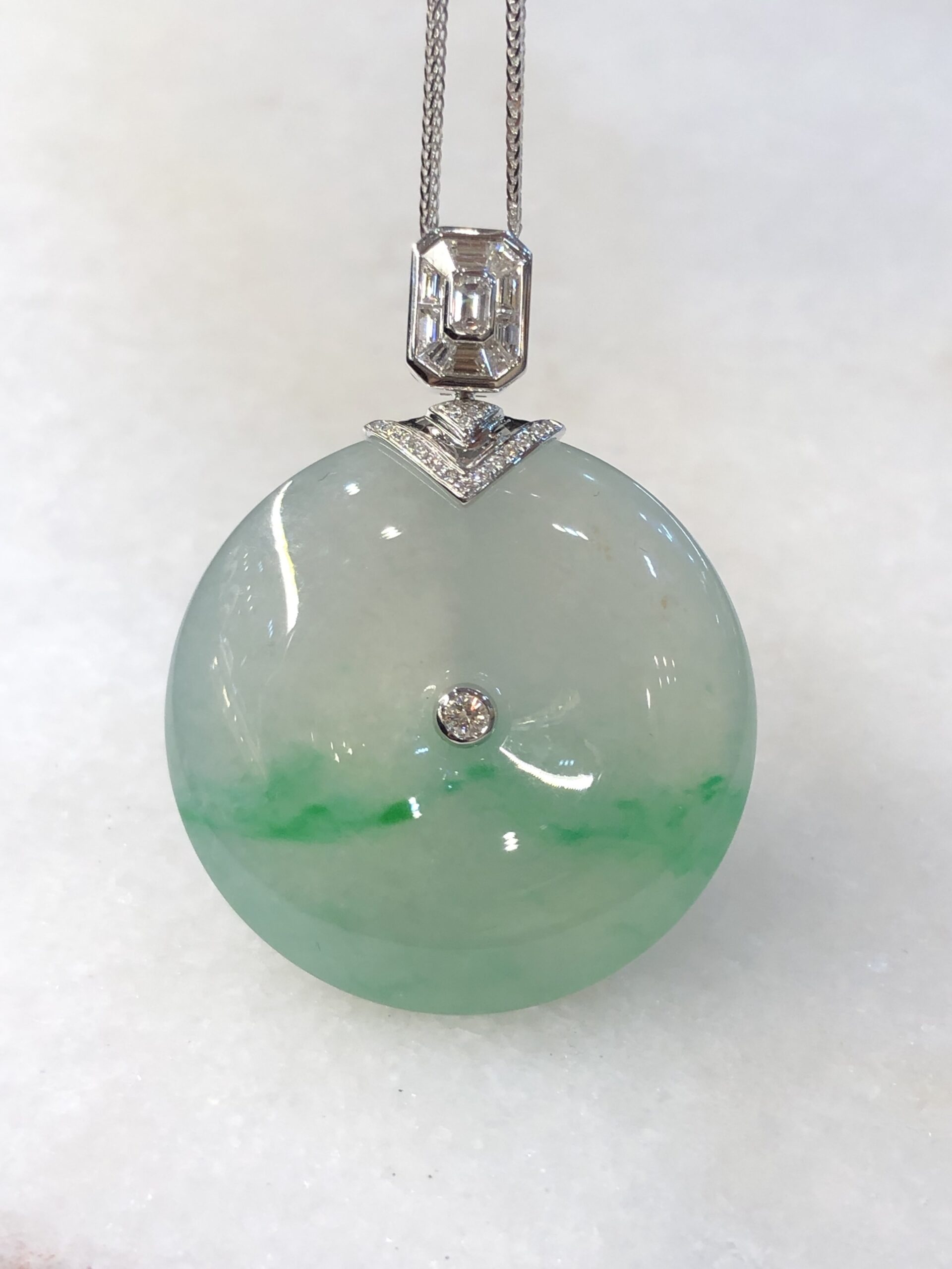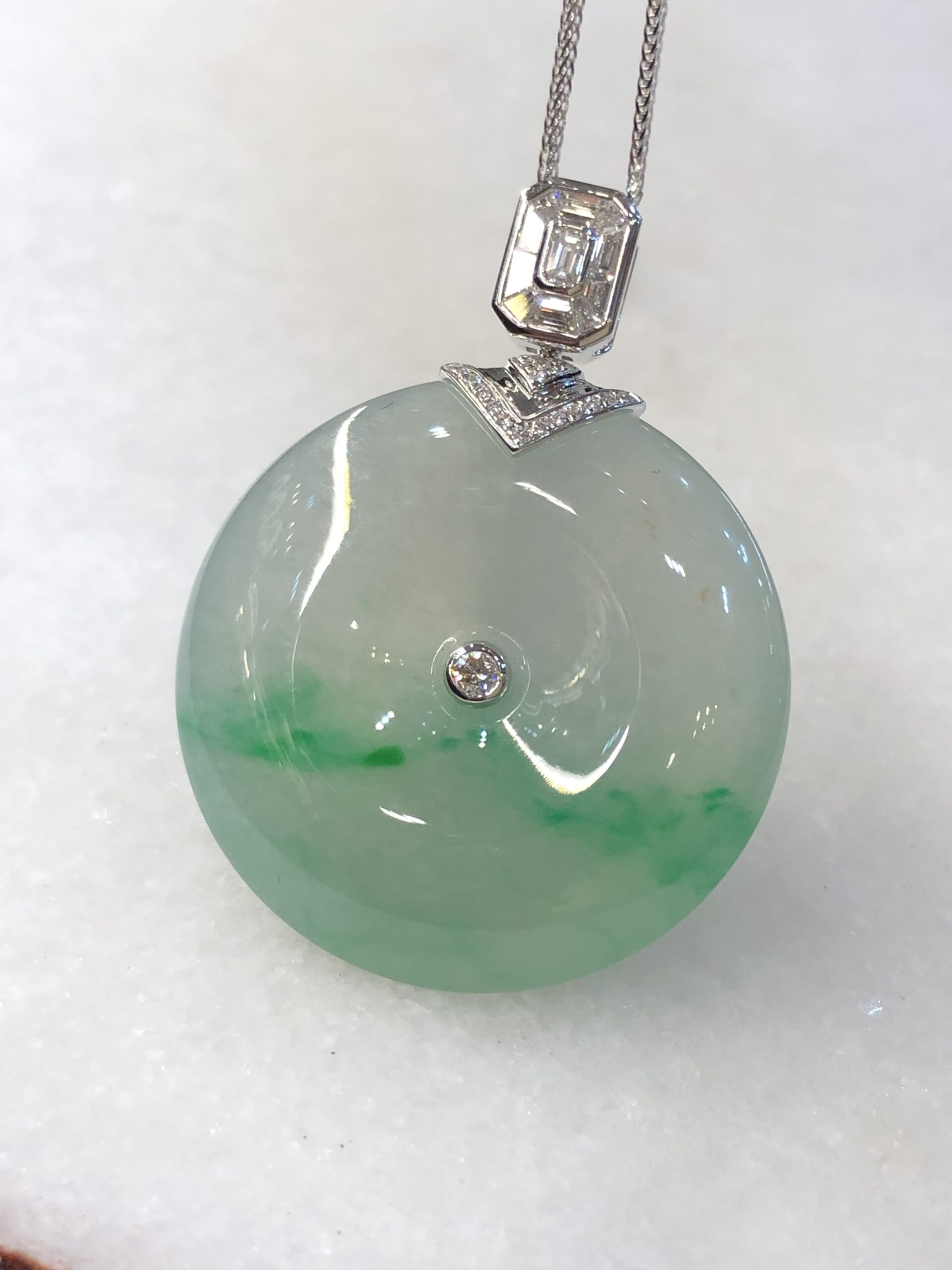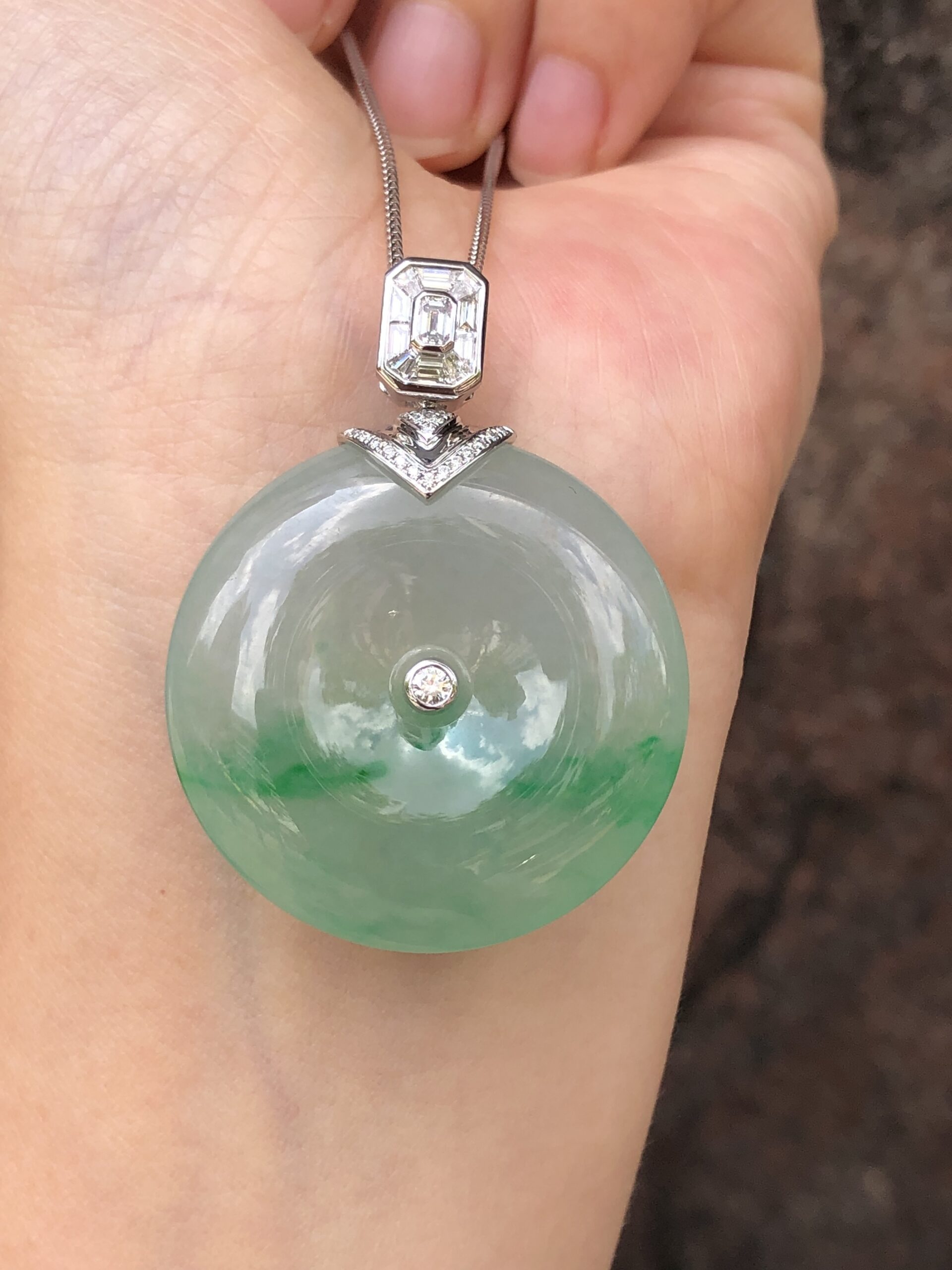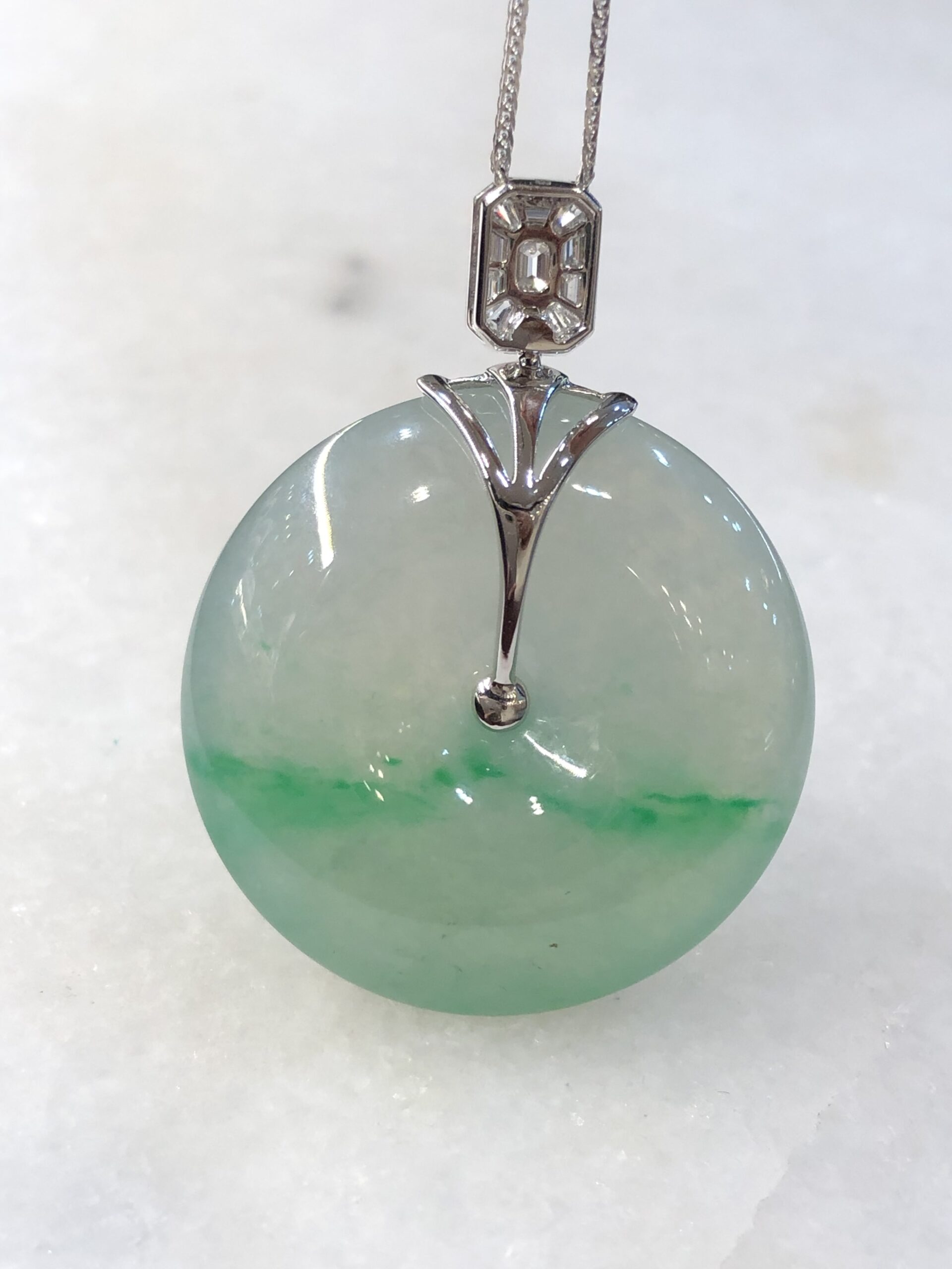 An investment-grade icy green jadeite safety coin with exceptional translucency, thickness, and vibrant saturation, elegantly set in 18K white gold with natural baguette and round brilliant diamonds.