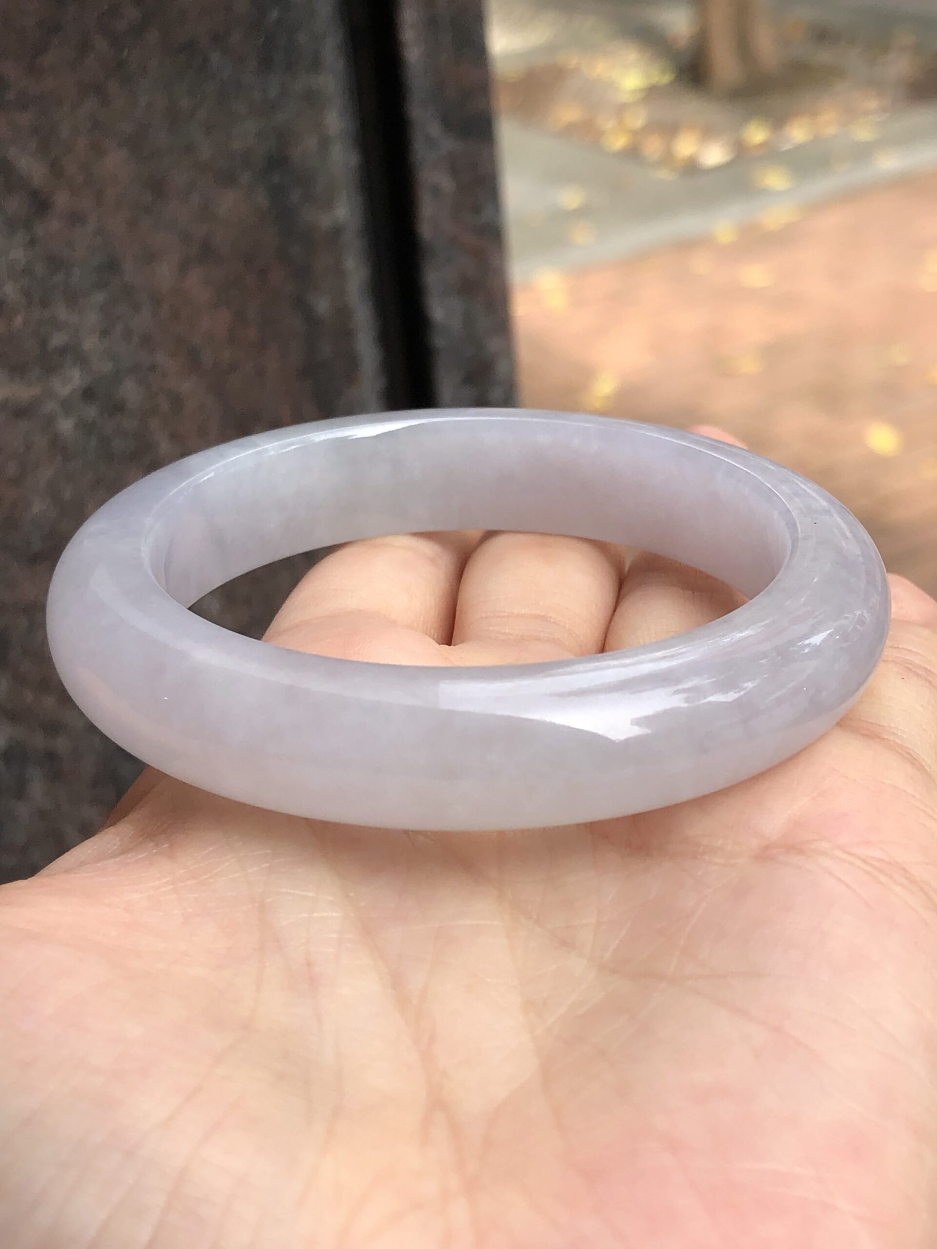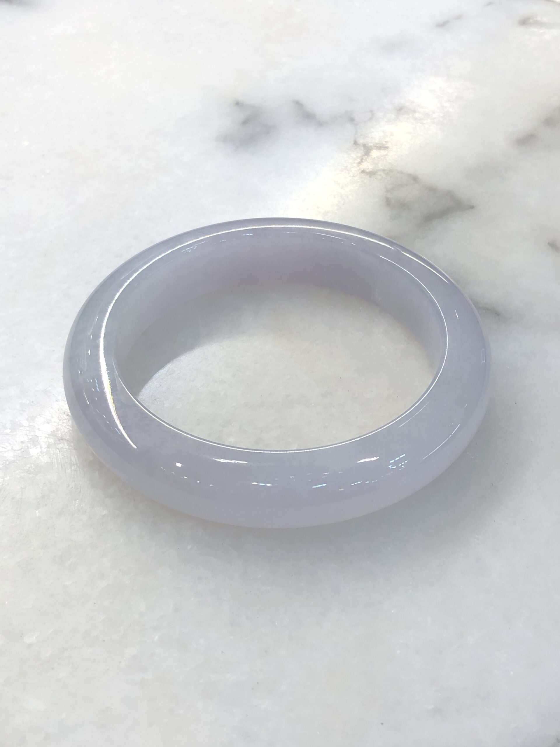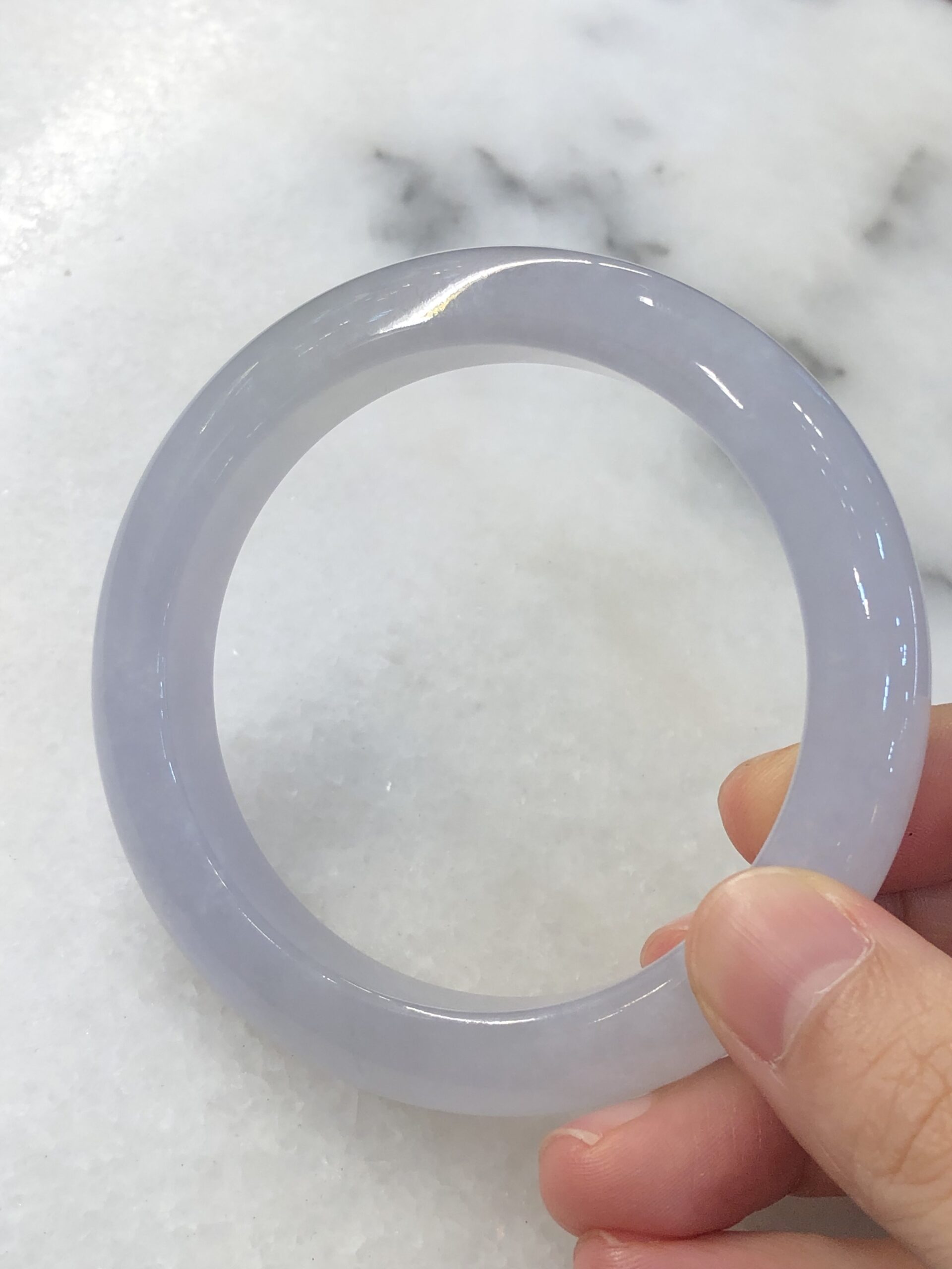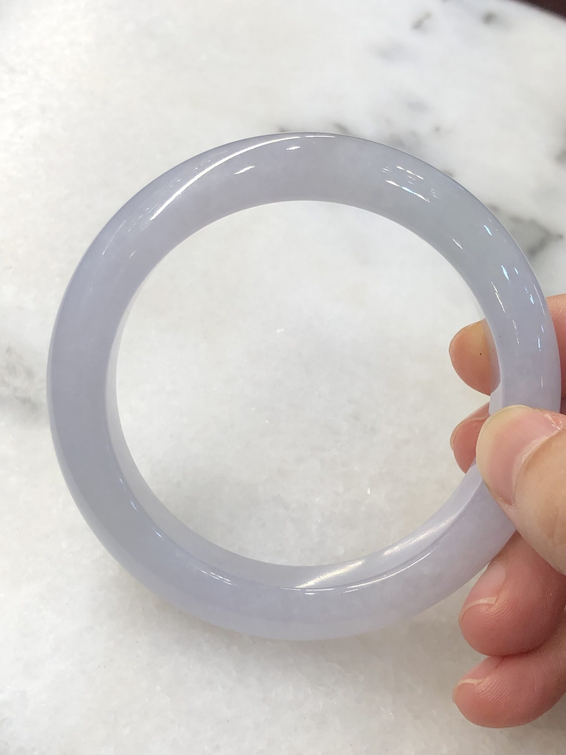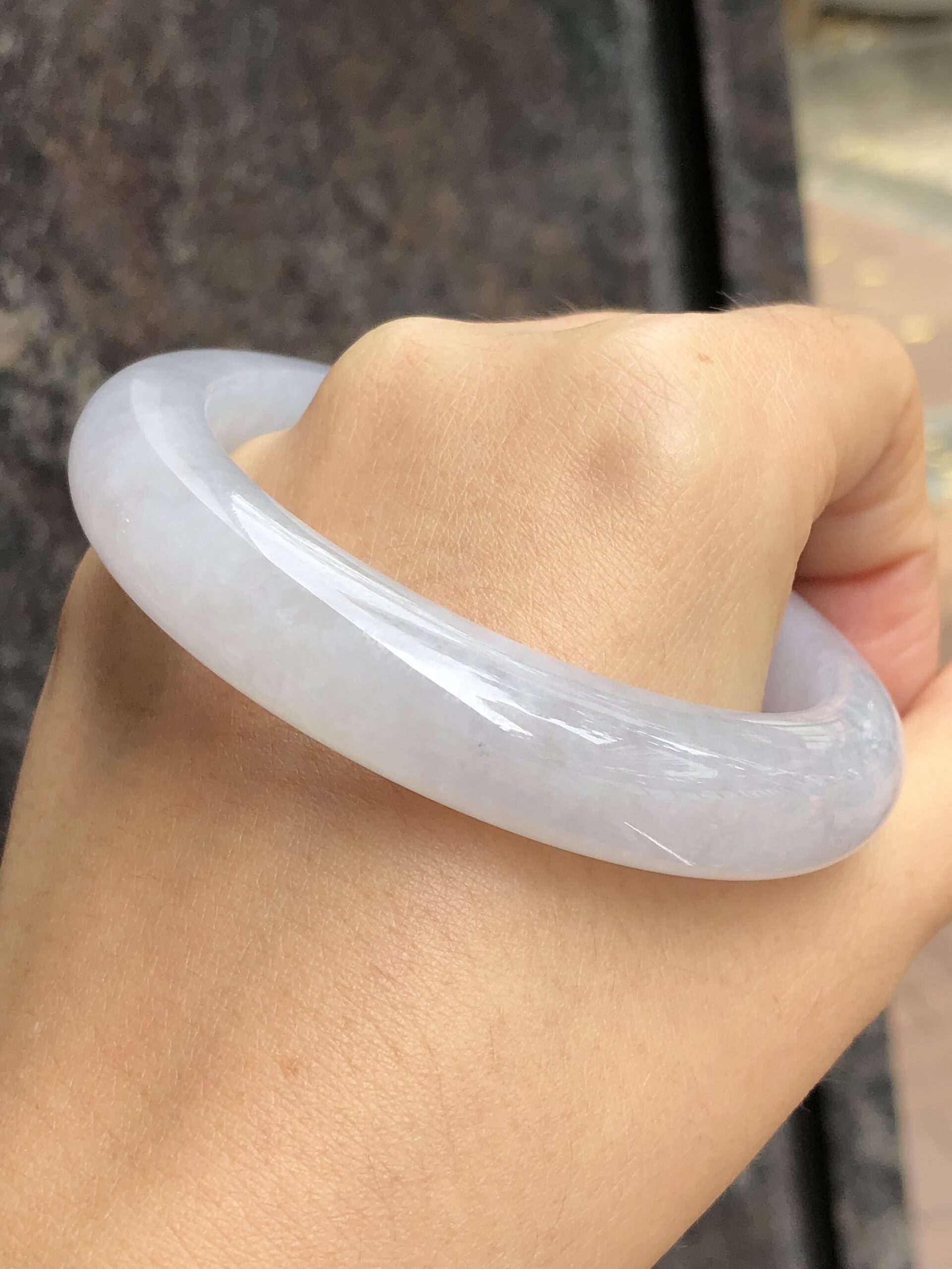 Discover the beauty of fine-quality icy jadeite in this elegant bangle, distinguished by its great translucency, rich water content, and tightly packed grain structure. These features give the piece a bright appearance and a smooth internal texture prized by jadeite collectors. A gentle lavender tinge washes through the icy body, adding a soft, natural hue.