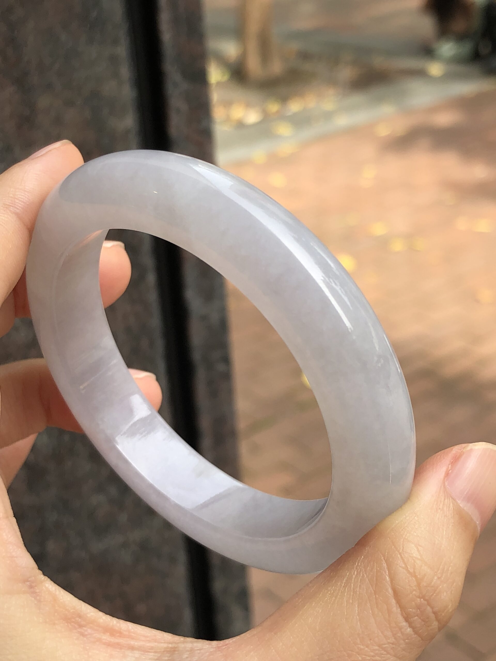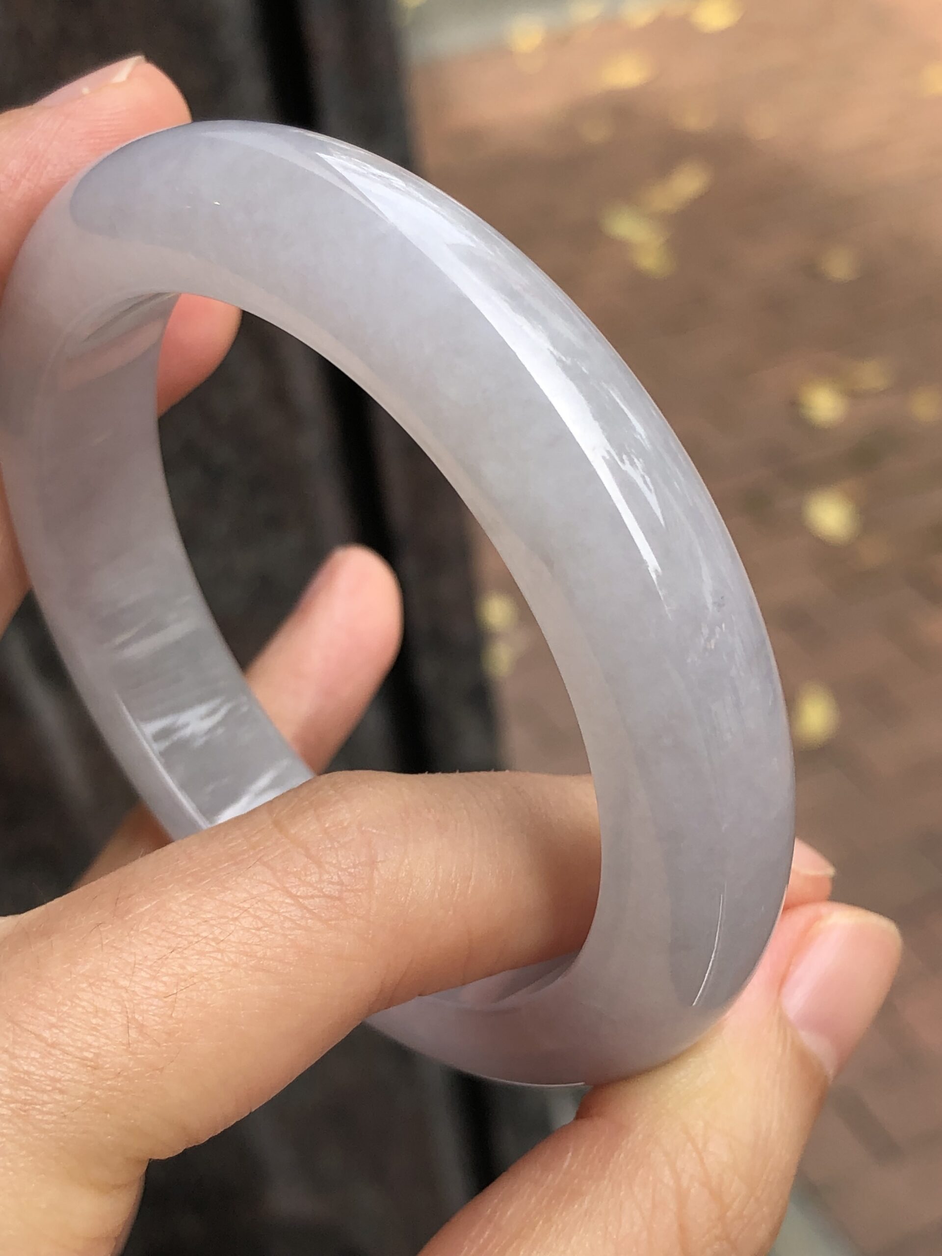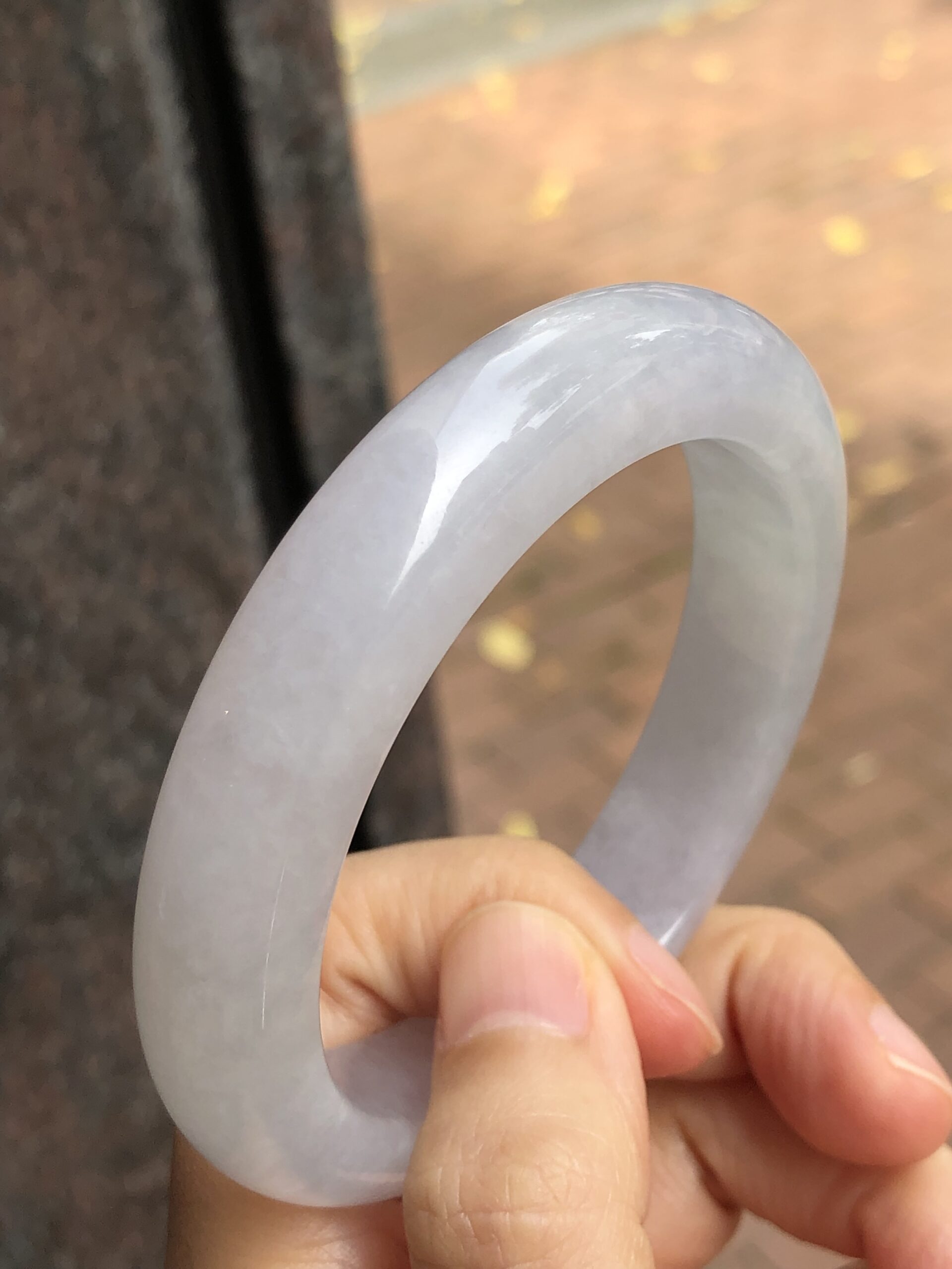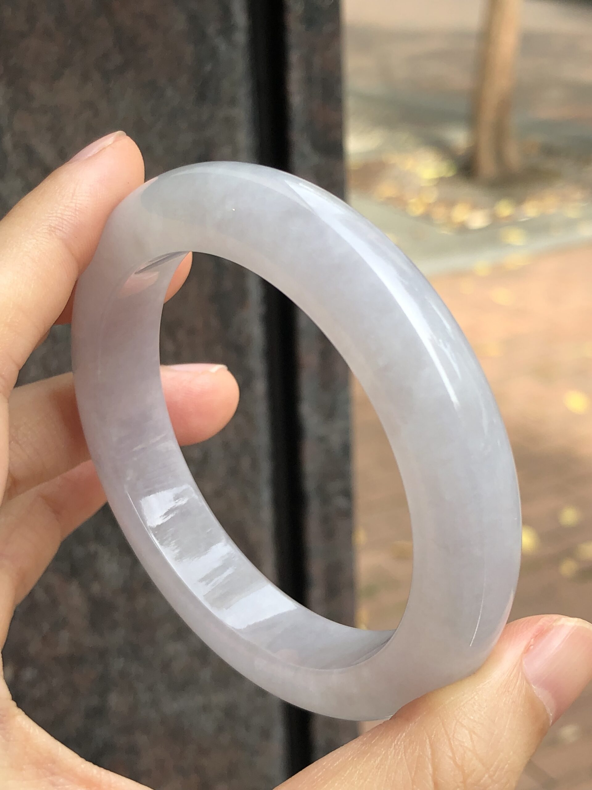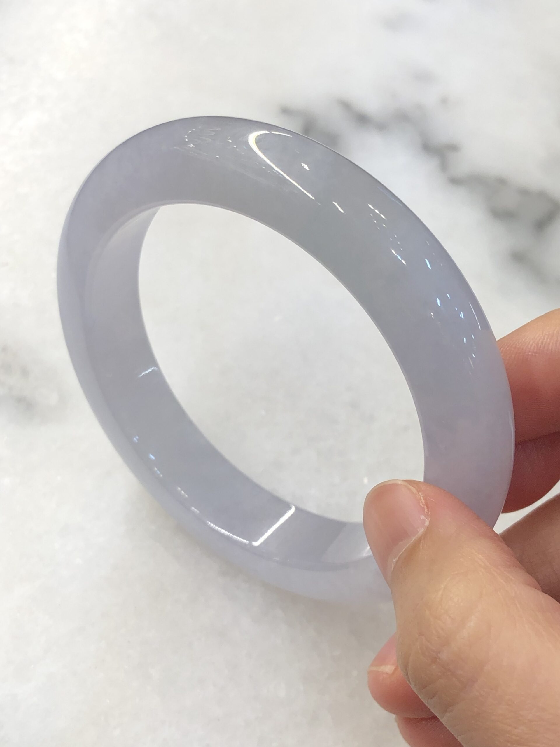 Discover the beauty of fine-quality icy jadeite in this elegant bangle, distinguished by its great translucency, rich water content, and tightly packed grain structure. These features give the piece a bright appearance and a smooth internal texture prized by jadeite collectors. A gentle lavender tinge washes through the icy body, adding a soft, natural hue.