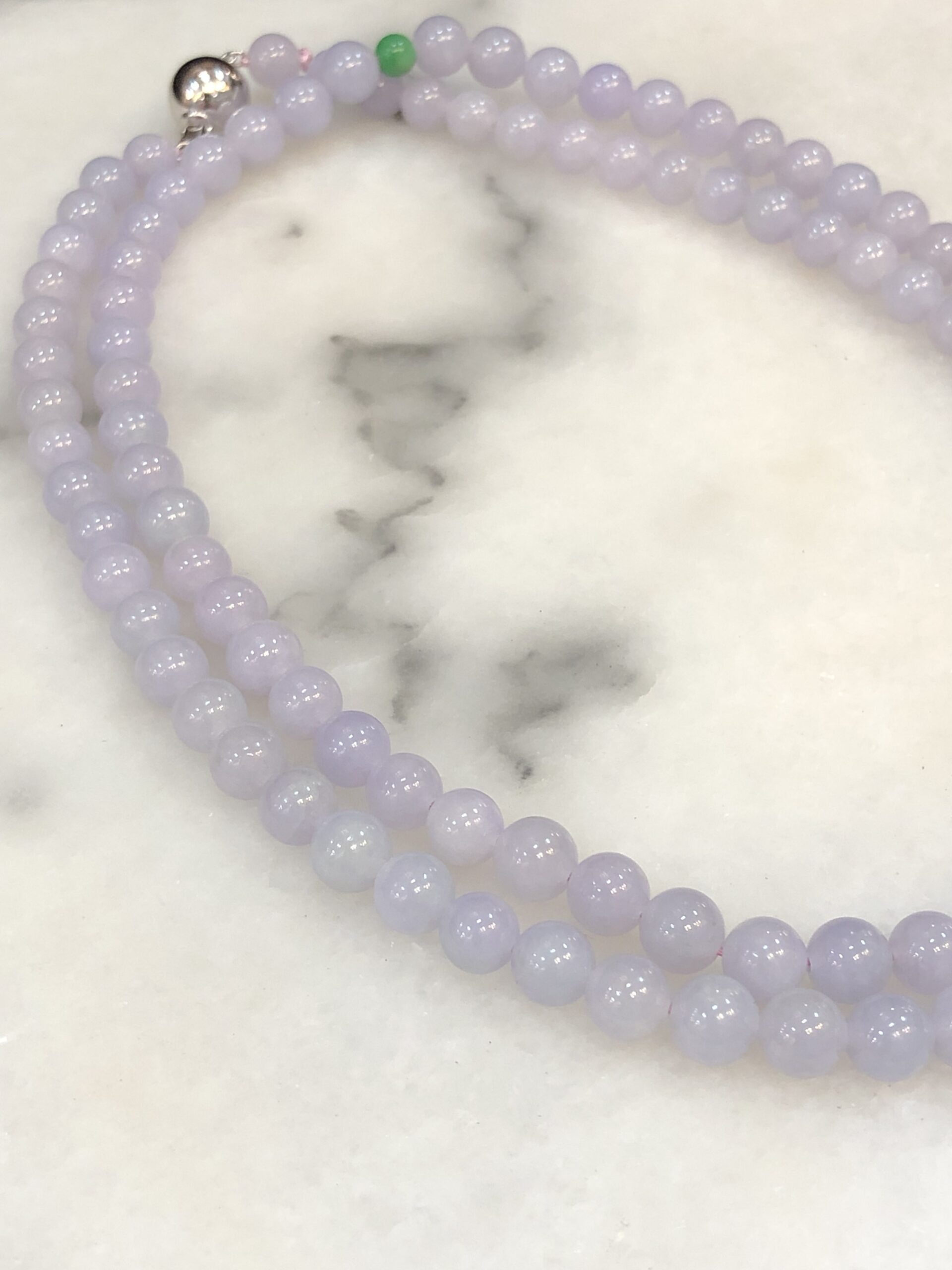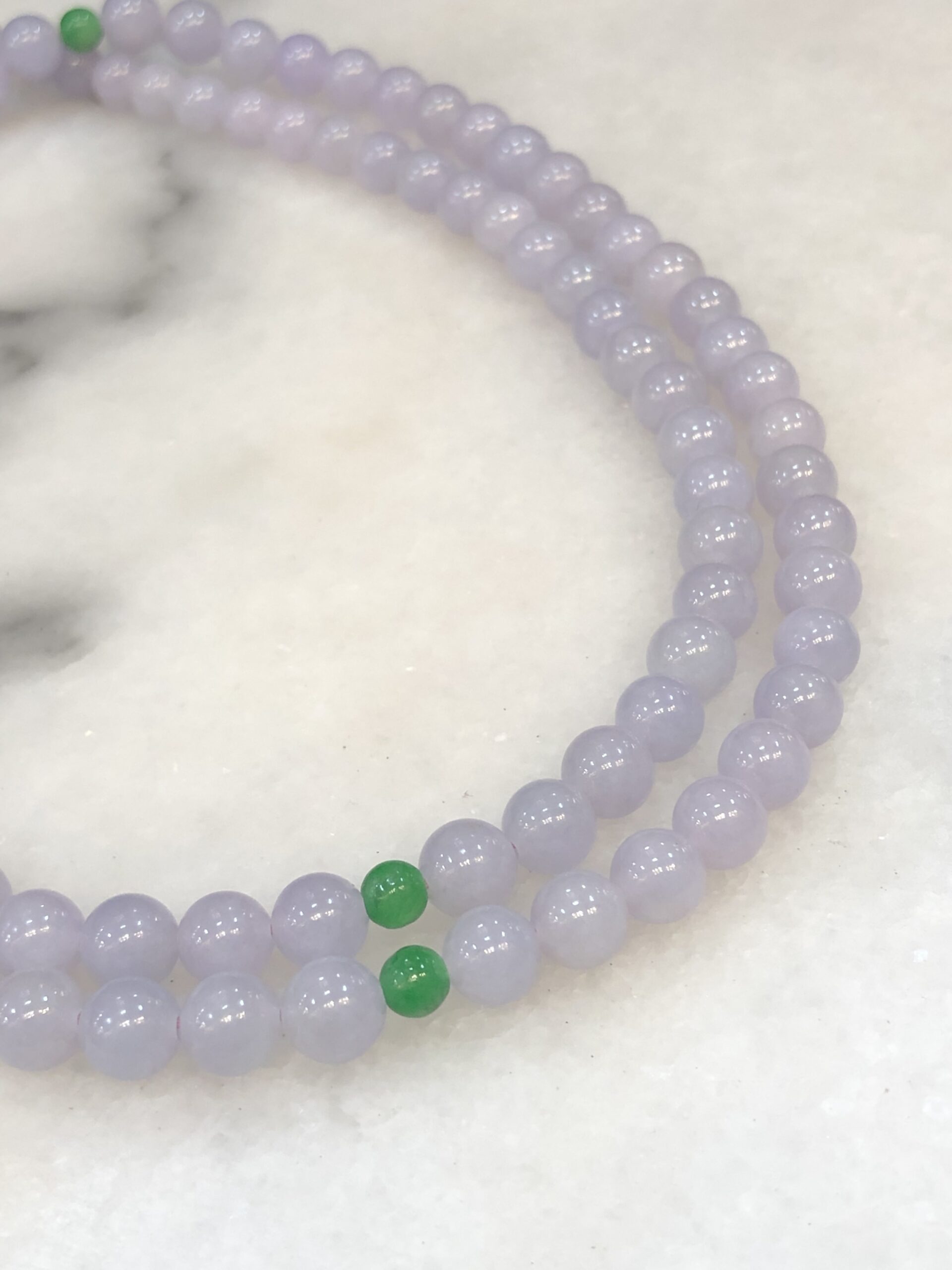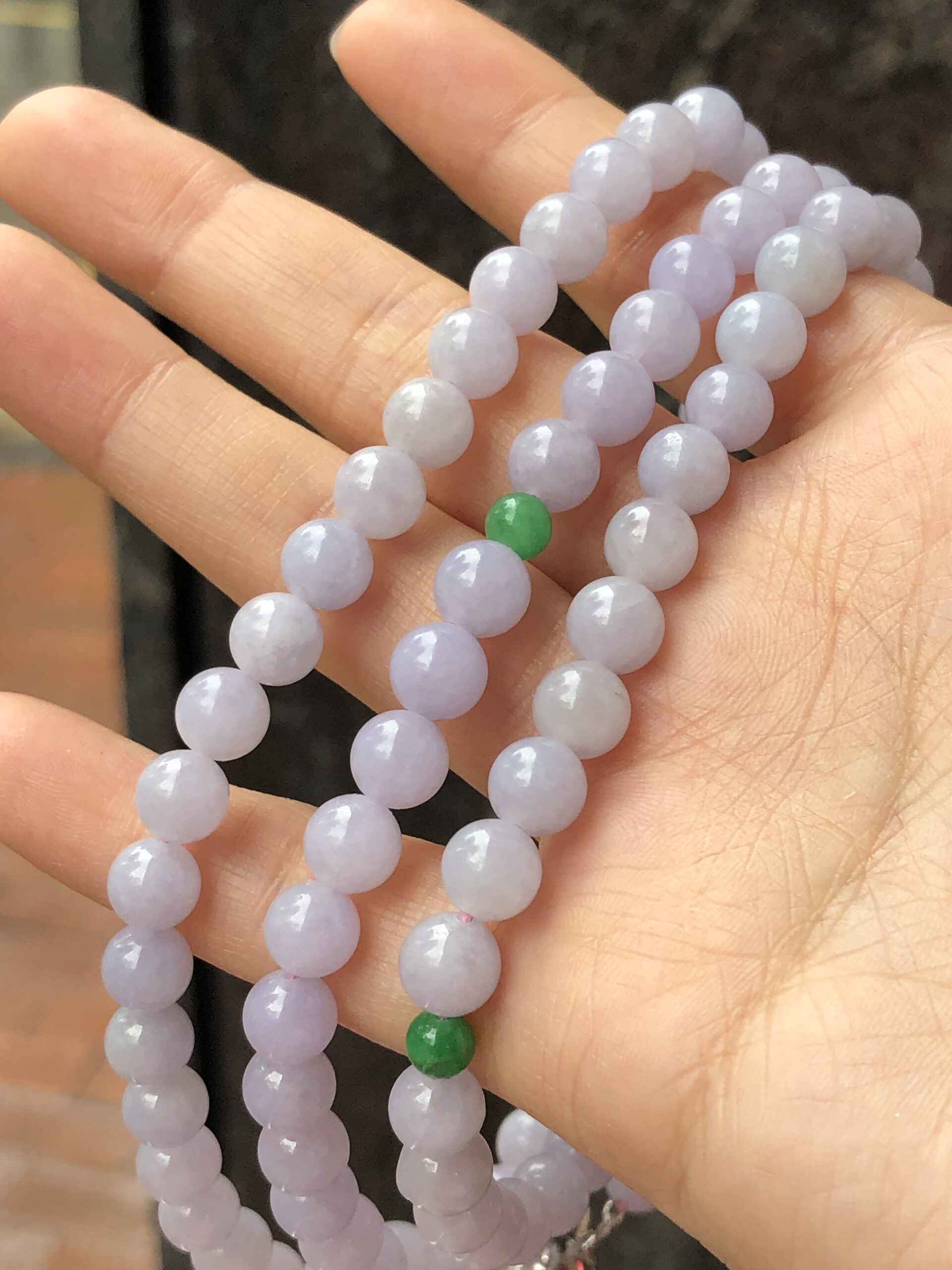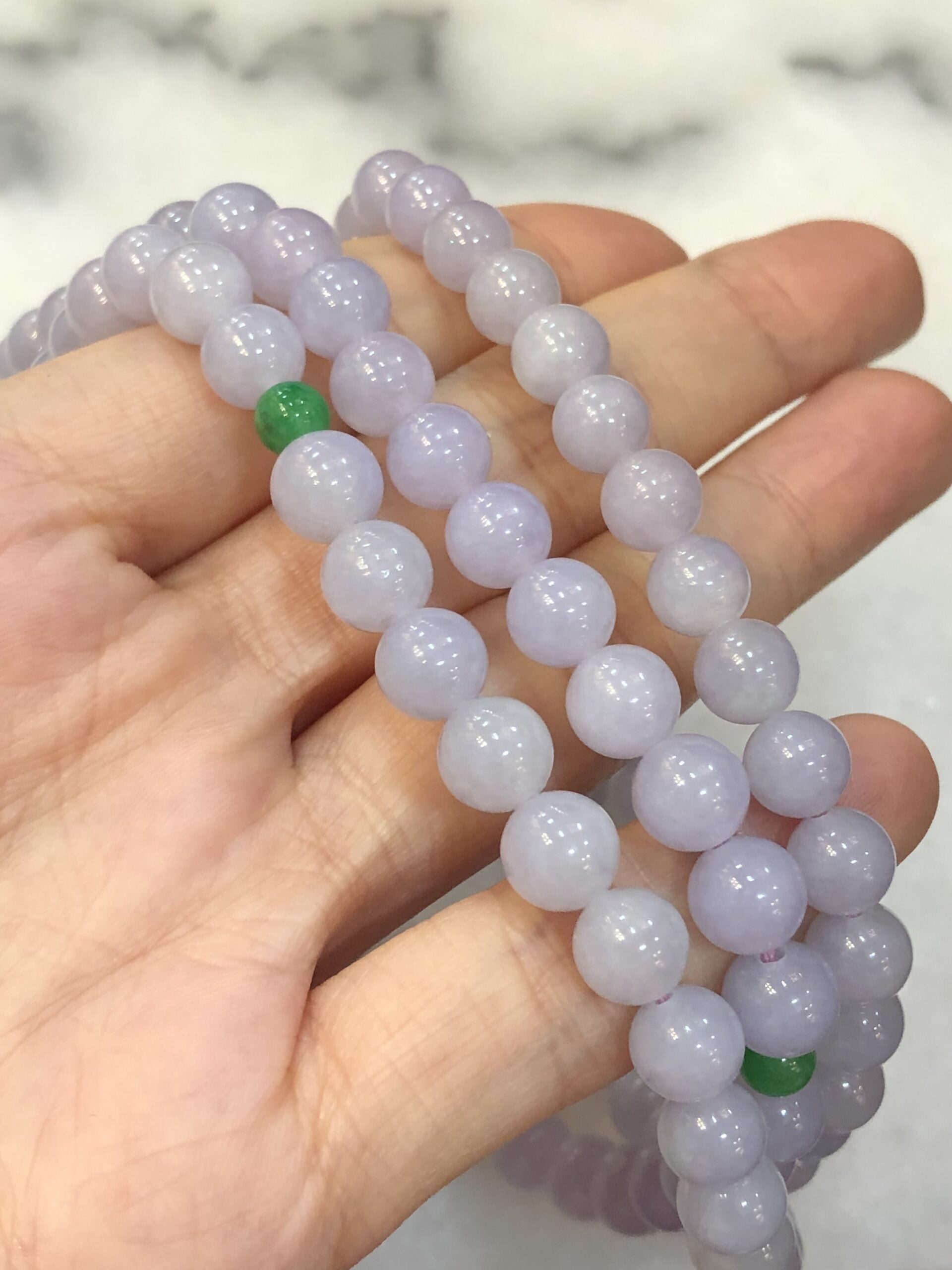 Grade A 108 lavender jadeite beads with a refined sweet lilac-lavender hue display, harmoniously matched from end to end.