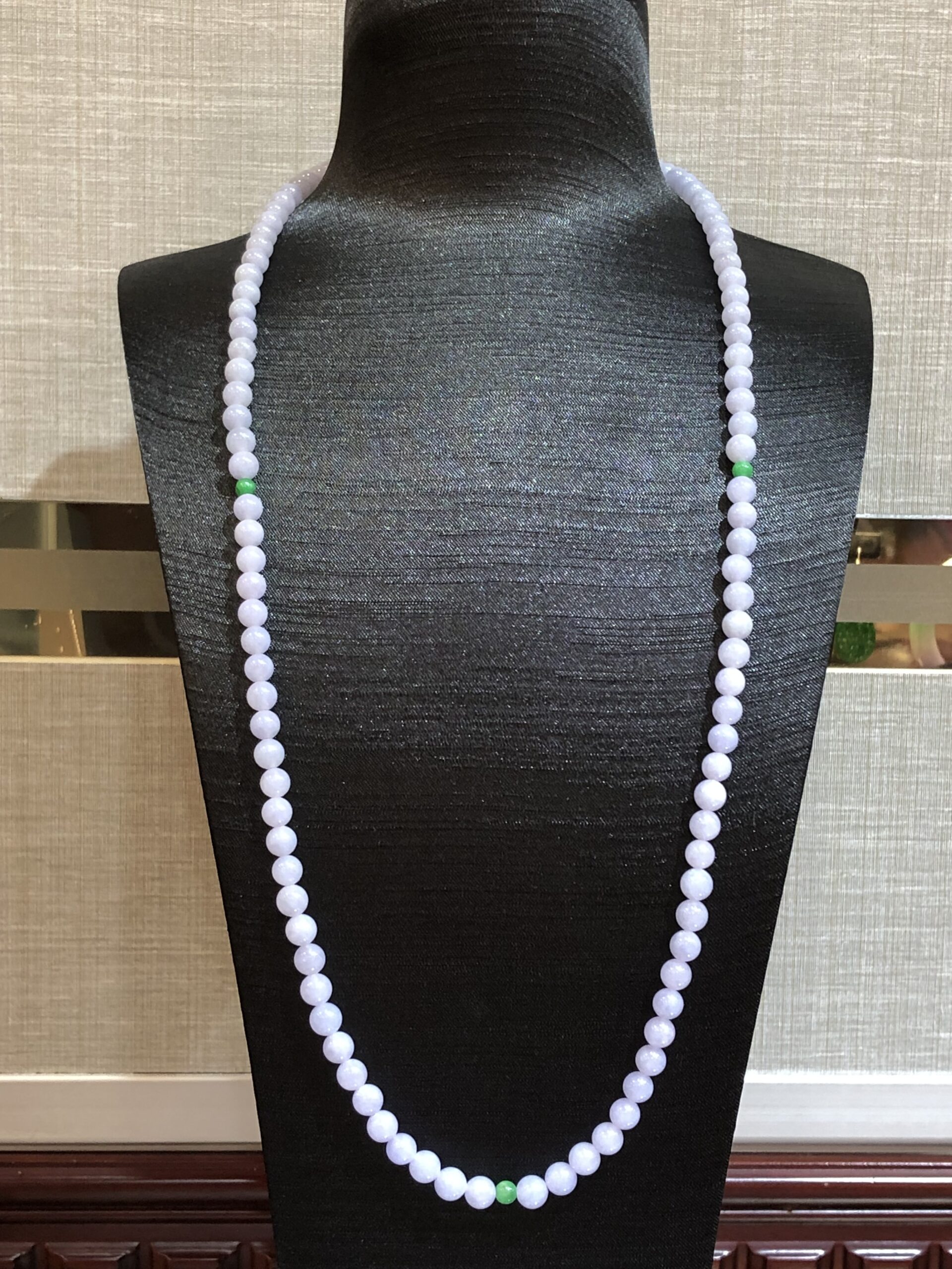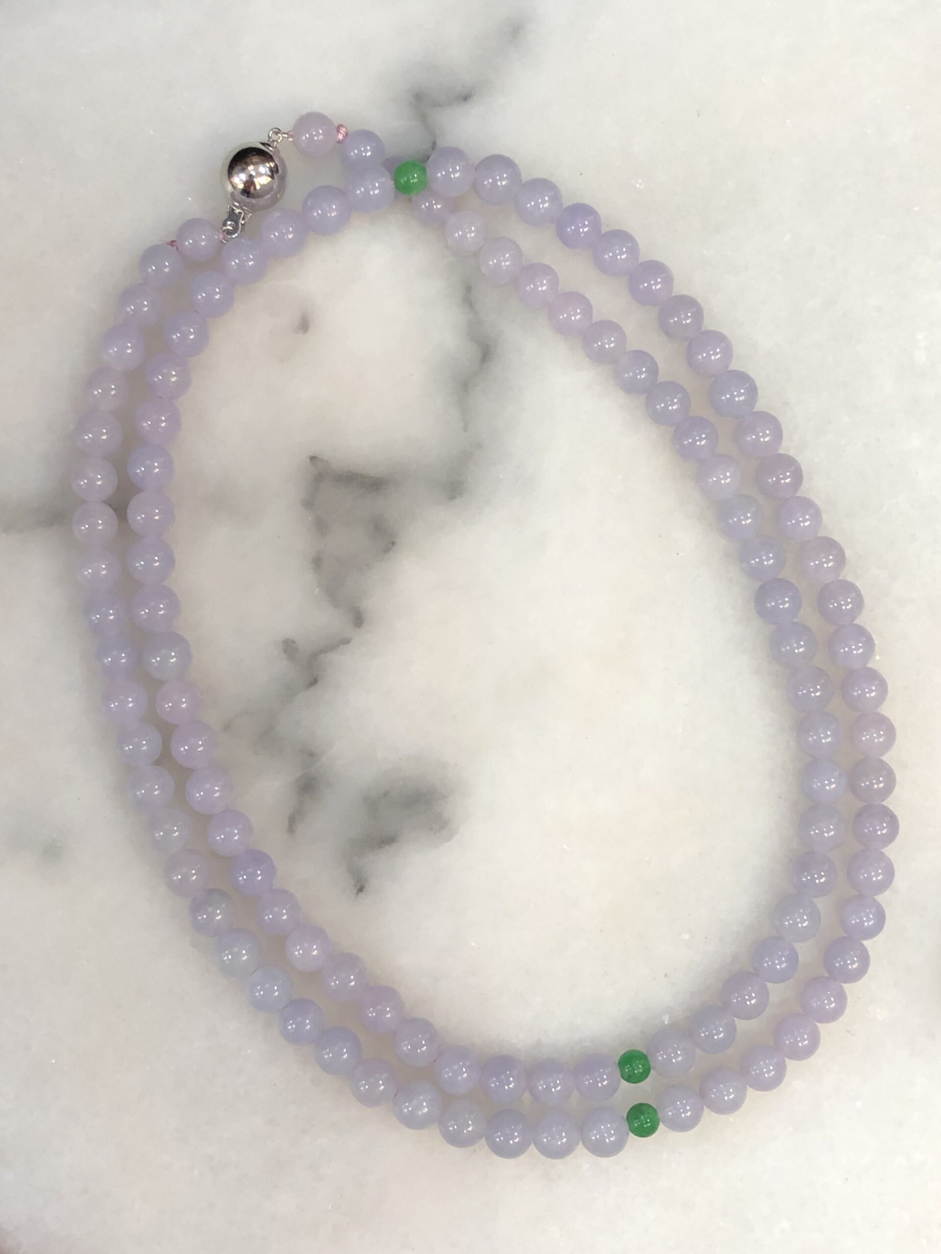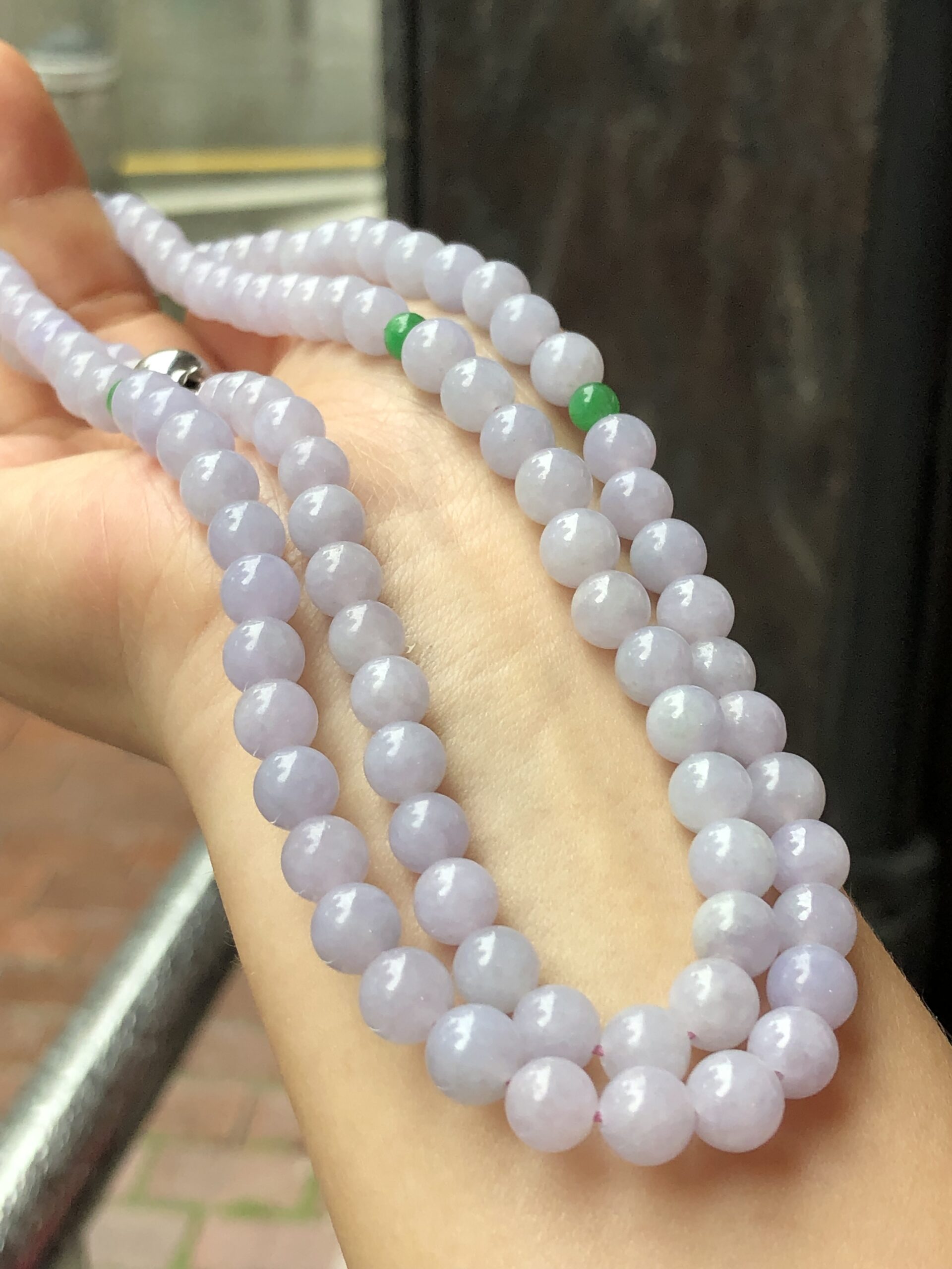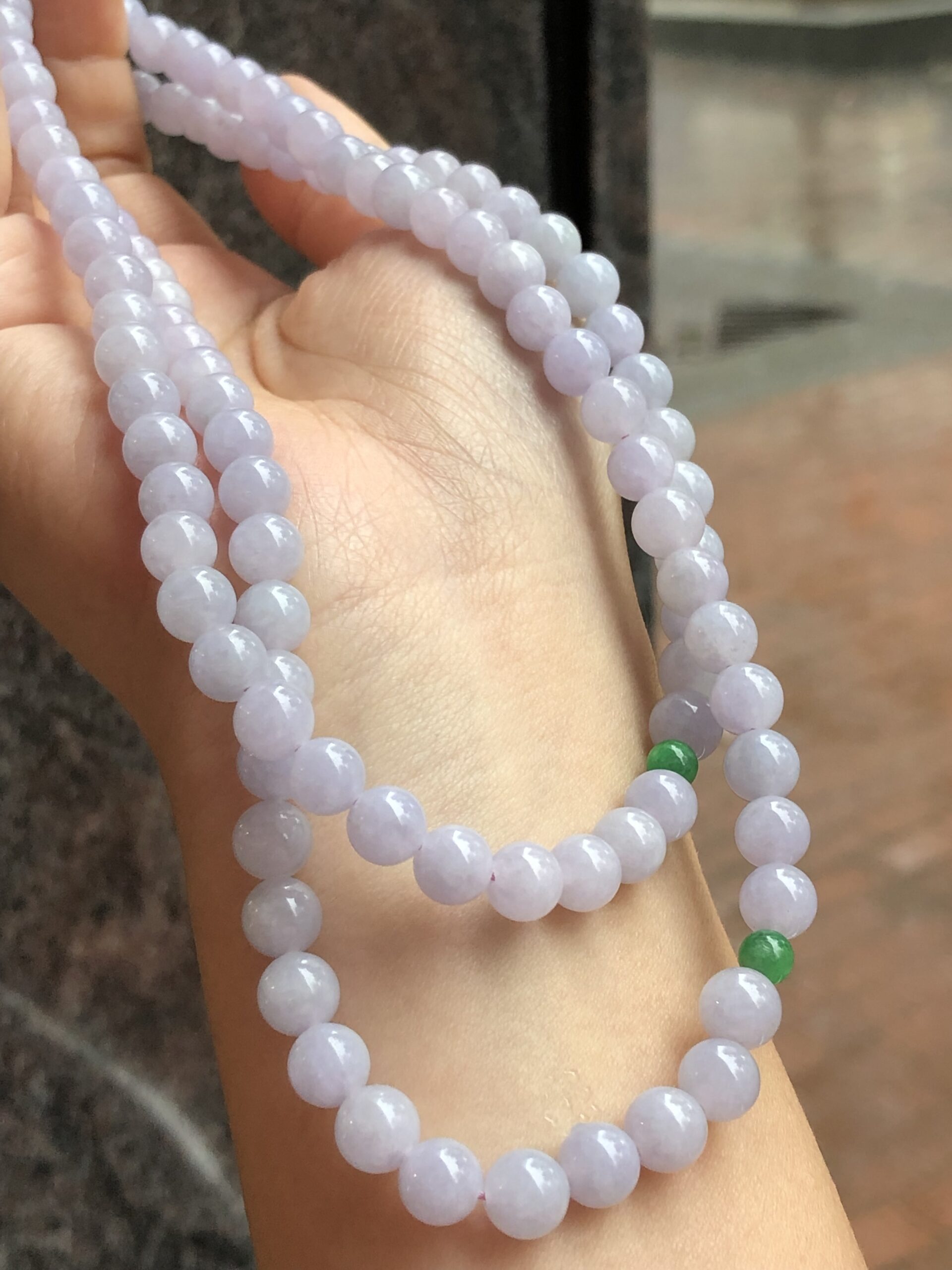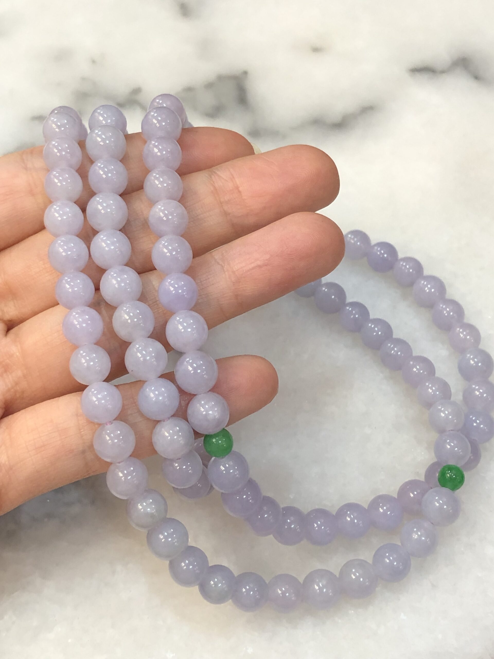 Grade A 108 lavender jadeite beads with a refined sweet lilac-lavender hue display, harmoniously matched from end to end.