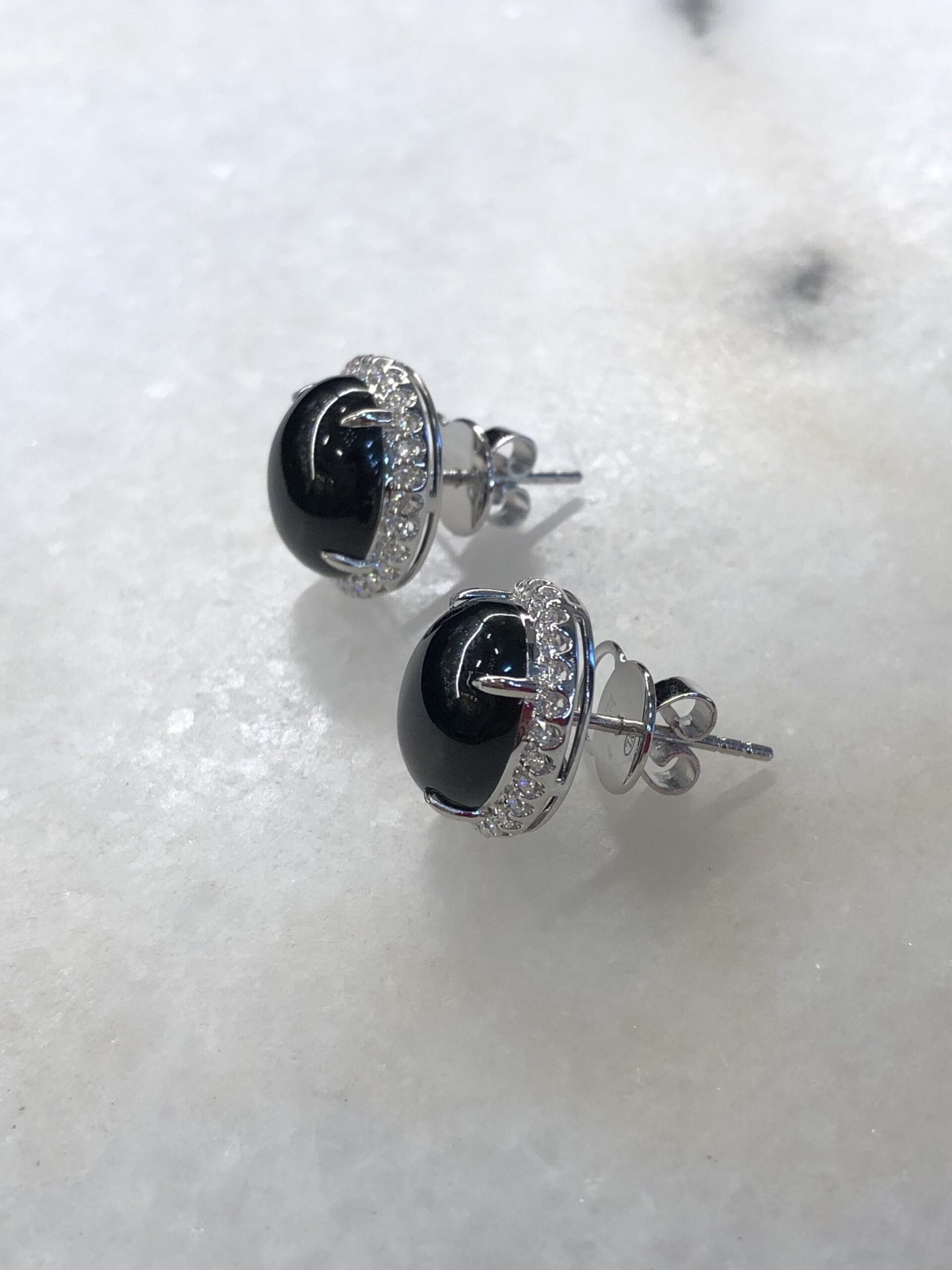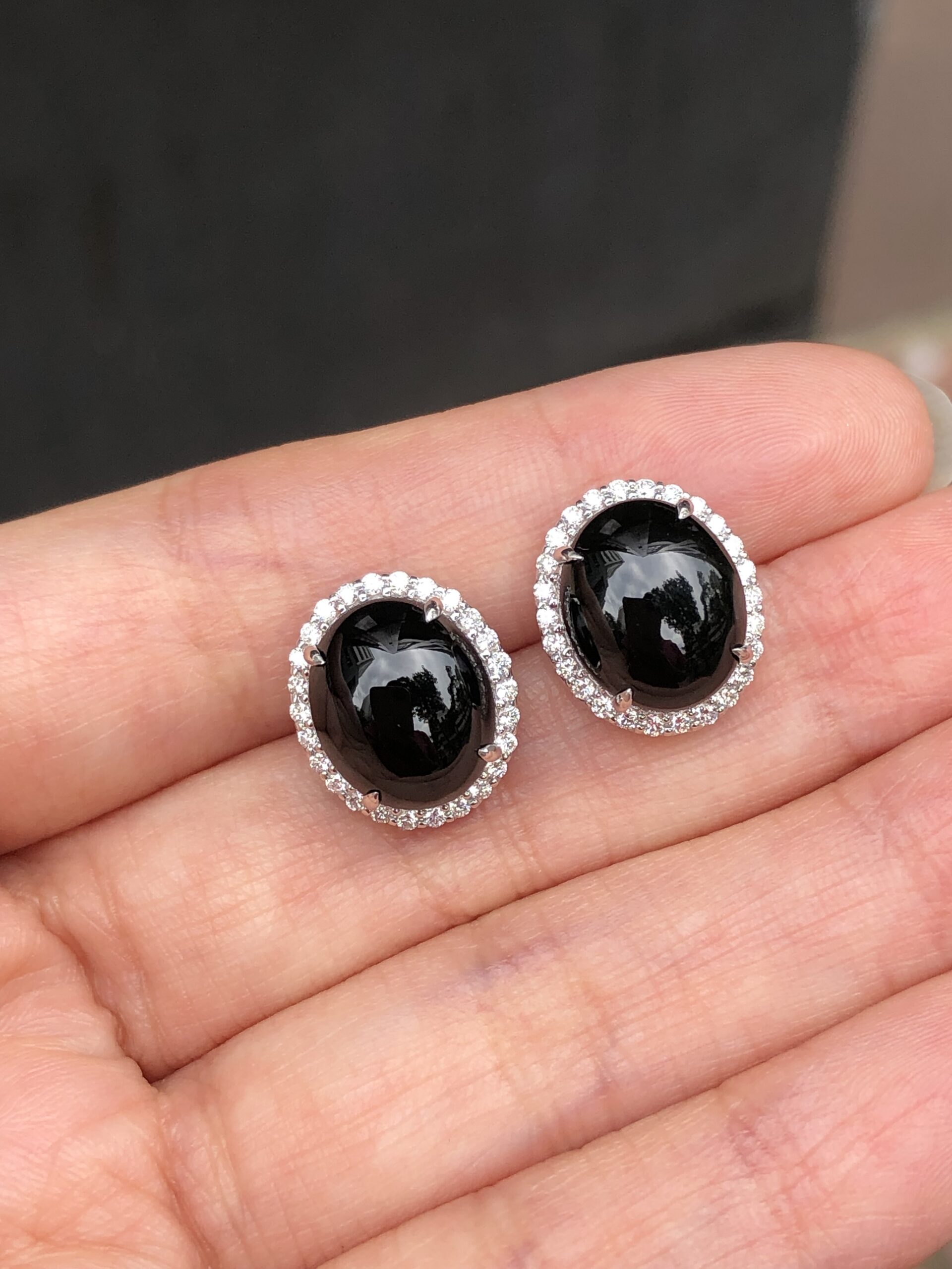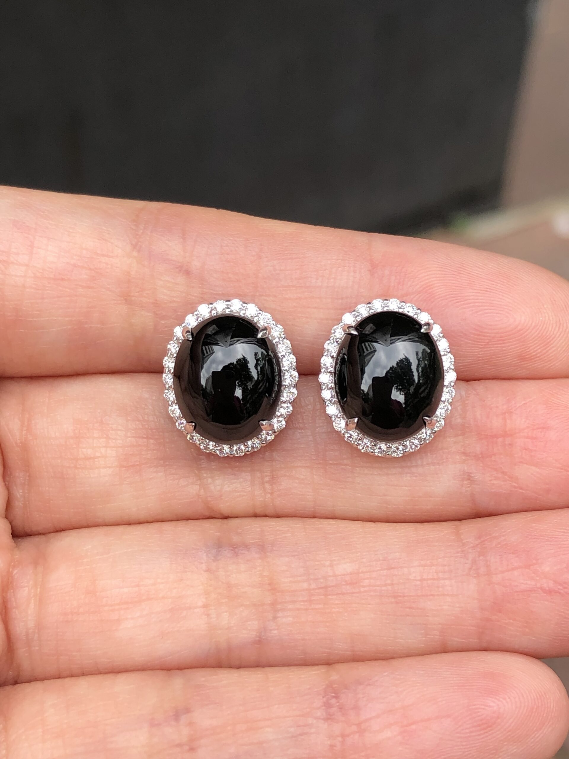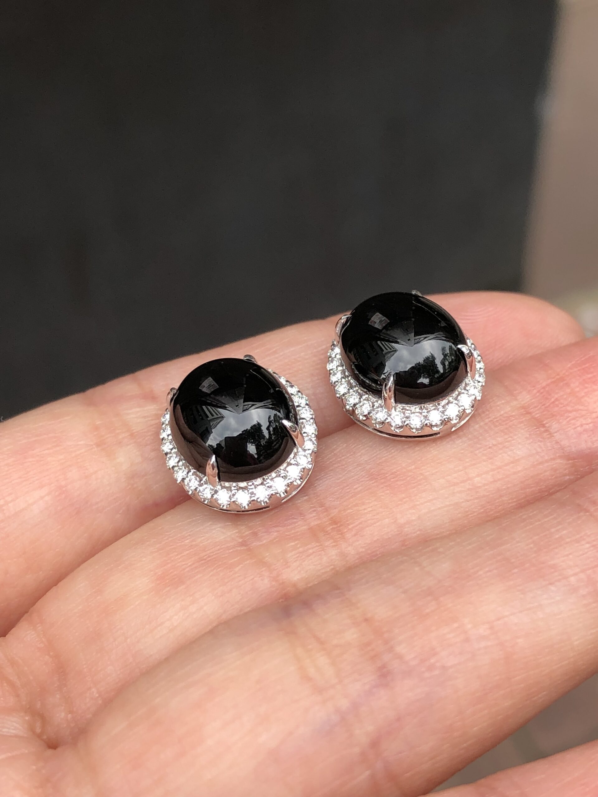 Grade A Mo Cui jade cabochons earrings with great lustre and translucency. The jadeite cabochons appear black, but exhibit a beautiful imperial green hue when shone through a light source. The quality is high with fine jade grains and extremely rich water content, therefore the entire jadeite appears shiny and glossy. Clarity is excellent with no crack lines to note.