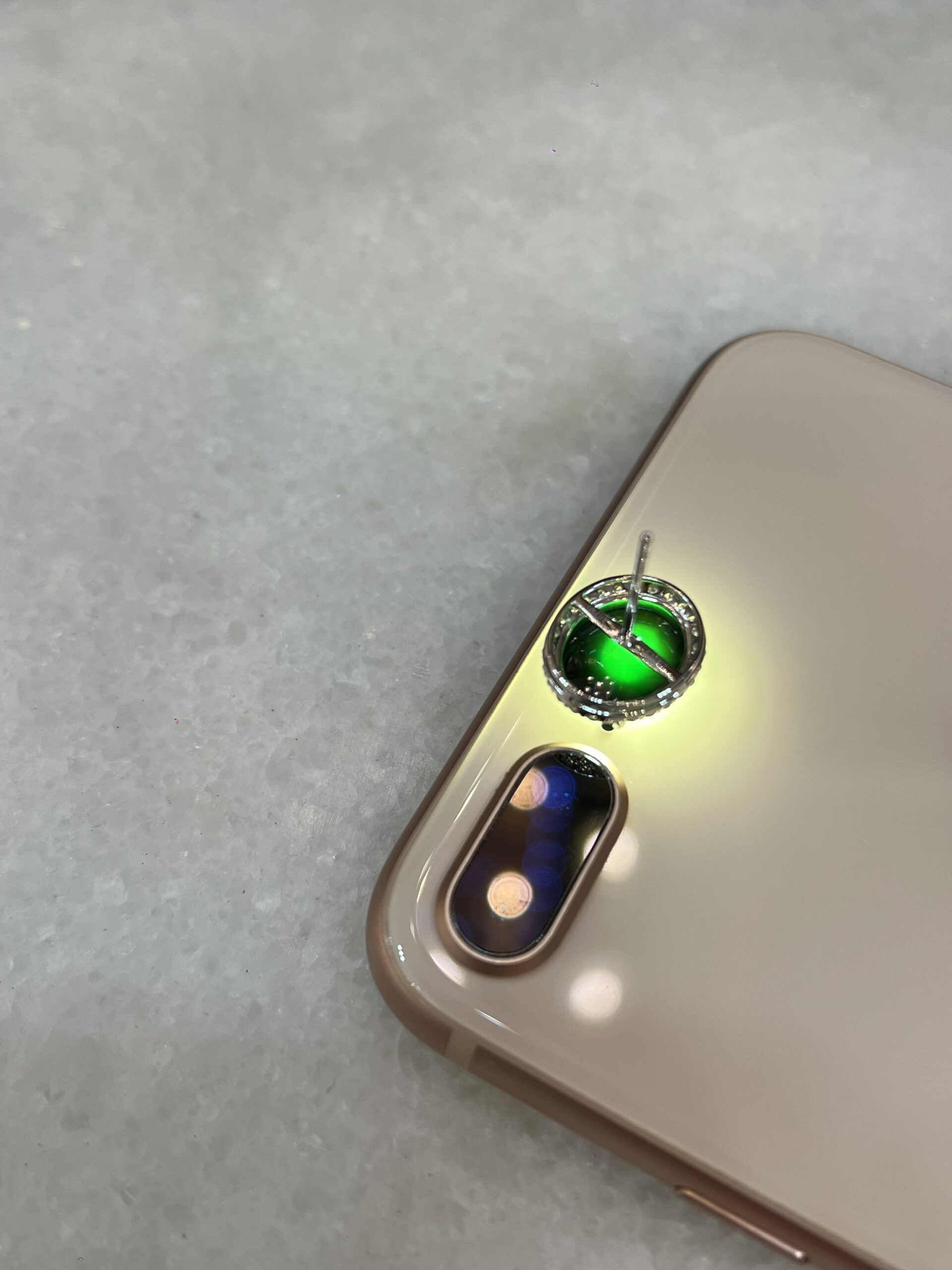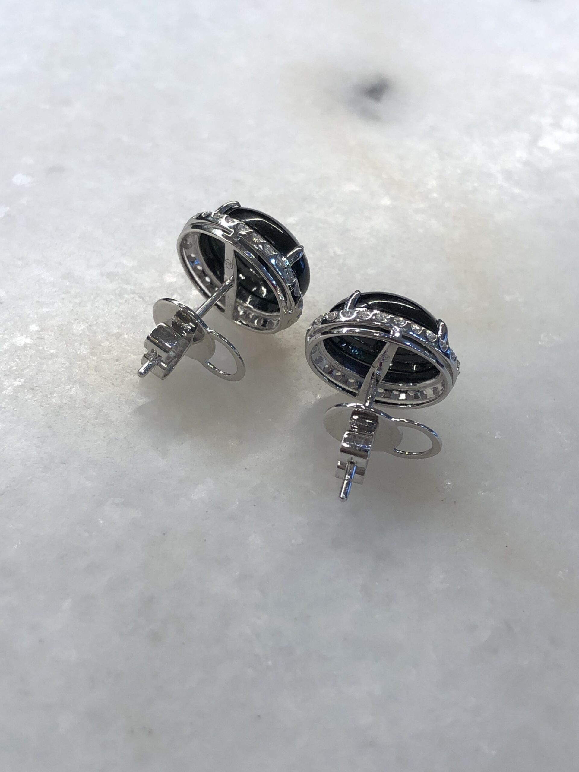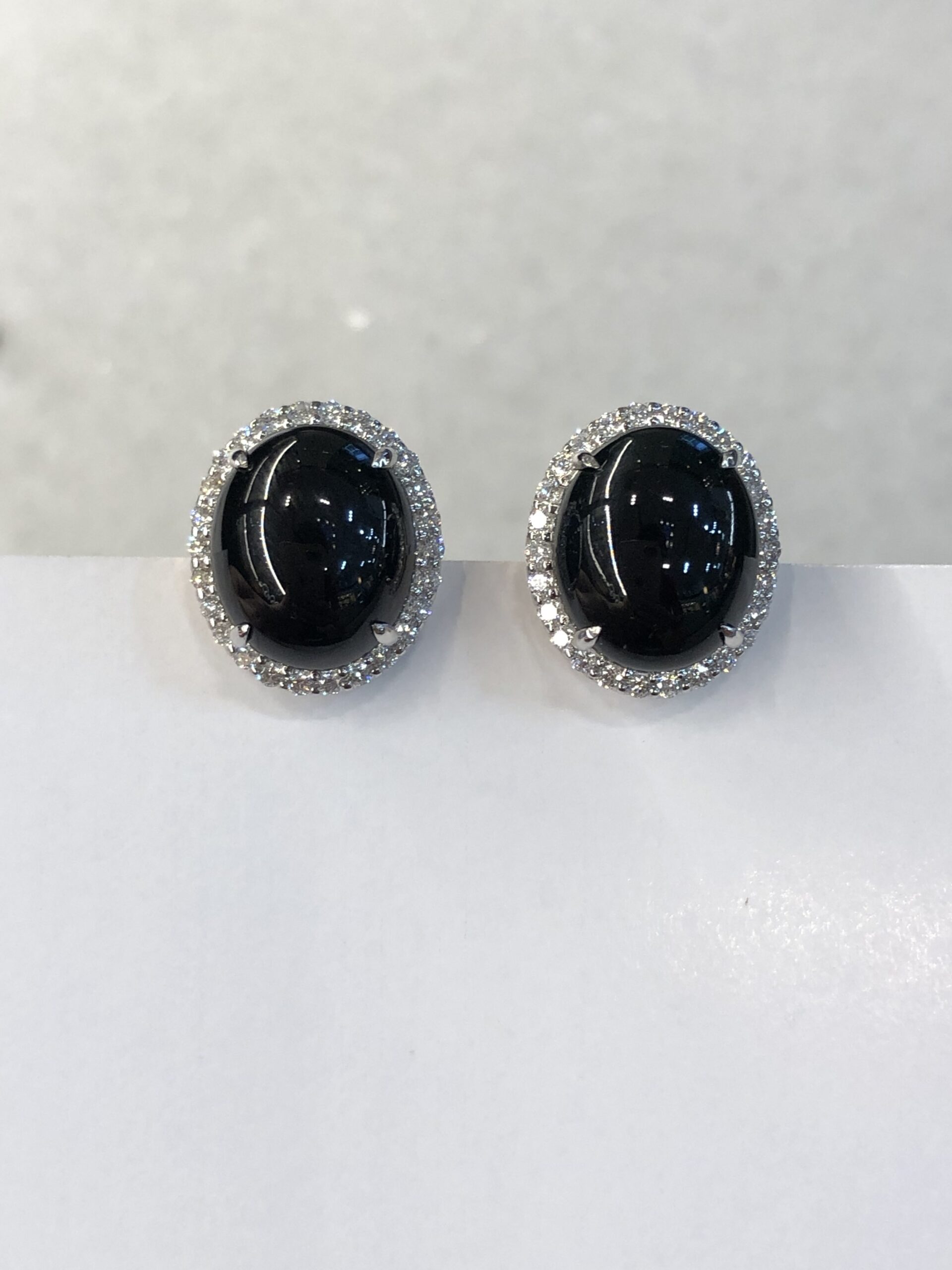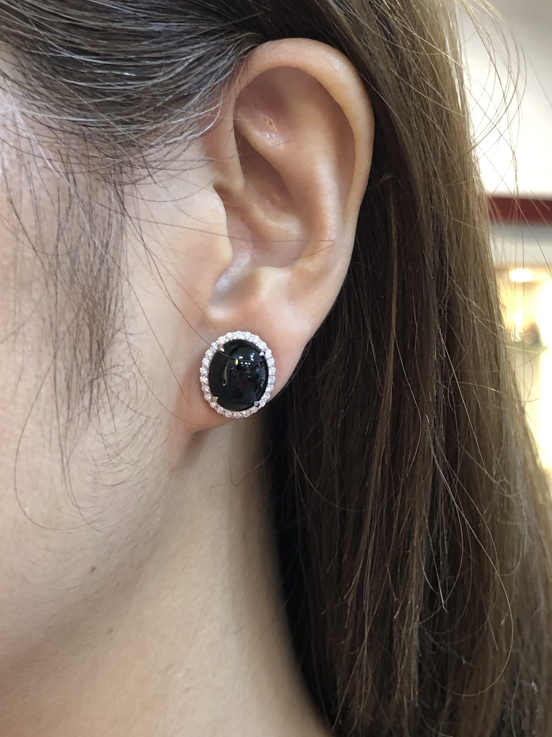 Grade A Mo Cui jade cabochons earrings with great lustre and translucency. The jadeite cabochons appear black, but exhibit a beautiful imperial green hue when shone through a light source. The quality is high with fine jade grains and extremely rich water content, therefore the entire jadeite appears shiny and glossy. Clarity is excellent with no crack lines to note.