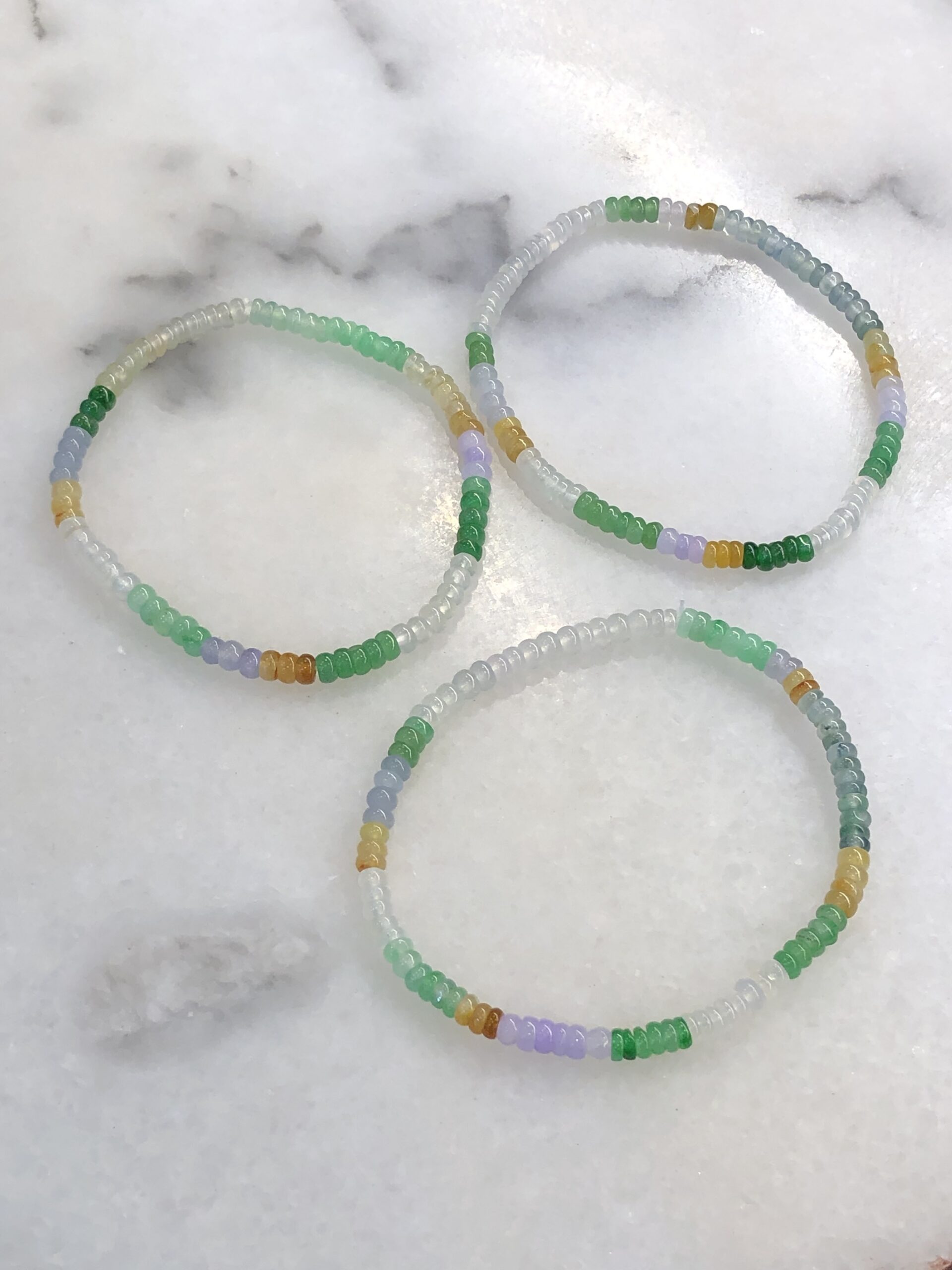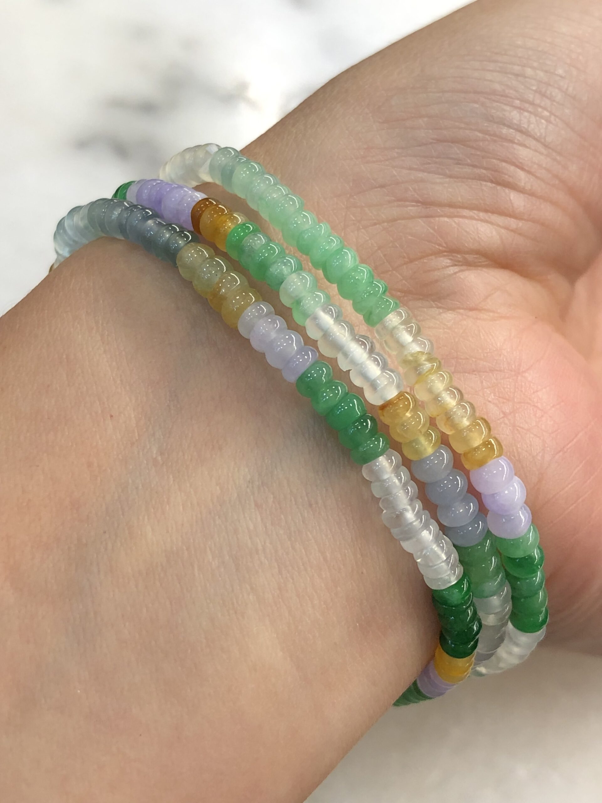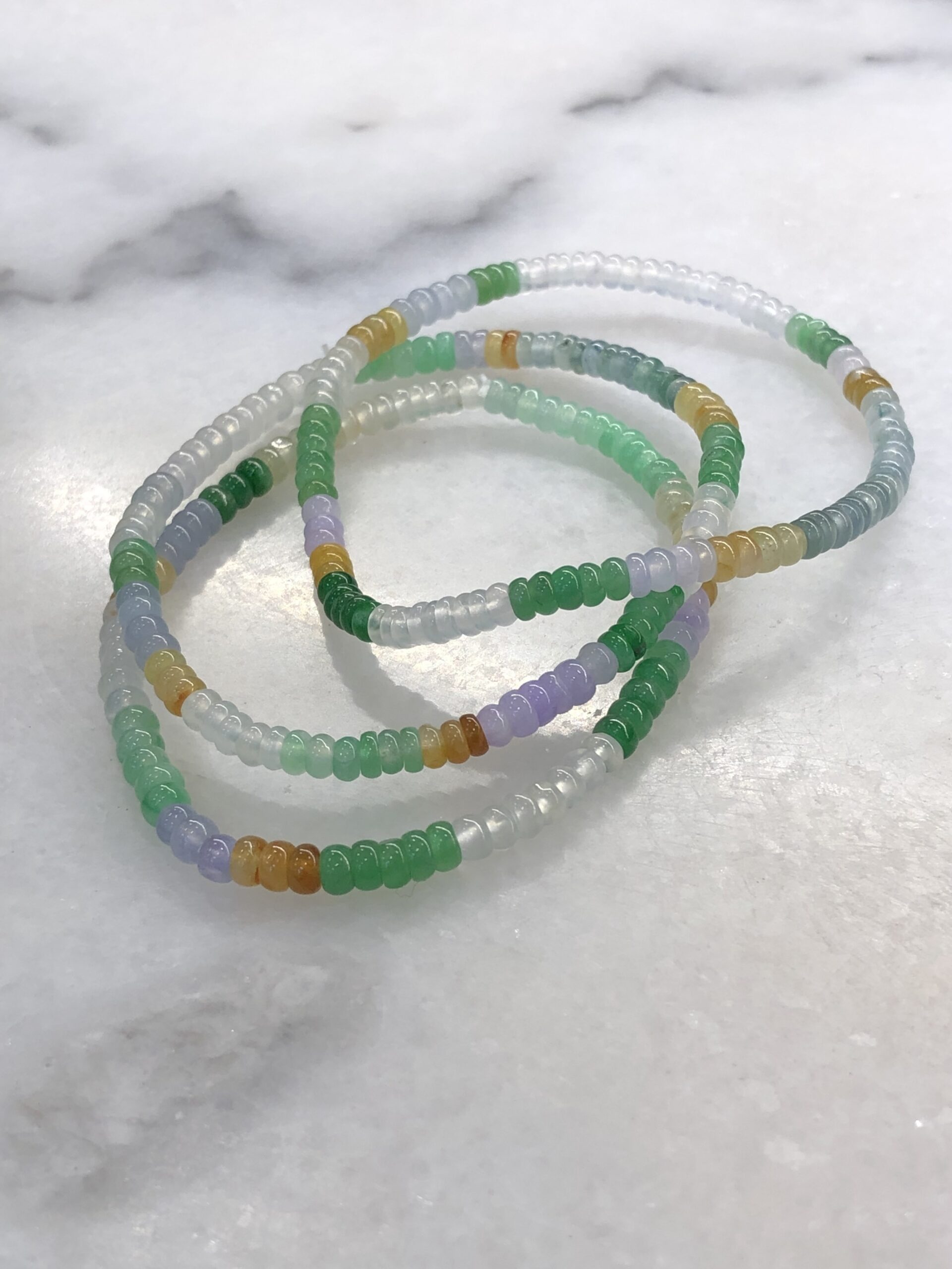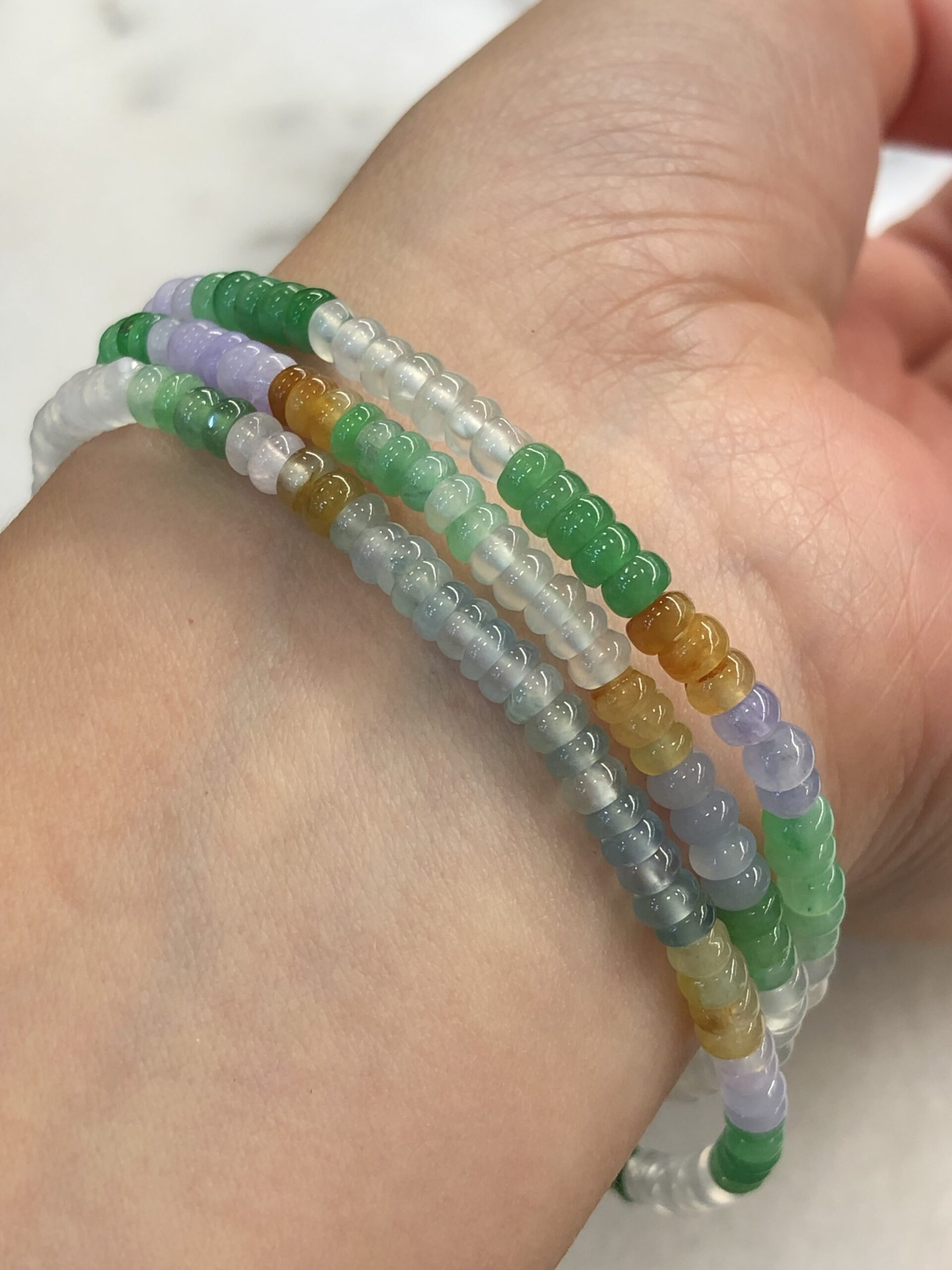 A mesmerizing trio of jade layers showcasing the natural beauty and diversity of this timeless gemstone. Each layer features premium quality jade beads that blend seamlessly from translucent colourless tones to warm honey yellows, radiant oranges, bluish to soft lavender hues, light apple green to rich verdant greens. Each bead is selected for its high translucency, fine texture, and rich water content, giving the bracelet a luminous, radiant appearance. The combination creates a harmonious gradient of colour, symbolizing balance, prosperity, and serenity. Perfectly layered for a luxurious, ethereal look — elegant on its own or stacked with other bangles for a bold, artisanal statement.