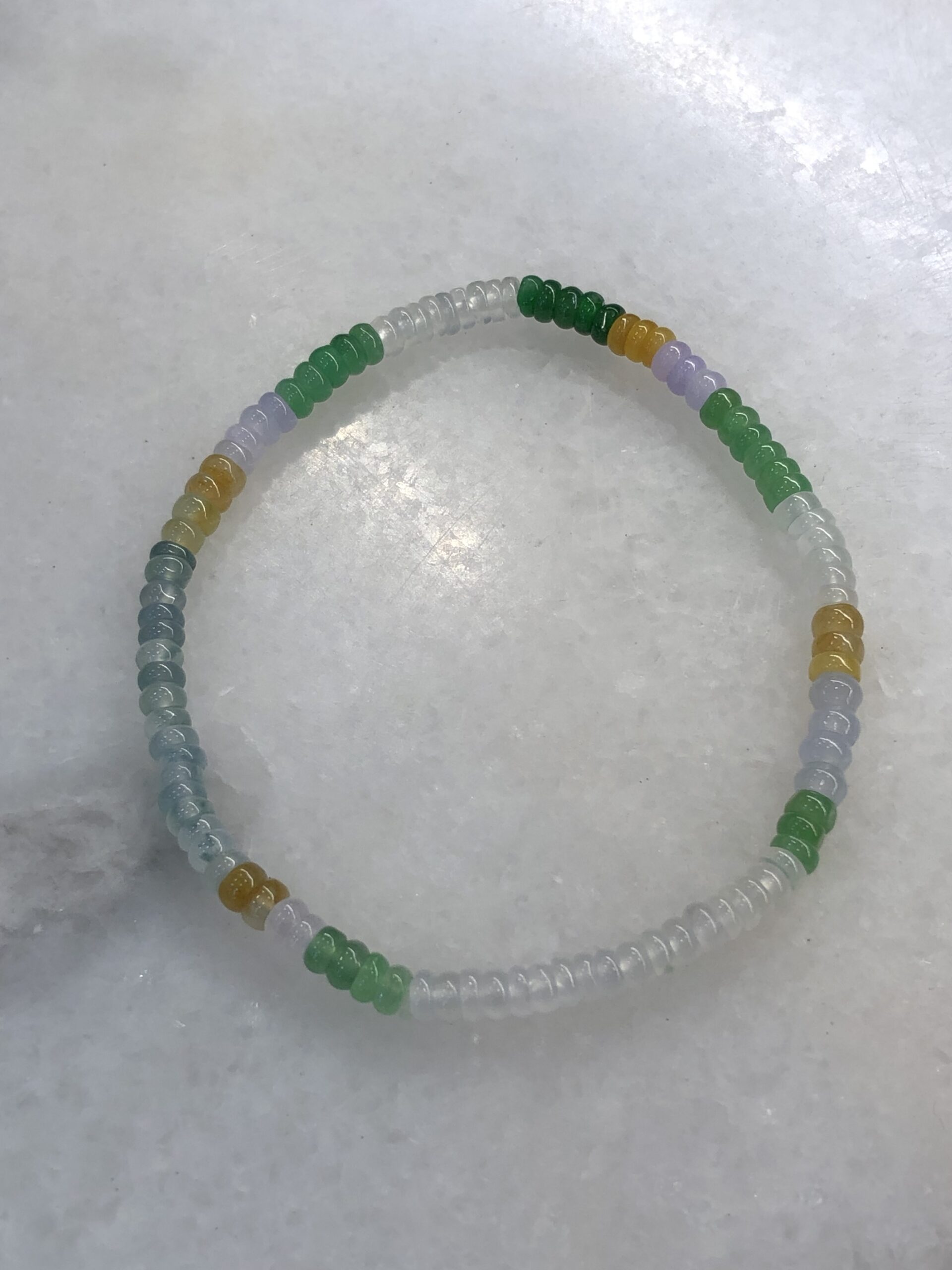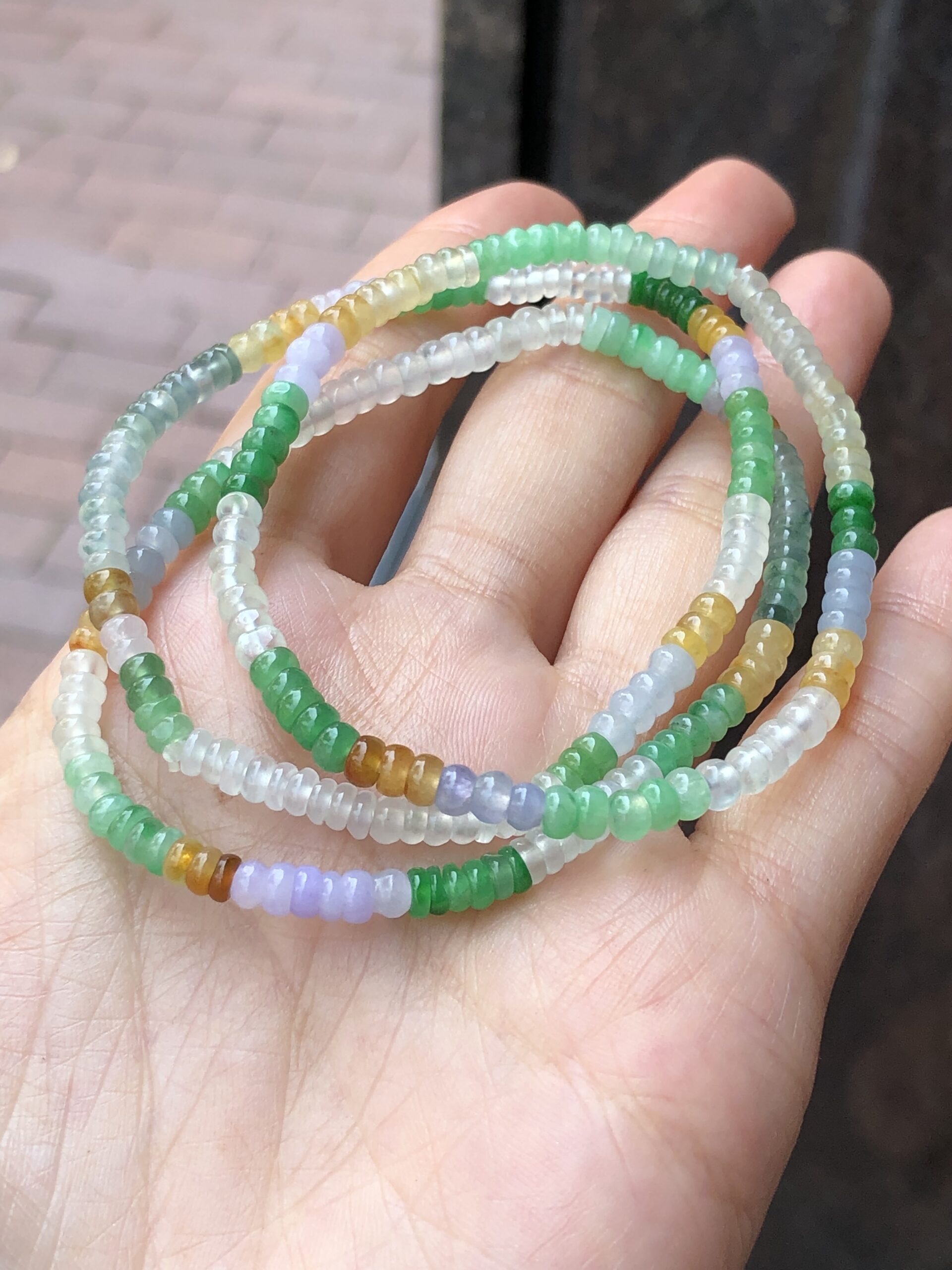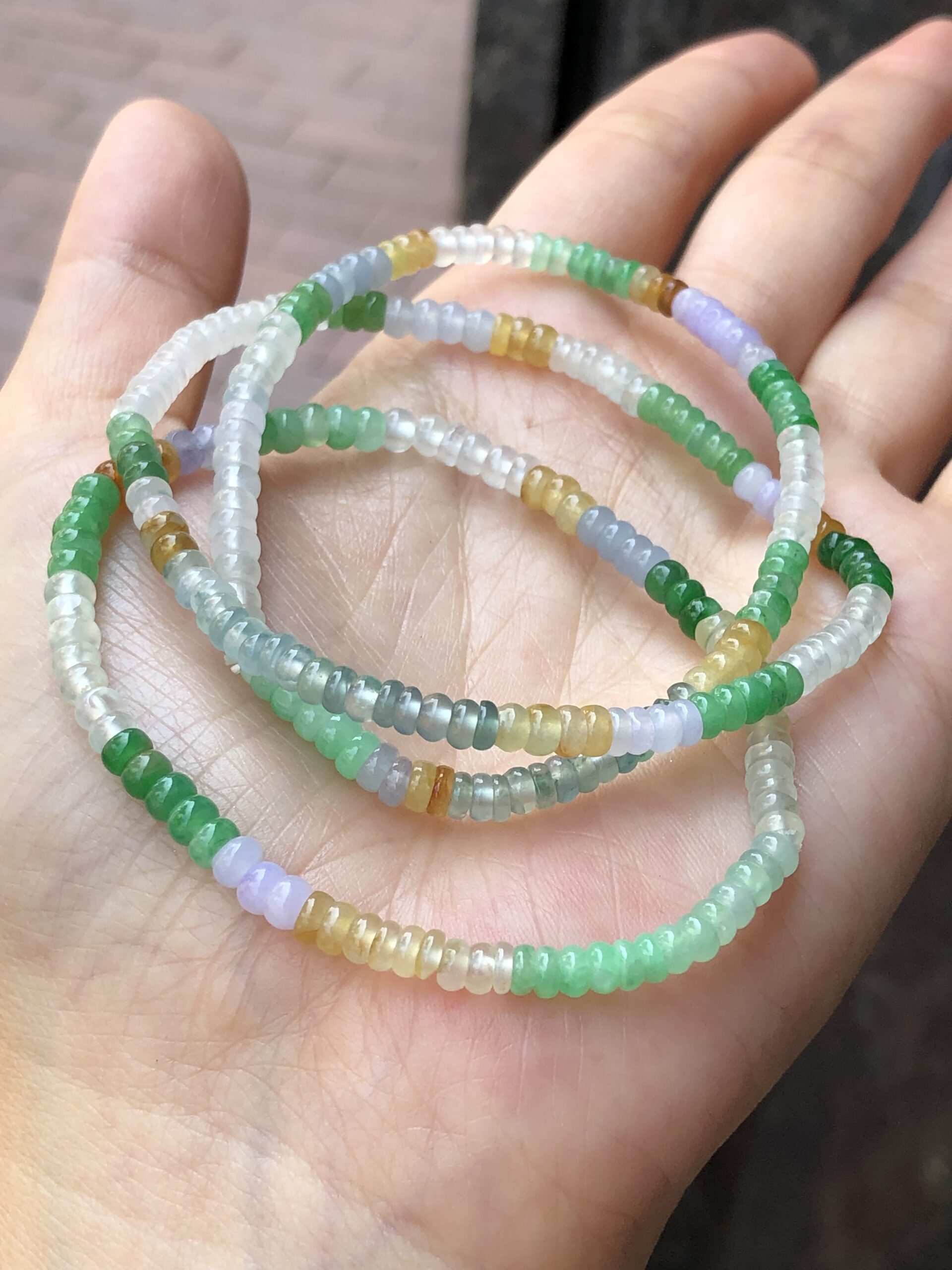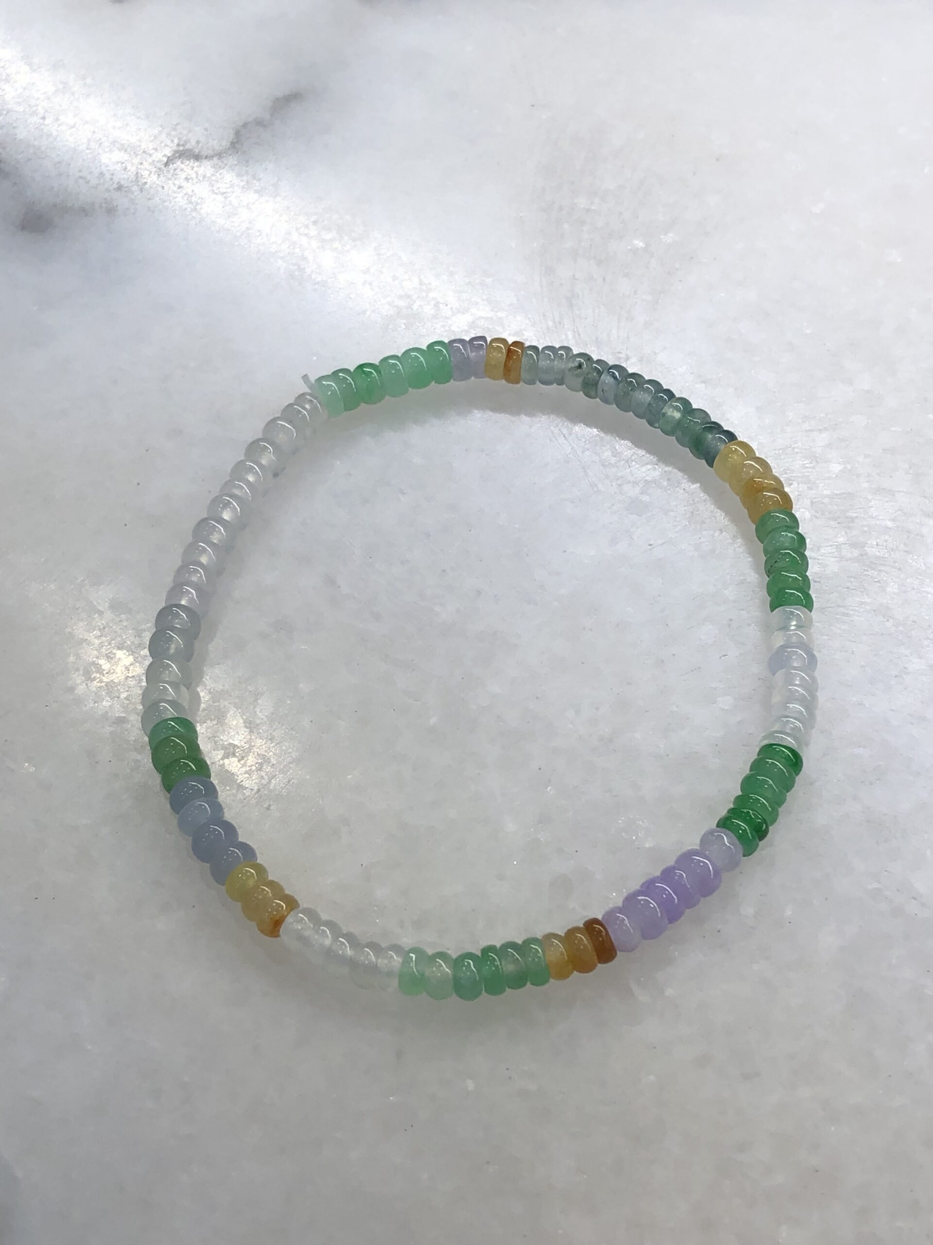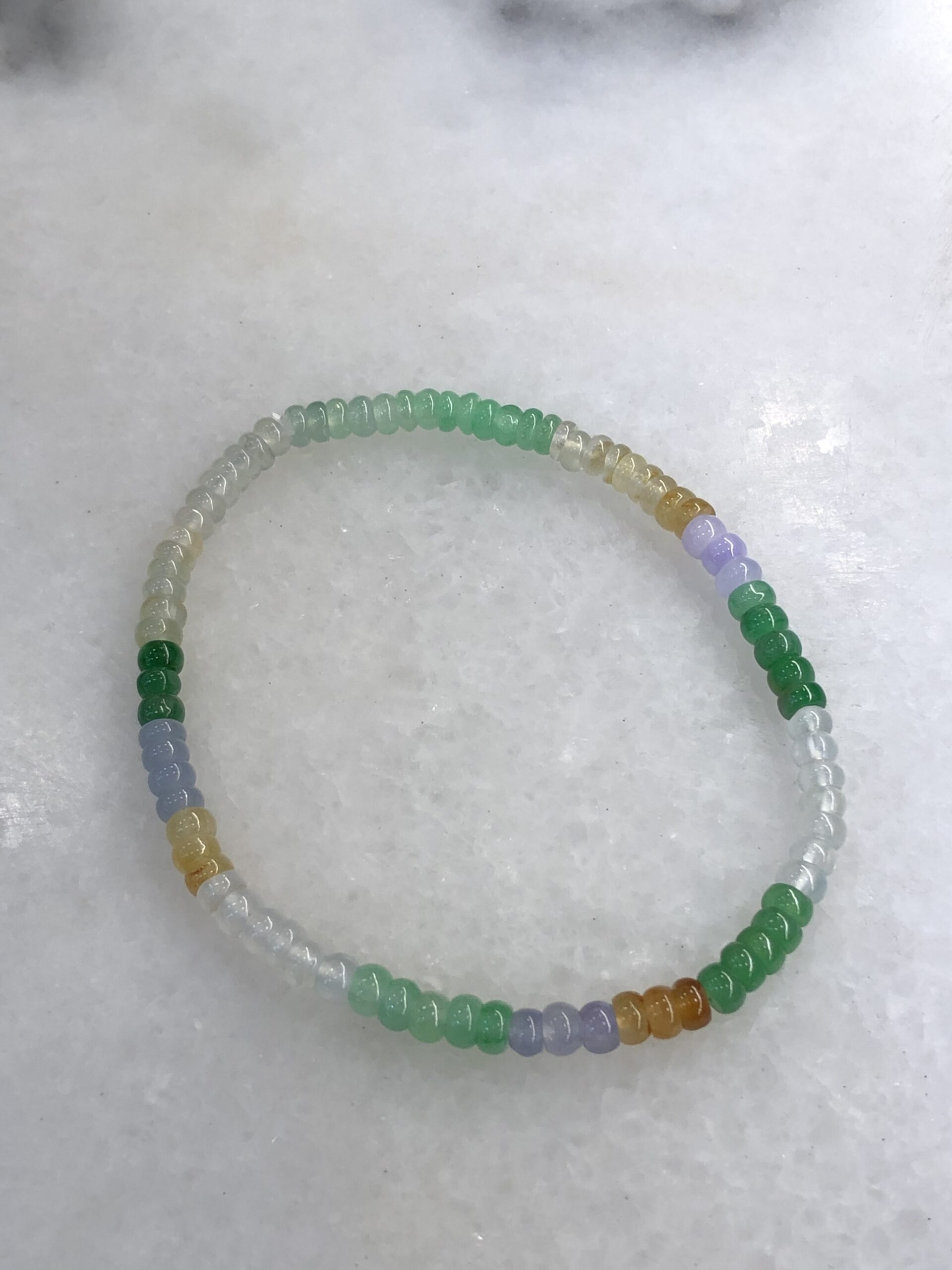 A mesmerizing trio of jade layers showcasing the natural beauty and diversity of this timeless gemstone. Each layer features premium quality jade beads that blend seamlessly from translucent colourless tones to warm honey yellows, radiant oranges, bluish to soft lavender hues, light apple green to rich verdant greens. Each bead is selected for its high translucency, fine texture, and rich water content, giving the bracelet a luminous, radiant appearance. The combination creates a harmonious gradient of colour, symbolizing balance, prosperity, and serenity. Perfectly layered for a luxurious, ethereal look — elegant on its own or stacked with other bangles for a bold, artisanal statement.